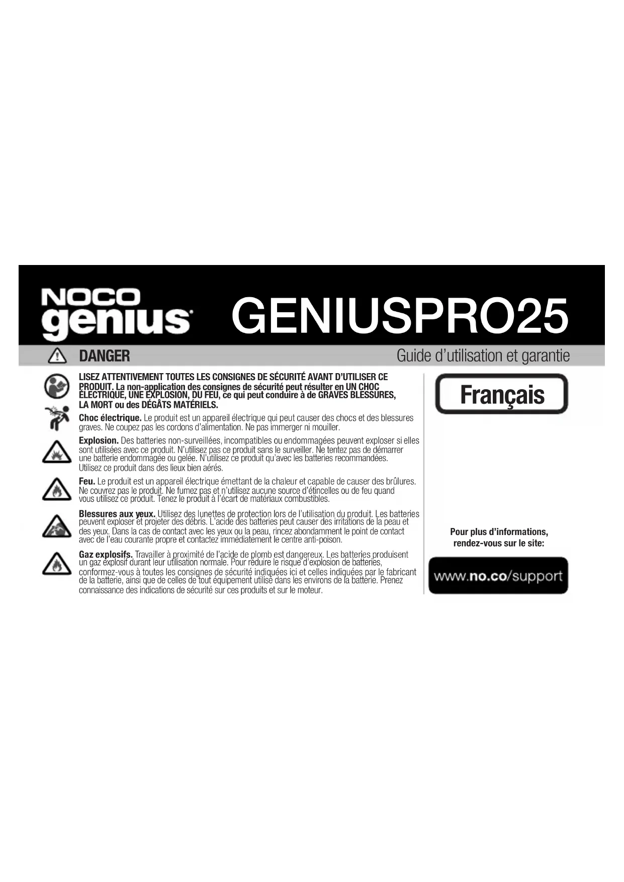 Various -20°C to +50°C IP20 Input Voltage AC: Charging Current: Type of Batteries: Cooling: Output Power: Back Current Drain: Battery Capacity: Weight: Low-Voltage Detection: Battery Chemistries: Dimensions (L x W x H): Charging Voltage: Ambient Temperature: Housing Protection:NOCO Three (3) Year Limited Warranty. IMPORTANT: BY USING THIS PRODUCT, YOU ARE AGREEING TO BE BOUND BY THE TERMS OF THE NOCO THREE (3) YEAR LIMITED WARRANTY («WARRANTY») AS SET OUT BELOW. DO NOT USE THE PRODUCT UNTIL YOU HAVE READ THE TERMS OF THE WARRANTY. IF YOU DO NOT AGREE TO THE TERMS OF THE WARRANTY, DO NOT USE THE PRODUCT AND RETURN IT. THIS WARRANTY GIVES YOU SPECIFIC LEGAL RIGHTS, AND YOU MAY HAVE OTHER RIGHTS THAT VARY FROM STATE, COUNTRY, OR PROVINCE. OTHER THAN AS PERMITTED BY LAW, NOCO DOES NOT EXCLUDE, LIMIT OR SUSPEND OTHER RIGHTS YOU MAY HAVE, INCLUDING THOSE THAT MAY ARISE FROM THE NONCONFORMITY OF A SALES CONTRACT. FOR A FULL UNDERSTANDING OF YOUR RIGHTS, YOU SHOULD CONSULT THE LAWS OF YOUR STATE, COUNTRY, OR PROVINCE. TO THE EXTENT PERMITTED BY LAW, THIS WARRANTY AND THE REMEDIES SET FORTH ARE EXCLUSIVE AND IN LIEU OF ALL OTHER WARRANTIES, REMEDIES, AND CONDITIONS, WHETHER ORAL, WRITTEN, STATUTORY, EXPRESS, OR IMPLIED. NOCO DISCLAIMS ALL STATUTORY AND IMPLIED WARRANTIES, INCLUDING, WITHOUT LIMITATION, WARRANTIES OF MERCHANTABILITY AND FITNESS FOR A PARTICULAR PURPOSE AND WARRANTIES AGAINST HIDDEN OR LATENT DEFECTS, TO THE EXTENT PERMITTED BY LAW. IN SO FAR AS SUCH WARRANTIES CANNOT BE DISCLAIMED, NOCO LIMITS THE DURATION AND REMEDIES OF SUCH WARRANTIES TO THE DURATION OF THIS EXPRESS WARRANTY AND, AT NOCO’S OPTION, THE REPAIR OR REPLACEMENT OF PRODUCTS DESCRIBED BELOW. SOME STATES, COUNTRIES, AND PROVINCES DO NOT ALLOW LIMITATIONS ON HOW LONG AN IMPLIED WARRANTY - OR CONDITION - MAY LAST, SO THE LIMITATION DESCRIBED ABOVE MAY NOT APPLY TO YOU. NOCO warrants the NOCO-branded Products contained in the original packaging (“NOCO Product”) against defects in materials and workmanship when used normally in accordance with NOCO’s published guidelines for a period of THREE (3) YEARS from the date of original retail purchase or delivery date by the end-user purchaser (“Warranty Period”). NOCO’s published guidelines include but are not limited to, the information contained in this Warranty, technical specifications, and user manuals. IN SOME STATES, COUNTRIES, OR PROVINCES, NATIONAL LAW MAY PROVIDE MORE EXTENDED WARRANTY PERIODS. As such, the benefits of the Limited Warranty are intended to supplement, and not replace, the rights provided by consumer protection laws. NOCO’S LIABILITY IS LIMITED TO REPLACEMENT OR REPAIR. NOCO SHALL NOT BE LIABLE FOR ANY SPECIAL, INCIDENTAL, CONSEQUENTIAL, OR EXEMPLARY DAMAGES RESULTING FROM ANY BREACH OF WARRANTY OR CONDITION OR UNDER ANY OTHER LEGAL THEORY, INCLUDING, BUT NOT LIMITED TO, LOST PROFITS, LOST REVENUE, LOST BUSINESS, PROPERTY DAMAGE, PERSONAL INJURY, OR ANY INDIRECT OR CONSEQUENTIAL LOSS OR DAMAGE HOWSOEVER. This Warranty is non-transferable and does not cover return packaging and transportation costs. This Warranty does not apply: (a) to damage caused by accident, abuse, misuse, fire, liquid contact, or other external cause, (b) mishandling, improper installation, modifications, disassembly, or attempted unauthorized repair, (c) cosmetic damage - such as dents or scratches - that doesn’t aect the functionality of the Product, (d) to damage caused by operating the Product outside NOCO’s published guidelines, (e) to defects caused by normal wear and tear or otherwise due to the normal aging of the Product, or (f) if any serial number has been removed or defaced from the Product.EN If, during the Warranty Period, you submit a claim, NOCO will, at its option: (a) repair the Product that has been tested and passed our functional requirements, (b) replace the Product with a replacement product of the same model (or with your consent a product that has the same or substantially similar features as the original Product – e.g., a dierent model with the same features), that is new or like-new and has been tested and passed our functional requirements, or (c) exchange the Product for a refund of your purchase price. We require certain information, including proof of purchase, to process Limited Warranty claims. To make a claim under the Limited Warranty, please get in touch with NOCO Support at: (Web) (Email) (US/CA/MX) https://no.co/support support@no.co +1.800.456.6626 (UK) (EU) (AU) (JP) +44 20 4520 7738 +31 20 214 0047 +61 2 4062 0068 +81 3 6893 3017GENIUSPRO25 Guide d’utilisation et garantie DANGER LISEZ ATTENTIVEMENT TOUTES LES CONSIGNES DE SÉCURITÉ AVANT D’UTILISER CE PRODUIT. La non-application des consignes de sécurité peut résulter en UN CHOC ÉLECTRIQUE, UNE EXPLOSION, DU FEU, ce qui peut conduire à de GRAVES BLESSURES, LA MORT ou des DÉGÂTS MATÉRIELS. Choc électrique. Le produit est un appareil électrique qui peut causer des chocs et des blessures graves. Ne coupez pas les cordons d’alimentation. Ne pas immerger ni mouiller. Explosion. Des batteries non-surveillées, incompatibles ou endommagées peuvent exploser si elles sont utilisées avec ce produit. N’utilisez pas ce produit sans le surveiller. Ne tentez pas de démarrer une batterie endommagée ou gelée. N’utilisez ce produit qu’avec les batteries recommandées. Utilisez ce produit dans des lieux bien aérés. Feu. Le produit est un appareil électrique émettant de la chaleur et capable de causer des brûlures. Ne couvrez pas le produit. Ne fumez pas et n’utilisez aucune source d’étincelles ou de feu quand vous utilisez ce produit. Tenez le produit à l’écart de matériaux combustibles. Blessures aux yeux. Utilisez des lunettes de protection lors de l’utilisation du produit. Les batteries peuvent exploser et projeter des débris. L’acide des batteries peut causer des irritations de la peau et des yeux. Dans la cas de contact avec les yeux 