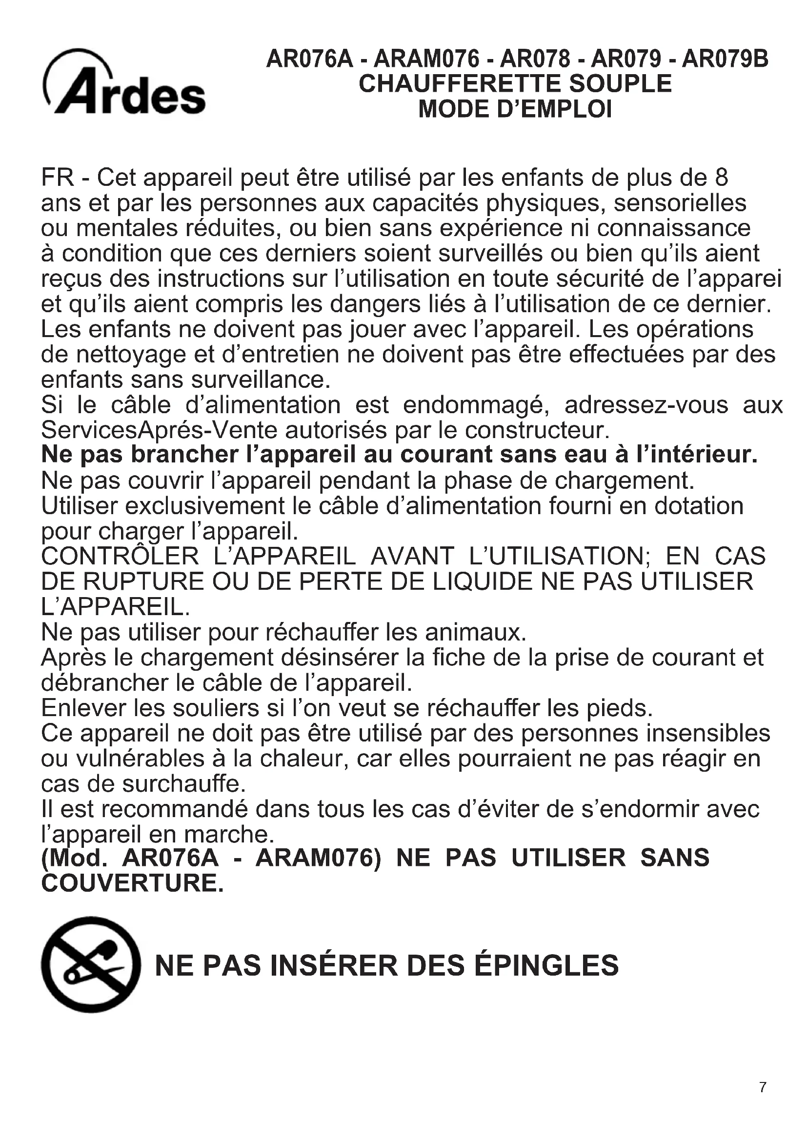 AR079B - Couverture/coussin chauffant ARDES - Notice d'utilisation et mode d'emploi gratuit