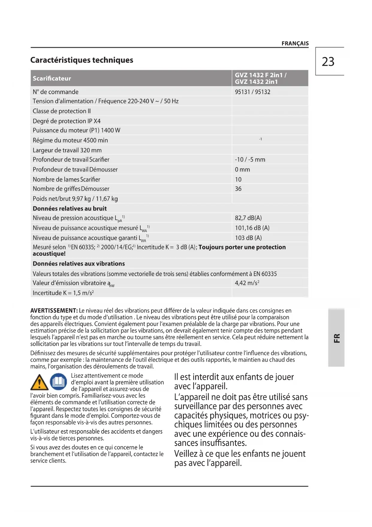 Caractéristiques techniques Scaricateur GVZ 1432 F 2in1 / GVZ 1432 2in1 N° de commande 95131 / 95132 Tension d‘alimentation / Fréquence 220-240 V ~ / 50 Hz Classe de protection II Degré de protection IP X4 Puissance du moteur (P1) 1400 W Régime du moteur 4500 min