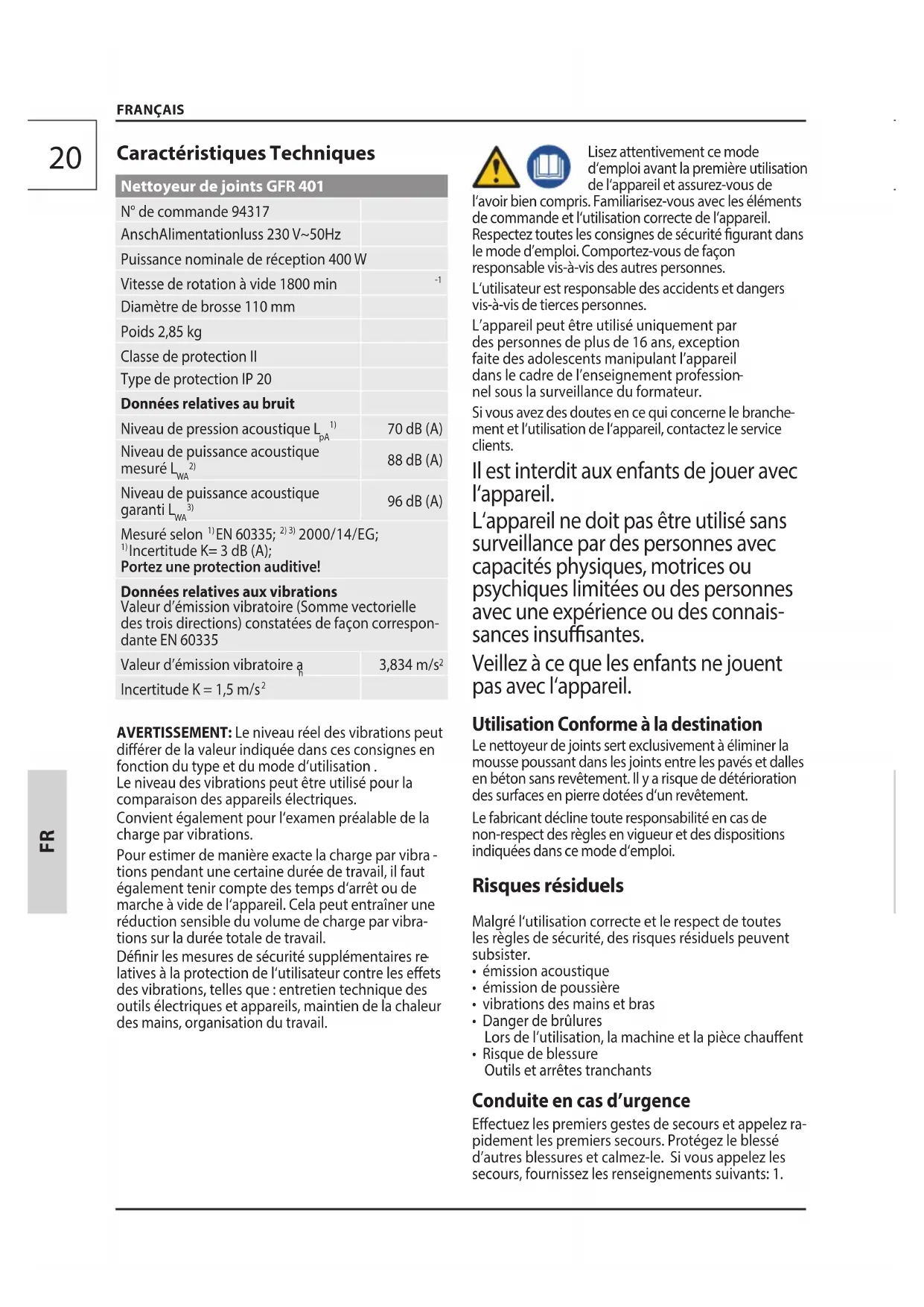 Caractéristiques Techniques Nettoyeur de joints GFR 401 N° de commande 94317 AnschAlimentationluss 230 V~50Hz Puissance nominale de réception 400 W Vitesse de rotation à vide 1800 min