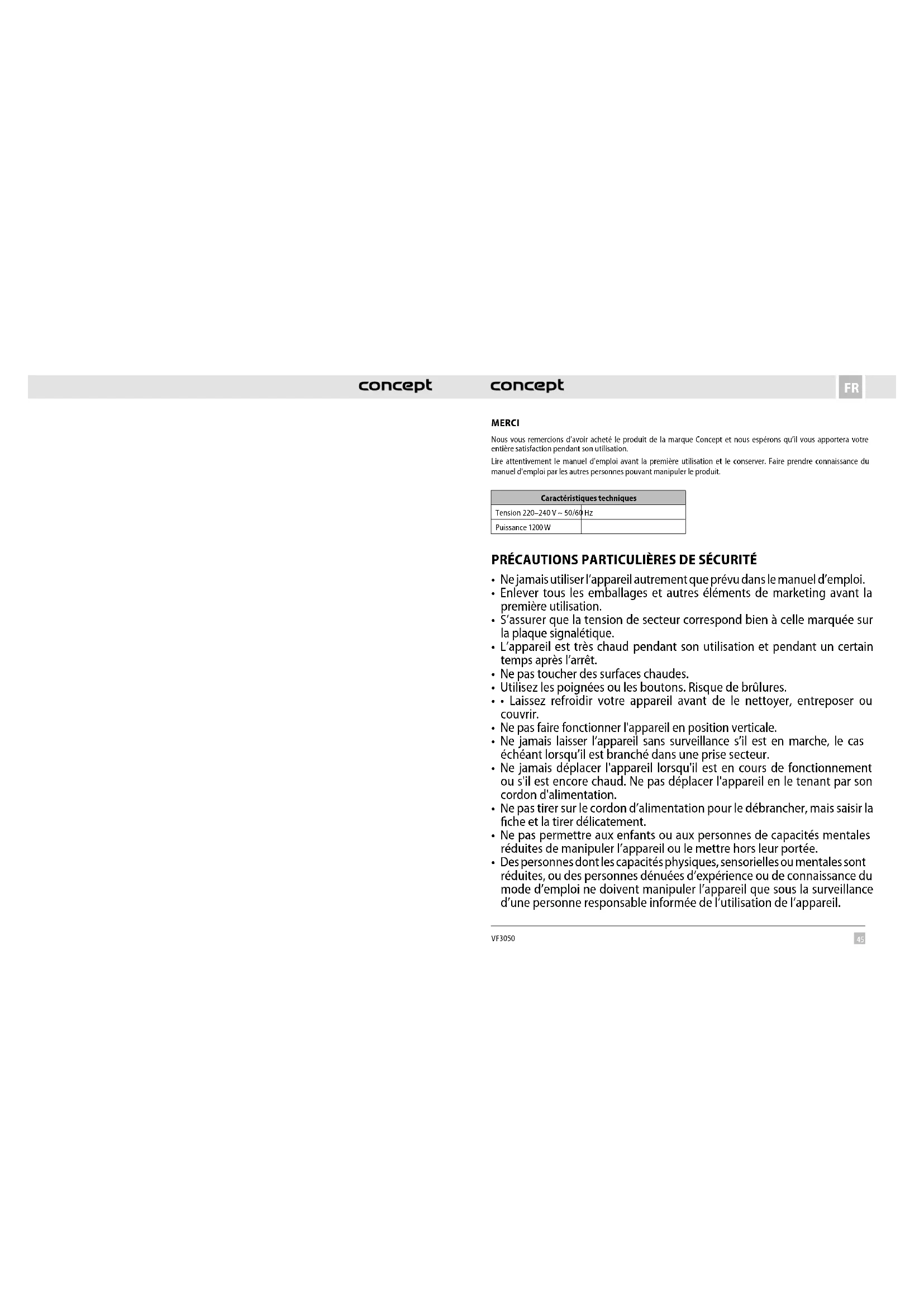 VF3050 MERCI Nous vous remercions d’avoir acheté le produit de la marque Concept et nous espérons qu’il vous apportera votre entière satisfaction pendant son utilisation. Lire attentivement le manuel d’emploi avant la première utilisation et le conserver. Faire prendre connaissance du manuel d’emploi par les autres personnes pouvant manipuler le produit. Caractéristiques techniques Tension 220–240 V ~ 50/60 Hz Puissance 1200 W PRÉCAUTIONS PARTICULIÈRES DE SÉCURITÉ