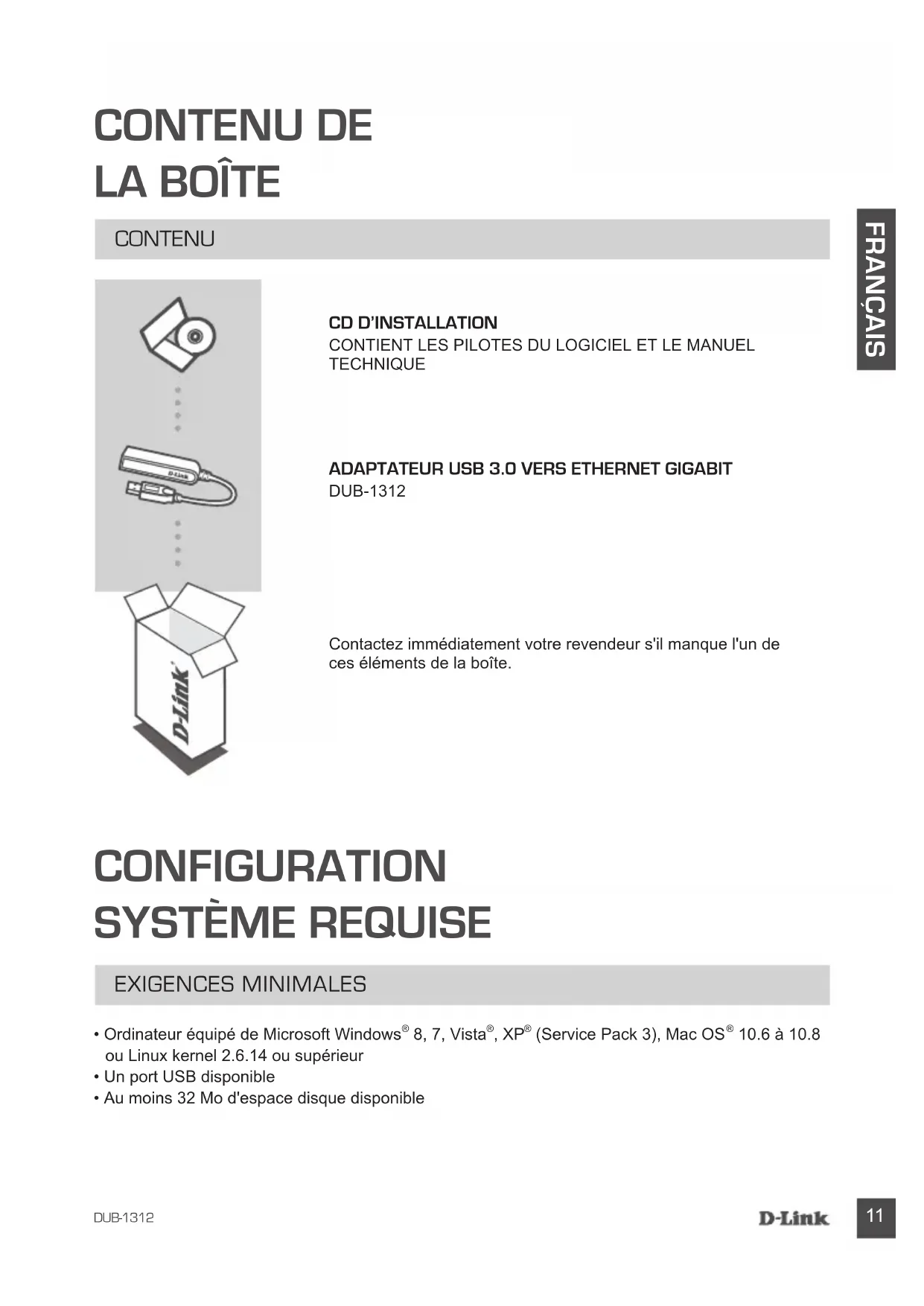 CONTIENT LES PILOTES DU LOGICIEL ET LE MANUEL TECHNIQUE ADAPTATEUr USB 3.0 VErS EThErNET GIGABIT DUB-1312 CONTENU Contactez immédiatement votre revendeur s'il manque l'un de ces éléments de la boîte. EXIGENCES MINIMALESDUB-1312