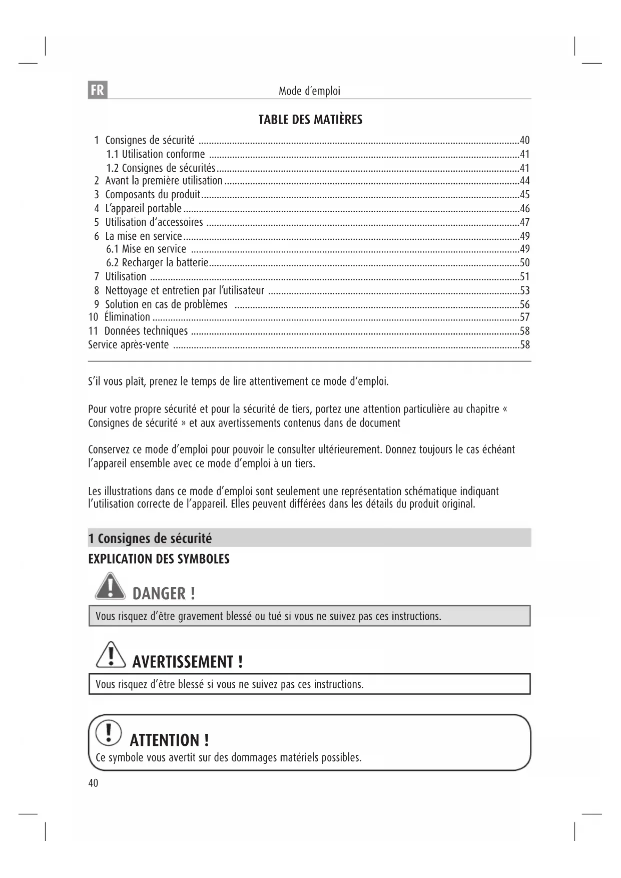 DANGER ! Vous risquez d’être gravement blessé ou tué si vous ne suivez pas ces instructions. AVERTISSEMENT ! Vous risquez d’être blessé si vous ne suivez pas ces instructions. ATTENTION ! Ce symbole vous avertit sur des dommages matériels possibles.41 Mode d´emploi