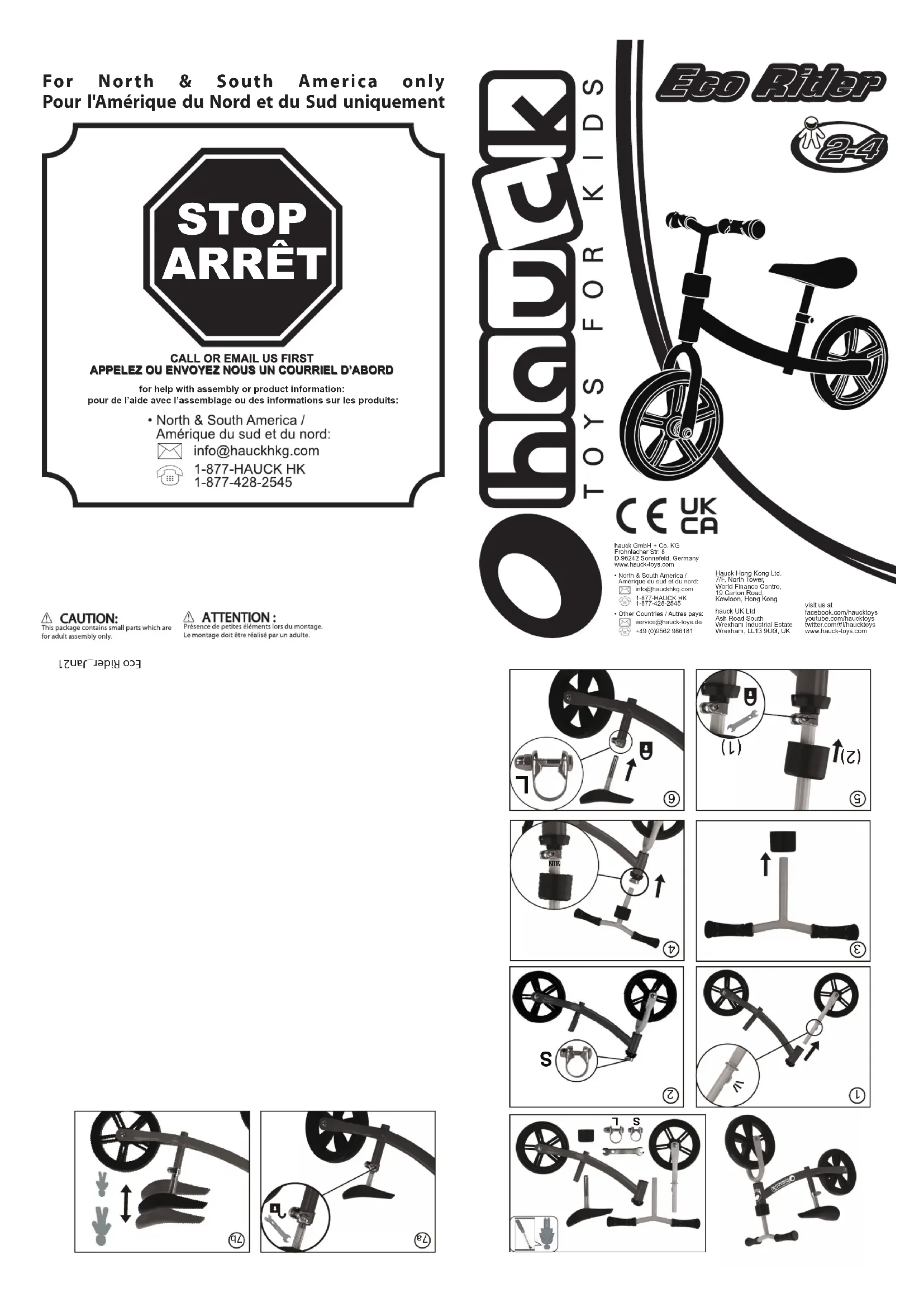 STOP ARRÊT APPELEZ OU ENVOYEZ NOUS UN COURRIEL D’ABORD For Nor th & South America only Pour l'Amérique du Nord et du Sud uniquement for help with assembly or product information: pour de l’aide avec l’assemblage ou des informations sur les produits:WARNING: ENG