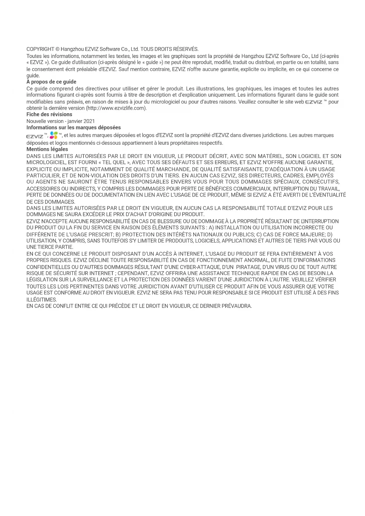 COPYRIGHT © Hangzhou EZVIZ Software Co., Ltd. TOUS DROITS RÉSERVÉS. Toutes les informations, notamment les textes, les images et les graphiques sont la propriété de Hangzhou EZVIZ Software Co., Ltd (ci-après «EZVIZ»). Ce guide d'utilisation (ci-après désigné le «guide ») ne peut être reproduit, modifié, traduit ou distribué, en partie ou en totalité, sans le consentement écrit préalable d’EZVIZ. Sauf mention contraire, EZVIZ n’offre aucune garantie, explicite ou implicite, en ce qui concerne ce guide. À propos de ce guide Ce guide comprend des directives pour utiliser et gérer le produit. Les illustrations, les graphiques, les images et toutes les autres informations figurant ci-après sont fournis à titre de description et d’explication uniquement. Les informations figurant dans le guide sont modifiables sans préavis, en raison de mises à jour du micrologiciel ou pour d’autres raisons. Veuillez consulter le site web ™ pour obtenir la dernière version (http://www.ezvizlife.com). Fiche des révisions Nouvelle version - janvier 2021 Informations sur les marques déposées ™, ™, et les autres marques déposées et logos d’EZVIZ sont la propriété d’EZVIZ dans diverses juridictions. Les autres marques déposées et logos mentionnés ci-dessous appartiennent à leurs propriétaires respectifs. Mentions légales DANS LES LIMITES AUTORISÉES PAR LE DROIT EN VIGUEUR, LE PRODUIT DÉCRIT, AVEC SON MATÉRIEL, SON LOGICIEL ET SON MICROLOGICIEL, EST FOURNI «TEL QUEL», AVEC TOUS SES DÉFAUTS ET SES ERREURS, ET EZVIZ N’OFFRE AUCUNE GARANTIE, EXPLICITE OU IMPLICITE, NOTAMMENT DE QUALITÉ MARCHANDE, DE QUALITÉ SATISFAISANTE, D’ADÉQUATION À UN USAGE PARTICULIER, ET DE NON-VIOLATION DES DROITS D’UN TIERS. EN AUCUN CAS EZVIZ, SES DIRECTEURS, CADRES, EMPLOYÉS OU AGENTS NE SAURONT ÊTRE TENUS RESPONSABLES ENVERS VOUS POUR TOUS DOMMAGES SPÉCIAUX, CONSÉCUTIFS, ACCESSOIRES OU INDIRECTS, Y COMPRIS LES DOMMAGES POUR PERTE DE BÉNÉFICES COMMERCIAUX, INTERRUPTION DU TRAVAIL, PERTE DE DONNÉES OU DE DOCUMENTATION EN LIEN AVEC L’USAGE DE CE PRODUIT, MÊME SI EZVIZ A ÉTÉ AVERTI DE L’ÉVENTUALITÉ DE CES DOMMAGES. DANS LES LIMITES AUTORISÉES PAR LE DROIT EN VIGUEUR, EN AUCUN CAS LA RESPONSABILITÉ TOTALE D’EZVIZ POUR LES DOMMAGES NE SAURA EXCÉDER LE PRIX D’ACHAT D'ORIGINE DU PRODUIT. EZVIZ N'ACCEPTE AUCUNE RESPONSABILITÉ EN CAS DE BLESSURE OU DE DOMMAGE À LA PROPRIÉTÉ RÉSULTANT DE L'INTERRUPTION DU PRODUIT OU LA FIN DU SERVICE EN RAISON DES ÉLÉMENTS SUIVANTS: A) INSTALLATION OU UTILISATION INCORRECTE OU DIFFÉRENTE DE L’USAGE PRESCRIT; B) PROTECTION DES INTÉRÊTS NATIONAUX OU PUBLICS; C) CAS DE FORCE MAJEURE; D) UTILISATION, Y COMPRIS, SANS TOUTEFOIS S’Y LIMITER DE PRODOUITS, LOGICIELS, APPLICATIONS ET AUTRES DE TIERS PAR VOUS OU UNE TIERCE PARTIE. EN CE QUI CONCERNE LE PRODUIT DISPOSANT D’UN ACCÈS À INTERNET, L’USAGE DU PRODUIT SE FERA ENTIÈREMENT À VOS PROPRES RISQUES. EZVIZ DÉCLINE TOUTE RESPONSABILITÉ EN CAS DE FONCTIONNEMENT ANORMAL, DE FUITE D’INFORMATIONS CONFIDENTIELLES OU D’AUTRES DOMMAGES RÉSULTANT D’UNE CYBER-ATTAQUE, D’UN PIRATAGE, D’UN VIRUS OU DE TOUT AUTRE RISQUE DE SÉCURITÉ SUR INTERNET; CEPENDANT, EZVIZ OFFRIRA UNE ASSISTANCE TECHNIQUE RAPIDE EN CAS DE BESOIN.LA LÉGISLATION SUR LA SURVEILLANCE ET LA PROTECTION DES DONNÉES VARIENT D’UNE JURIDICTION À L’AUTRE. VEUILLEZ VÉRIFIER TOUTES LES LOIS PERTINENTES DANS VOTRE JURIDICTION AVANT D’UTILISER CE PRODUIT AFIN DE VOUS ASSURER QUE VOTRE USAGE EST CONFORME AU DROIT EN VIGUEUR. EZVIZ NE SERA PAS TENU POUR RESPONSABLE SI CE PRODUIT EST UTILISÉ À DES FINS ILLÉGITIMES. EN CAS DE CONFLIT ENTRE CE QUI PRÉCÈDE ET LE DROIT EN VIGUEUR, CE DERNIER PRÉVAUDRA.Table des matières Aperçu 1 1 Contenu de l’emballage 1 2 Notions élémentaires 1 Caractéristiques techniques 2 Indicateur de la qualité de l’air 2 Panneau de contrôle 2 Installation 3 Dépannage 41 Aperçu 1 Contenu de l’emballage Purificateur d’air (x1) Guide de démarrage rapide (x1) Informations réglementaires (x1) 2 Notions élémentaires Couvercle inférieur Filtre Entrée d’air Sortie d’air Panneau de contrôle2 Caractéristiques techniques Description Purificateur d’air Modèle CS-EB250A CADR de la fumée 250 m³/h Tension 220-240 V~, 50H z; 220-230 V~, 60 Hz Puissance nominale 45 W; 63 W PB/PN 4,3/3,4 kg Dimensions 238 mm x 238 mm x 409 mm Indicateur de la qualité de l’air Vert Jaune Rouge Indication des particules fines (PM25) Qualité de l’air Indication de couleur Bonne Vert Faible Jaune Grave Rouge Panneau de contrôle Icône Description Interrupteur de marche/arrêt3 Appuyez sur le bouton Vitesse du ventilateur pour sélectionner la vitesse de fonctionnement souhaitée. Mode veille: Fonctionnement silencieux, idéal pour le sommeil 1: Fonctionnement à basse vitesse 2: Fonctionnement à vitesse moyenne 3: Fonctionnement à grande vitesse Appuyez sur le bouton Mode automatique pour que l’appareil règle automatiquement la vitesse du ventilateur en fonction de la qualité de l’air de la pièce. Appuyez sur le bouton Minuterie pour définir un arrêt programmé de l’appareil, en le configurant pour qu’il s’éteigne automatiquement après une durée déterminée. 1: Lorsque cette option est sélectionnée, l’appareil s'éteint automatiquement au bout d’une heure. 2: Lorsque cette option est sélectionnée, l’appareil s'éteint automatiquement au bout de 2heures. 4: Lorsque cette option est sélectionnée, l’appareil s'éteint automatiquement au bout de 4heures. 8: Lorsque cette option est sélectionnée, l’appareil s'éteint automatiquement au bout de 8heures. Allumez et éteignez le ioniseur. Lorsque le filtre atteint la fin de sa durée de vie recommandée, « » clignote, rappelant à l’utilisateur de remplacer le filtre dès que possible. Après avoir remplacé le filtre, appuyez sur les boutons « » et maintenez-les enfoncés pendan