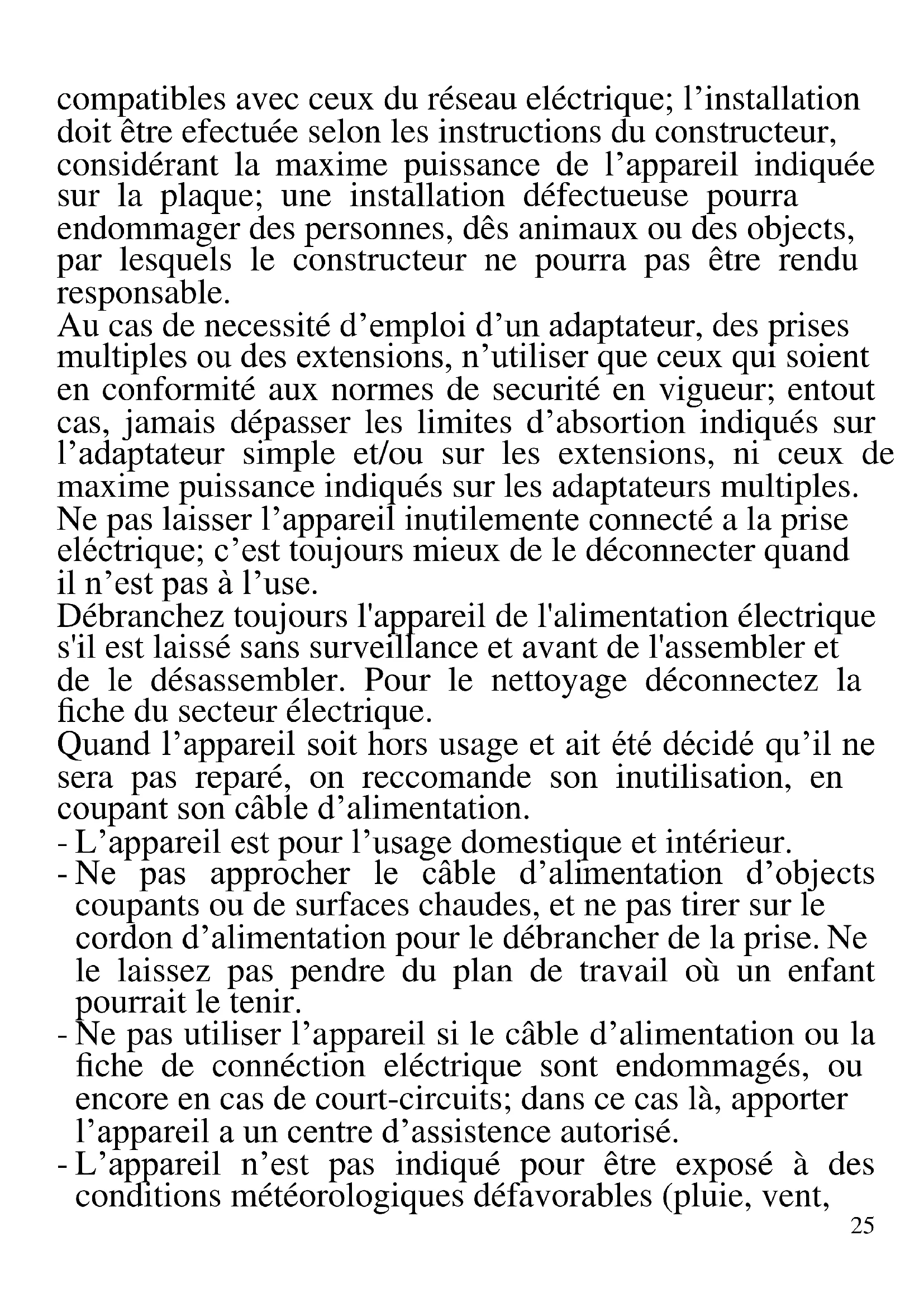 FRANCAIS: ADVERTISSEMENT Les indications suivantes sont très importantes en ce qui concerne l’installation, usage et manutention de cet appareil; gardez soigneusement ce manuel pour des futures consultations; n’utilisez pas l’appareil que selon les indications de ce manuel d’instructions; n’importe quel autre type d’ utilisation devra être consideré inaproprié et potentiellement dangereux; pour cette raison le constructeur ne pourra pas être rendu responsable si des dommages résultants de l’utilisation inapropriée ou irresponsable de l’appareil se produisent. Avant de l’utilisation, certifiez-vous de l’integrité de l’appareil; en cas de doute ne l’utilisez pas et addressez- vous a l’assistence téchnique autoriséa; ne laissez pas des parties de l’emballage (sacs de plastique, polystirène, ongles, agrafages, etc.) à la portée des enfants, car elles constituent des potentielles sources de danger; en autre, il faut rappeler que ces parties doivent être objet de collècte differencié de résidus. Certifiez-vous que les donnés constants de la plaque sont25 compatibles avec ceux du réseau eléctrique; l’installation doit être efectuée selon les instructions du constructeur, considérant la maxime puissance de l’appareil indiquée sur la plaque; une installation défectueuse pourra endommager des personnes, dês animaux ou des objects, par lesquels le constructeur ne pourra pas être rendu responsable. Au cas de necessité d’emploi d’un adaptateur, des prises multiples ou des extensions, n’utiliser que ceux qui soient en conformité aux normes de securité en vigueur; entout cas, jamais dépasser les limites d’absortion indiqués sur l’adaptateur simple et/ou sur les extensions, ni ceux de maxime puissance indiqués sur les adaptateurs multiples. Ne pas laisser l’appareil inutilemente connecté a la prise eléctrique; c’est toujours mieux de le déconnecter quand il n’est pas à l’use. Débranchez toujours l'appareil de l'alimentation électrique s'il est laissé sans surveillance et avant de l'assembler et de le désassembler. Pour le nettoyage déconnectez la fiche du secteur électrique. Quand l’appareil soit hors usage et ait été décidé qu’il ne sera pas reparé, on reccomande son inutilisation, en coupant son câble d’alimentation. - L’appareil est pour l’usage domestique et intérieur. - Ne pas approcher le câble d’alimentation d’objects coupants ou de surfaces chaudes, et ne pas tirer sur le cordon d’alimentation pour le débrancher de la prise. Ne le laissez pas pendre du plan de travail où un enfant pourrait le tenir. - Ne pas utiliser l’appareil si le câble d’alimentation ou la fiche de connéction eléctrique sont endommagés, ou encore en cas de court-circuits; dans ce cas là, apporter l’appareil a un centre d’assistence autorisé. - L’appareil n’est pas indiqué pour être exposé à des conditions météorologiques défavorables (pluie, vent,26 humidité, la glace, etc.); Gardez-le dans un endroit sec. Jamais opérer ou même toucher l’appareil avec les mains mouillées ou les pieds nus. - Ce produit ne doit pas être utilisé par les enfants, même s'ils ont plus de 8 ans. - Cet appareil peut être utilisé par des personnes ayant des capacités physiques, sensorielles ou mentales réduites, ou qui manquent d'expérience ou de connaissances, si elles ont été correctement supervisées ou ont reçu des instructions pour utiliser cet appareil en toute sécurité. - Les enfants ne doivent pas jouer avec cet appareil. - Gardez l’appareil et le câble d’alimentation hors la portée des enfants agés de moins de 8 ans. Au cas de panne et/ou de mauvais fonctionnement, ne pas intervenir sur l’ appareil. Pour une éventuel réparation s’addresser uniquement a un centre autorisé par le constructeur, en demandant dês pièces de remplacement originaux. Le non respect de ces indications peut compromettre la securité de l’appareil e rendre invalides les termes de la garantie. ATTENTION: Cet appareil comporte une fonction de chauffage. Quelques surfaces, même si non la plaque elle même, pourront atteindre des températures élevées. Étant donné que la sensibilité à la température diffère de personne à personne, cet appareil devrà être usé avec PRUDENCE. Placez l’appareil sur des surfaces adéhrentes et préparées pour cet effet, et utilisez les mésures de protection contre la chaleur conseillées, comme dês poignées ou des gants de cuisine. - Cet appareil est destiné à être utilisé dans les ménages et des applications similaires: les cuisines du personnel dans les magasins, bureaux et autres environnements de travail, pour les clients dans les hôtels, motels et autres environnements de type résidentiel, de type lit et petit- déjeuner, hébergement.27 - L’appareil n’est pas conçu pour être utilisé avec une minuterie extérieure ou un commande à distance. - N’utiliser que des accéssoires e pièces d’origine. - Avant chaque utilisation, effectuez le cordon d'alimentation. Ne soumettez pas le produit à des chocs susceptibles de l'endommager.