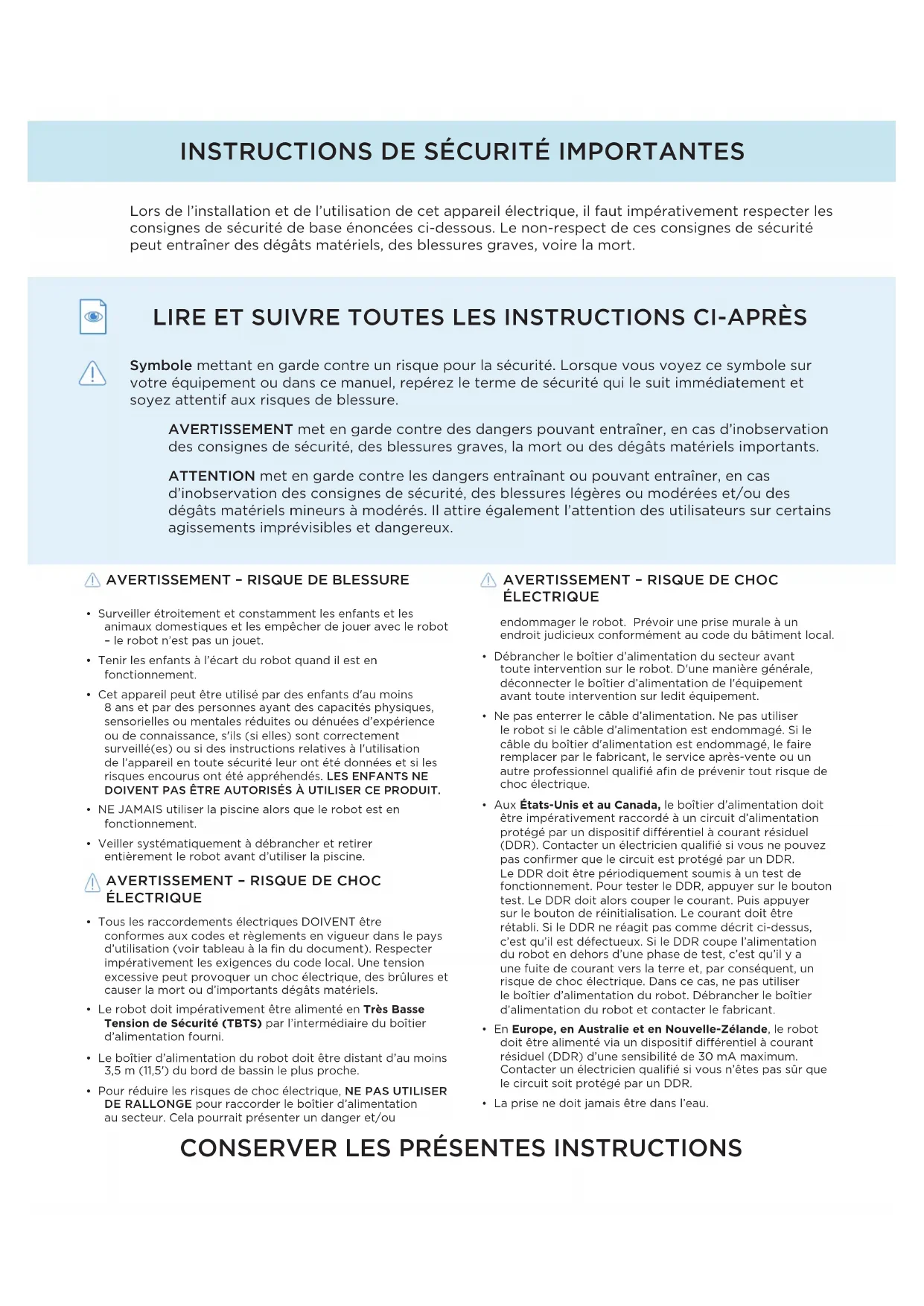 - NE JAMAIS utiliser la piscine alors que le robot est en fonctionnement.