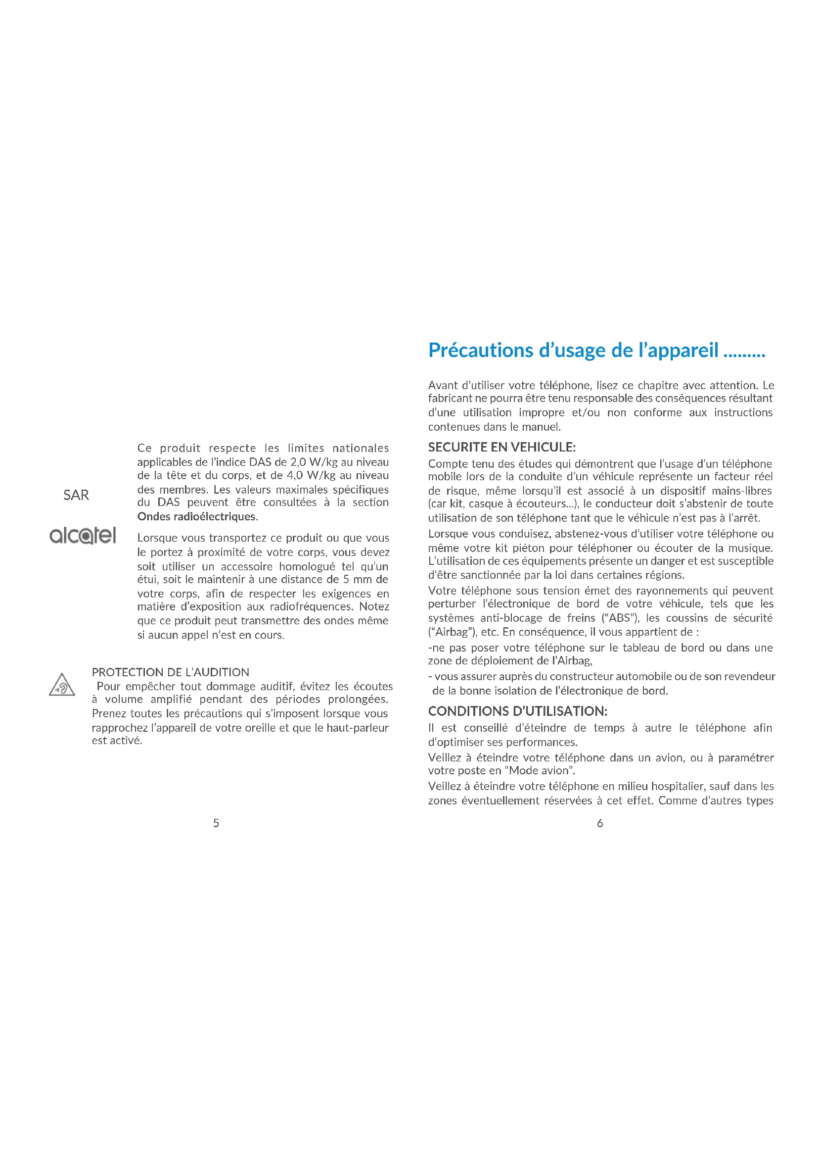 - Pour obtenir des informations détaillées sur l’utilisation du téléphone, veuillez accéder au site www. alcatelmobile.com et télécharger le guide d’utilisation complet. Vous pouvez également trouver des réponses dans la rubrique FAQ (Foire aux Questions) de notre site Web et bien plus encore.1 2 Table des matières Précautions d’usage de l’appareil p. 6
