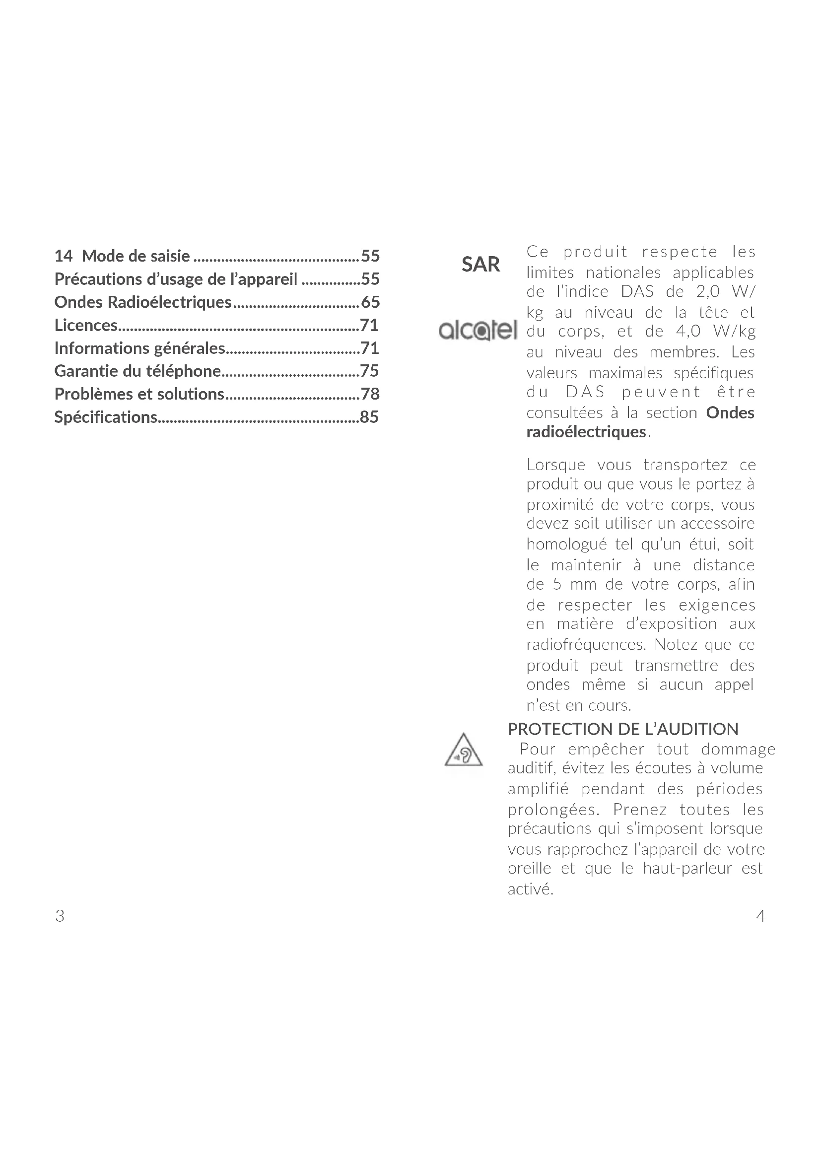 Adresse : 5/F, Building 22E, 22 Science Park East Avenue, Hong Kong Science Park, Shatin, NT, Hong Kong. Sur notre site internet, vous pourrez consulter en ligne une FAQ (Foire aux Questions), ou nous contacter directement par email pour poser votre question. Cet équipement radio fonctionne dans les bandes de fréquence et aux puissances maximales suivantes: GSM 900MHz: 30,0 dBm GSM 1800MHz: 29,5 dBm Bluetooth 2.4GHz band: 1,57 dBm Informations réglementaires Par la présente, TCL Communication Ltd. déclare que l’équipement radio de type Alcatel 2020X est conforme à la Directive 2014/53/EU. La déclaration complète de conformité européenne est disponible à l’adresse suivante : http://www.alcatelmobile. com/EU_doc. Informations complémentaires La description des accessoires et composants, y compris le logiciel, qui permet à cet équipement radio de fonctionner comme prévu, se trouve dans la déclaration complète de conformité européenne, disponible à l’adresse suivante : http://www.alcatelmobile. com/EU_doc. Protection contre le vol (1) Votre téléphone mobile est identifié par un numéro IMEI (numéro de série de votre téléphone), inscrit sur l’étiquette de l’emballage et dans la mémoire de votre téléphone. Nous vous recommandons vivement, lors de la première utilisation, de noter ce numéro en tapant *#06# et de le garder précieusement ; il pourra vous être demandé par la Police (1) Vérifiez la disponibilité de ce service auprès de votre opérateur.7473 ou par votre opérateur en cas de vol. Grâce à ce numéro, votre téléphone mobile pourra être bloqué, donc inutilisable par une tierce personne, même si elle change la carte SIM. Clause de non responsabilité Selon la version logicielle de votre téléphone et les services spécifiques offerts par votre opérateur, certaines différences peuvent apparaître entre la description du manuel utilisateur et le comportement du téléphone. TCL Communication Ltd. ne pourra être tenu légalement responsable de telles différences, le cas échéant, ou de leurs conséquences éventuelles, l’opérateur en portant l’exclusive responsabilité. Cet appareil peut contenir des données, y compris des applications et des logiciels sous forme d’exécutable ou de code source, soumis par des tiers en vue de leur ajout dans le présent appareil (« Données de tierces parties »). Tous les Éléments de tierce partie dans ce téléphone sont fournis « tels quels » sans garantie d’aucune sorte, que ce soit expresse ou implicite. L’acheteur reconnaît que TCL Communication Ltd. satisfait toutes les obligations de qualité lui incombant en tant que fabricant de téléphones et d’appareils mobiles en matière de droits de propriété intellectuelle. TCL Communication Ltd. ne saurait, à aucun moment, être tenu responsable de l’incapacité ou de l’impossibilité des données de tierces parties à fonctionner sur ce téléphone ou en interaction avec d’autres appareils. Dans la mesure permise par la loi, TCL Communication Ltd. décline toute responsabilité envers toute réclamation, revendication, poursuite ou action en justice et, plus spécifiquement, mais de façon non restrictive, toute action en responsabilité civile, s’appuyant sur une supposition quelconque de responsabilité découlant de l’utilisation, par quelque moyen que ce soit, ou de la tentative d’utilisation desdites données de tierces parties. En outre, les présentes données de tierces parties, mises à disposition gratuitement par TCL Communication Ltd., pourront être sujettes ultérieurement à des mises à jour ou des mises à niveau payantes. TCL Communication Ltd. décline toute responsabilité à l’égard de tels coûts supplémentaires, dont la prise en charge incombe au seul acheteur. TCL Communication Ltd. ne peut être tenu responsable de l’absence de disponibilité d’une application quelconque, dans la mesure où cette disponibilité dépend du pays et de l’opérateur auquel est abonné l’acheteur. TCL Communication Ltd. se réserve le droit à tout moment d’ajouter ou de retirer des Éléments de tierce partie de ses téléphones sans avis préalable ; en aucun cas TCL Communication Ltd. ne saurait être responsable vis-à-vis de l’acheteur de conséquences quelconques d’un tel retrait.7675 Garantie du téléphone......... Votre téléphone est garanti contre tout défaut de conformité ou dysfonctionnement qui pourrait apparaître, dans des conditions normales d’utilisation pendant la durée de garantie de vingt-quatre (24) mois (1) à compter de la date d’achat de votre téléphone, telle que figurant sur votre facture originale. Les batteries (2) et accessoires vendus avec votre téléphone sont aussi garantis contre tout défaut de conformité qui pourrait apparaître, dans des conditions normales d’utilisation mais pendant la durée de six (6) mois (1) à compter de la date d’achat de votre téléphone, telle que figurant sur votre facture. En cas de constat d’un défaut de conformité de votre téléphone qui en empêche une utilisation normale, vous devez aviser immédiatement votre revendeur et lui présenter votre téléphone avec la facture (1) La durée de cette garantie légale peut varier dans votre pays. (2) L’autonomie en communication, en veille, et le cycle de vie total d’une batterie rechargeable d’un téléphone mobile Alcatel dépendent des conditions d’usage et des configurations du réseau. S’agissant d’un consommable, les spécifications indiquent que vous devriez obtenir un fonctionnement optimal de votre téléphone Alcatel dans les six premiers mois de l’achat et pour environ 200 charges. originale. Si le défaut de conformité est confirmé, tout ou partie de votre téléphone sera remplacé ou réparé. La réparation ou le remplacement pourra être effectué(e) avec des produits remis à neuf et reconditionnés et dont les fonctionnali