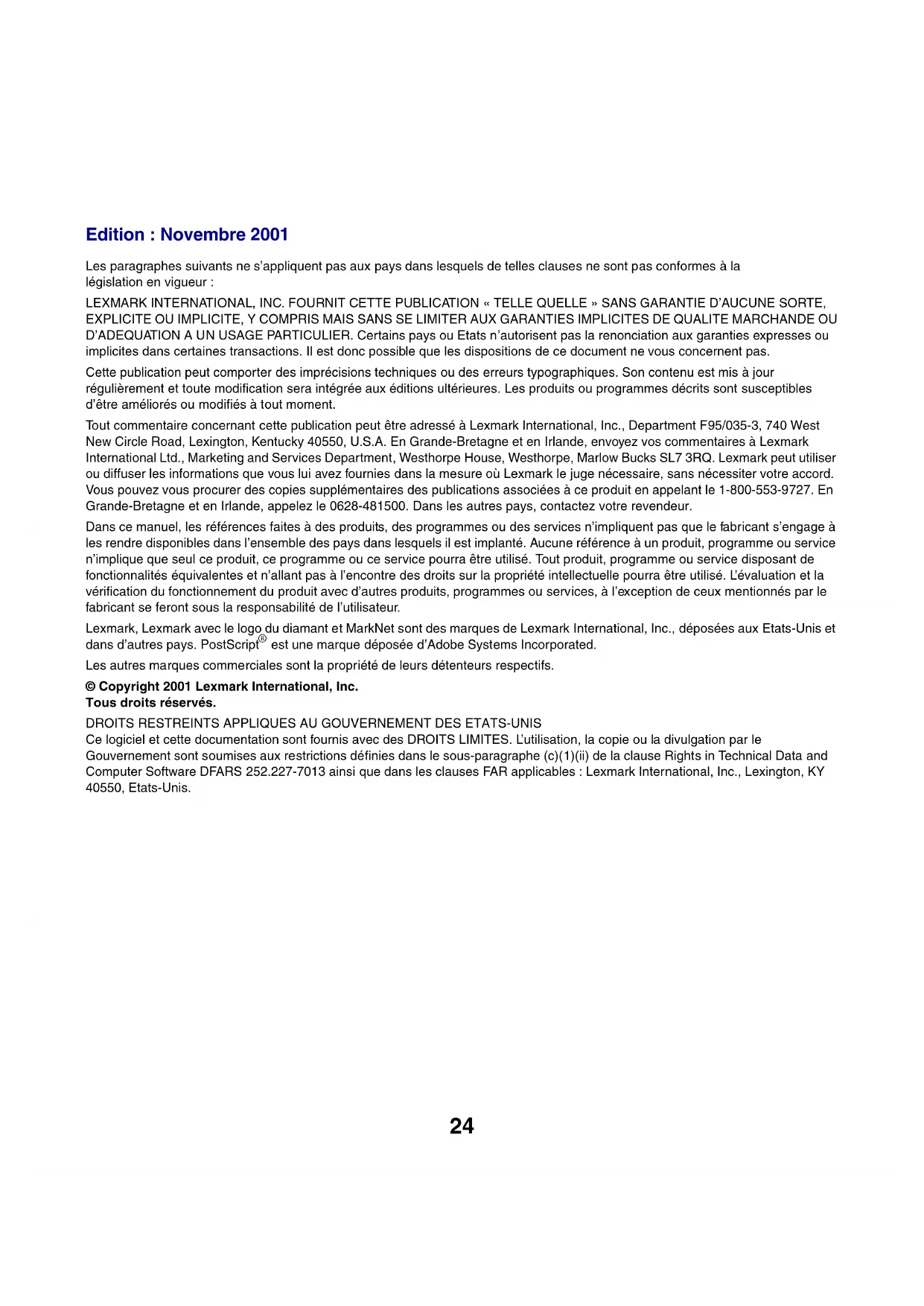 - Este produto foi desenvolvido, testado e aprovado para atender a rigorosos padrões de segurança mundiais no uso de componentes específicos Lexmark. Os recursos de segurança de algumas peças nem sempre são óbvios. A Lexmark não é responsável pelo uso de outras peças de substituição.24 Edition : Novembre 2001 Les paragraphes suivants ne s’appliquent pas aux pays dans lesquels de telles clauses ne sont pas conformes à la législation en vigueur : LEXMARK INTERNATIONAL, INC. FOURNIT CETTE PUBLICATION « TELLE QUELLE » SANS GARANTIE D’AUCUNE SORTE, EXPLICITE OU IMPLICITE, Y COMPRIS MAIS SANS SE LIMITER AUX GARANTIES IMPLICITES DE QUALITE MARCHANDE OU D’ADEQUATION A UN USAGE PARTICULIER. Certains pays ou Etats n’autorisent pas la renonciation aux garanties expresses ou implicites dans certaines transactions. Il est donc possible que les dispositions de ce document ne vous concernent pas. Cette publication peut comporter des imprécisions techniques ou des erreurs typographiques. Son contenu est mis à jour régulièrement et toute modification sera intégrée aux éditions ultérieures. Les produits ou programmes décrits sont susceptibles d’être améliorés ou modifiés à tout moment. Tout commentaire concernant cette publication peut être adressé à Lexmark International, Inc., Department F95/035-3, 740 West New Circle Road, Lexington, Kentucky 40550, U.S.A. En Grande-Bretagne et en Irlande, envoyez vos commentaires à Lexmark International Ltd., Marketing and Services Department, Westhorpe House, Westhorpe, Marlow Bucks SL7 3RQ. Lexmark peut utiliser ou diffuser les informations que vous lui avez fournies dans la mesure où Lexmark le juge nécessaire, sans nécessiter votre accord. Vous pouvez vous procurer des copies supplémentaires des publications associées à ce produit en appelant le 1-800-553-9727. En Grande-Bretagne et en Irlande, appelez le 0628-481500. Dans les autres pays, contactez votre revendeur. Dans ce manuel, les références faites à des produits, des programmes ou des services n’impliquent pas que le fabricant s’engage à les rendre disponibles dans l’ensemble des pays dans lesquels il est implanté. Aucune référence à un produit, programme ou service n’implique que seul ce produit, ce programme ou ce service pourra être utilisé. Tout produit, programme ou service disposant de fonctionnalités équivalentes et n’allant pas à l’encontre des droits sur la propriété intellectuelle pourra être utilisé. L’évaluation et la vérification du fonctionnement du produit avec d’autres produits, programmes ou services, à l’exception de ceux mentionnés par le fabricant se feront sous la responsabilité de l’utilisateur. Lexmark, Lexmark avec le logo du diamant et MarkNet sont des marques de Lexmark International, Inc., déposées aux Etats-Unis et dans d’autres pays. PostScript
