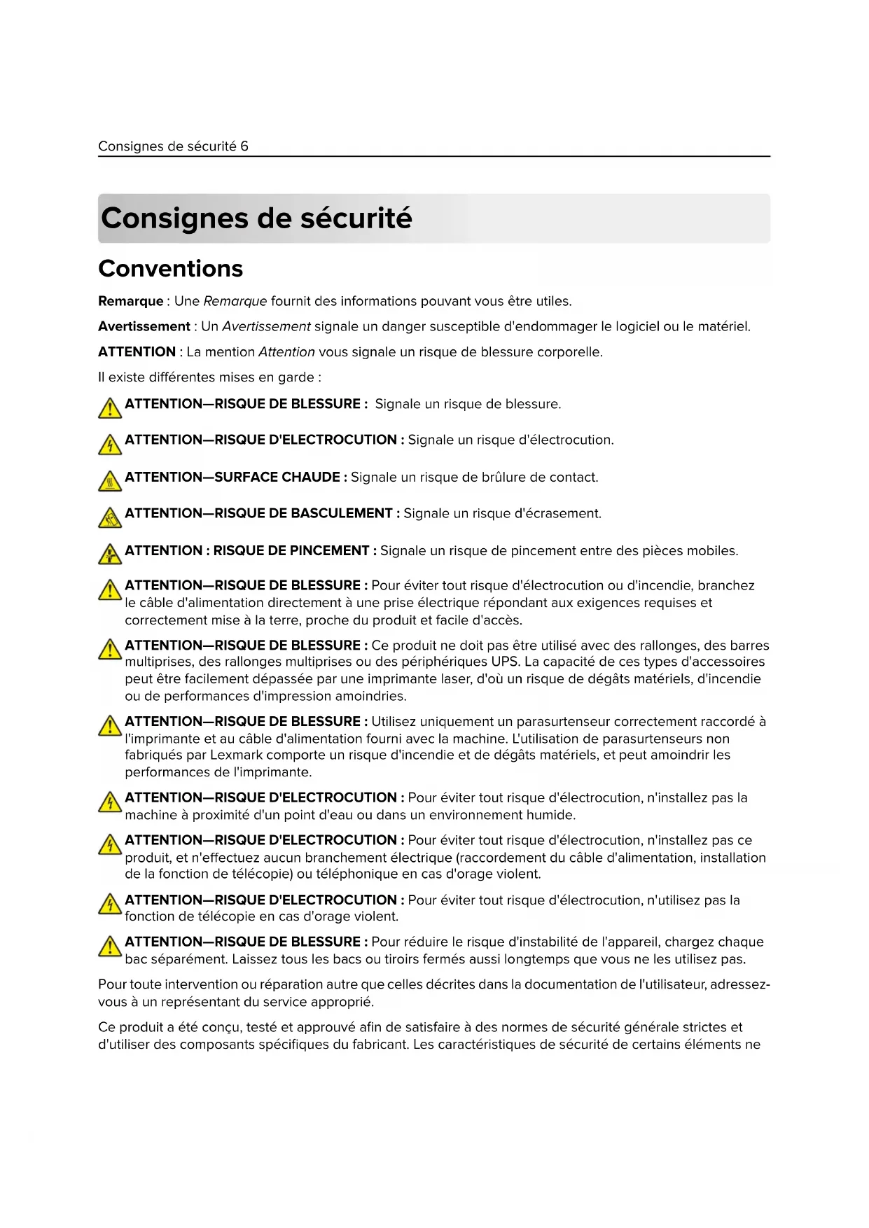 ATTENTION : La mention Attention vous signale un risque de blessure corporelle. Il existe diérentes mises en garde : ATTENTION—RISQUE DE BLESSURE : Signale un risque de blessure. ATTENTION—RISQUE D'ELECTROCUTION : Signale un risque d'électrocution. ATTENTION—SURFACE CHAUDE : Signale un risque de brûlure de contact. ATTENTION—RISQUE DE BASCULEMENT : Signale un risque d'écrasement. ATTENTION : RISQUE DE PINCEMENT : Signale un risque de pincement entre des pièces mobiles. ATTENTION—RISQUE DE BLESSURE : Pour éviter tout risque d'électrocution ou d'incendie, branchez le câble d'alimentation directement à une prise électrique répondant aux exigences requises et correctement mise à la terre, proche du produit et facile d'accès. ATTENTION—RISQUE DE BLESSURE : Ce produit ne doit pas être utilisé avec des rallonges, des barres multiprises, des rallonges multiprises ou des périphériques UPS. La capacité de ces types d'accessoires peut être facilement dépassée par une imprimante laser, d'où un risque de dégâts matériels, d'incendie ou de performances d'impression amoindries. ATTENTION—RISQUE DE BLESSURE : Utilisez uniquement un parasurtenseur correctement raccordé à l'imprimante et au câble d'alimentation fourni avec la machine. L'utilisation de parasurtenseurs non fabriqués par Lexmark comporte un risque d'incendie et de dégâts matériels, et peut amoindrir les performances de l'imprimante. ATTENTION—RISQUE D'ELECTROCUTION : Pour éviter tout risque d'électrocution, n'installez pas la machine à proximité d'un point d'eau ou dans un environnement humide. ATTENTION—RISQUE D'ELECTROCUTION : Pour éviter tout risque d'électrocution, n'installez pas ce produit, et n'eectuez aucun branchement électrique (raccordement du câble d'alimentation, installation de la fonction de télécopie) ou téléphonique en cas d'orage violent. ATTENTION—RISQUE D'ELECTROCUTION : Pour éviter tout risque d'électrocution, n'utilisez pas la fonction de télécopie en cas d'orage violent. ATTENTION—RISQUE DE BLESSURE : Pour réduire le risque d'instabilité de l'appareil, chargez chaque bac séparément. Laissez tous les bacs ou tiroirs fermés aussi longtemps que vous ne les utilisez pas. Pour toute intervention ou réparation autre que celles décrites dans la documentation de l'utilisateur, adressez- vous à un représentant du service approprié. Ce produit a été conçu, testé et approuvé afin de satisfaire à des normes de sécurité générale strictes et d'utiliser des composants spécifiques du fabricant. Les caractéristiques de sécurité de certains éléments ne Consignes de sécurité 6sont pas toujours connues. Le fabricant n'est pas responsable de l'utilisation de pièces de rechange d'autres fabricants. ATTENTION—RISQUE D'ELECTROCUTION : Pour éviter tout risque d'électrocution, vérifiez que toutes les connexions externes (telles que les connexions Ethernet et téléphonique) sont correctement installées dans les ports appropriés. ATTENTION—RISQUE DE BLESSURE : Ce produit utilise un laser. L’utilisation de commandes ou de réglages, ou la mise en place de procédures autres que celles spécifiées dans le Guide de l'utilisateur peuvent entraîner des risques d’exposition aux rayonnements laser. Ce produit utilise un procédé d’impression thermique qui chaue le support d’impression, ce qui peut provoquer des émanations provenant du support. Vous devez lire intégralement la section relative aux instructions de mise en service qui traitent du choix des supports d'impression afin d'éviter d'éventuelles émanations dangereuses. ATTENTION—SURFACE CHAUDE : L'intérieur de l'imprimante risque d'être brûlant. pour réduire le risque de brûlure, laissez la surface ou le composant refroidir avant d'y toucher. ATTENTION—RISQUE DE BLESSURE : La batterie lithium de ce produit n'est pas destinée à être remplacée. Il existe un risque d'explosion si une batterie lithium est placée de façon incorrecte. Ne rechargez pas, ne démontez pas et n’incinérez pas une batterie lithium. Mettez les batteries lithium usagées au rebut selon les instructions du fabricant et les réglementations locales. ATTENTION—RISQUE DE BLESSURE : Pour réduire le risque d'incendie, utilisez uniquement un câble de télécommunication 26 AWG minimum (RJ-11) pour connecter ce produit au réseau téléphonique public. Pour les utilisateurs en Australie, le câble doit être approuvé par l'Australian Communications and Media Authority. ATTENTION—RISQUE DE BLESSURE : abstenez-vous de couper, de tordre, de plier, d'écraser le câble d'alimentation ou de poser des objets lourds dessus. Ne le soumettez pas à une usure ou une utilisation abusive. Ne pincez pas le cordon d'alimentation entre des objets, par exemple des meubles, et un mur. Un risque d'incendie ou de choc électrique pourrait s'ensuivre. Vérifez régulièrement que le câble d'alimentation ne présente pas ces problèmes. Avant de l'inspecter, débranchez-le de la prise électrique. ATTENTION—RISQUE D'ELECTROCUTION : pour éviter tout risque d'électrocution lors du nettoyage de l'extérieur de l'imprimante, débranchez le cordon d'alimentation électrique de la prise et déconnectez tous les câbles de l'imprimante avant de continuer. ATTENTION—RISQUE DE BASCULEMENT : Les configurations de montage sur le sol nécessitent un meuble supplémentaire pour des raisons de stabilité. Utilisez un support ou une base d'imprimante si vous utilisez plusieurs options d'entrée. Si vous avez acheté une imprimante multifonction (MFP) qui numérise, copie et envoie des télécopies, vous aurez peut-être besoin d'un meuble supplémentaire. Pour plus d'informations, reportez-vous à www.lexmark.com/multifunctionprinters. ATTENTION—RISQUE D'ELECTROCUTION : Si vous accédez à la carte contrôleur ou installez du matériel en option ou des périphériques mémoire alors que l'imprimante est déjà en 