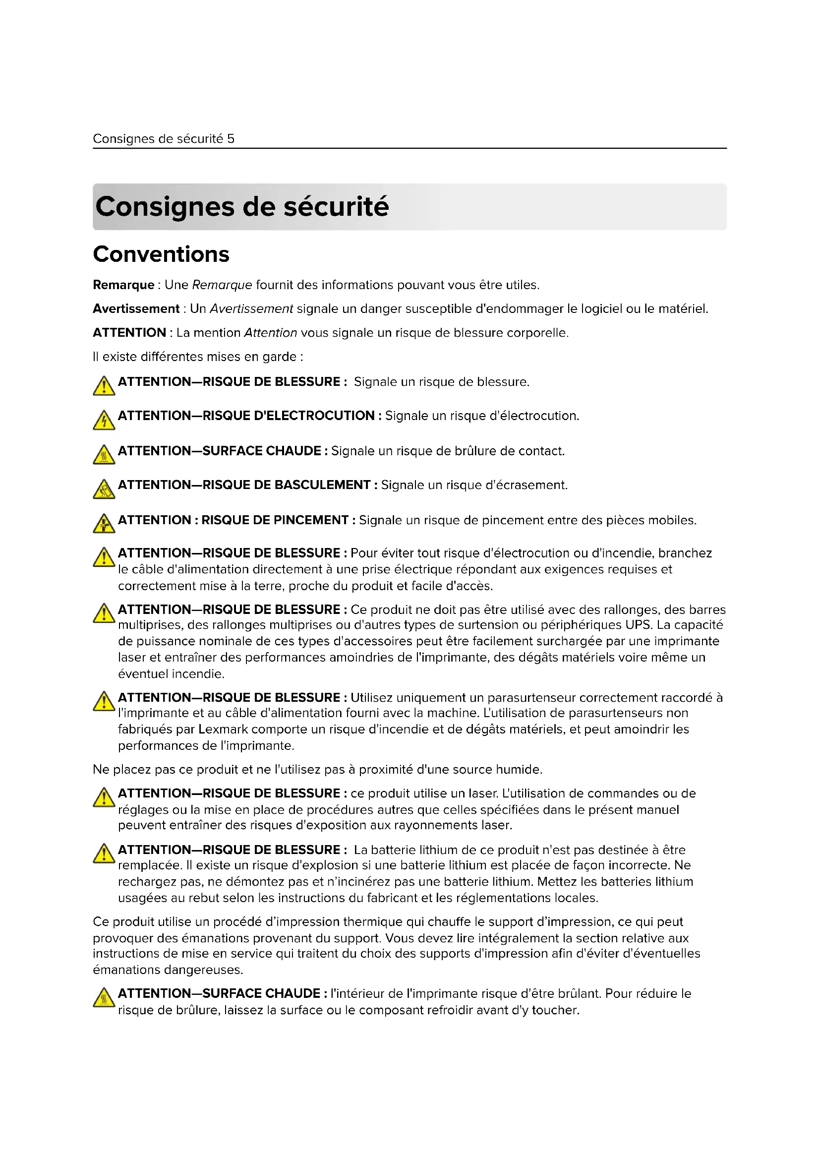 ATTENTION : La mention Attention vous signale un risque de blessure corporelle. Il existe diérentes mises en garde : ATTENTION—RISQUE DE BLESSURE : Signale un risque de blessure. ATTENTION—RISQUE D'ELECTROCUTION : Signale un risque d'électrocution. ATTENTION—SURFACE CHAUDE : Signale un risque de brûlure de contact. ATTENTION—RISQUE DE BASCULEMENT : Signale un risque d'écrasement. ATTENTION : RISQUE DE PINCEMENT : Signale un risque de pincement entre des pièces mobiles. ATTENTION—RISQUE DE BLESSURE : Pour éviter tout risque d'électrocution ou d'incendie, branchez le câble d'alimentation directement à une prise électrique répondant aux exigences requises et correctement mise à la terre, proche du produit et facile d'accès. ATTENTION—RISQUE DE BLESSURE : Ce produit ne doit pas être utilisé avec des rallonges, des barres multiprises, des rallonges multiprises ou d'autres types de surtension ou périphériques UPS. La capacité de puissance nominale de ces types d'accessoires peut être facilement surchargée par une imprimante laser et entraîner des performances amoindries de l'imprimante, des dégâts matériels voire même un éventuel incendie. ATTENTION—RISQUE DE BLESSURE : Utilisez uniquement un parasurtenseur correctement raccordé à l'imprimante et au câble d'alimentation fourni avec la machine. L'utilisation de parasurtenseurs non fabriqués par Lexmark comporte un risque d'incendie et de dégâts matériels, et peut amoindrir les performances de l'imprimante. Ne placez pas ce produit et ne l'utilisez pas à proximité d'une source humide. ATTENTION—RISQUE DE BLESSURE : ce produit utilise un laser. L'utilisation de commandes ou de réglages ou la mise en place de procédures autres que celles spécifiées dans le présent manuel peuvent entraîner des risques d'exposition aux rayonnements laser. ATTENTION—RISQUE DE BLESSURE : La batterie lithium de ce produit n'est pas destinée à être remplacée. Il existe un risque d'explosion si une batterie lithium est placée de façon incorrecte. Ne rechargez pas, ne démontez pas et n’incinérez pas une batterie lithium. Mettez les batteries lithium usagées au rebut selon les instructions du fabricant et les réglementations locales. Ce produit utilise un procédé d’impression thermique qui chaue le support d’impression, ce qui peut provoquer des émanations provenant du support. Vous devez lire intégralement la section relative aux instructions de mise en service qui traitent du choix des supports d'impression afin d'éviter d'éventuelles émanations dangereuses. ATTENTION—SURFACE CHAUDE : l'intérieur de l'imprimante risque d'être brûlant. Pour réduire le risque de brûlure, laissez la surface ou le composant refroidir avant d'y toucher. Consignes de sécurité 5ATTENTION—RISQUE DE BLESSURE : l’imprimante pèse plus de 18 kg. L'intervention d'au moins deux personnes est donc nécessaire pour la soulever sans risque. ATTENTION—RISQUE DE BLESSURE : Avant de déplacer l'imprimante, suivez les instructions ci- dessous pour éviter de vous blesser ou d'endommager l'imprimante :
