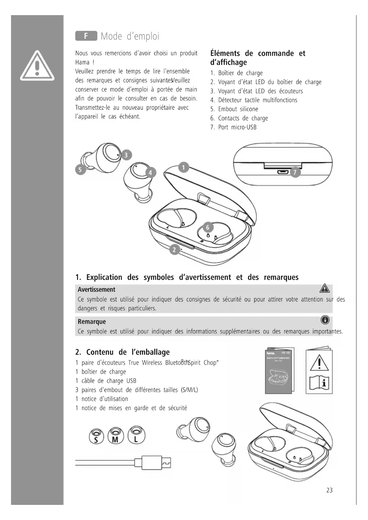 "Spirit Chop" 1 boîtier de charge 1 câble de charge USB 3 paires d’embout de différentes tailles (S/M/L) 1 notice d’utilisation 1 notice de mises en garde et de sécurité F Mode d’emploi24