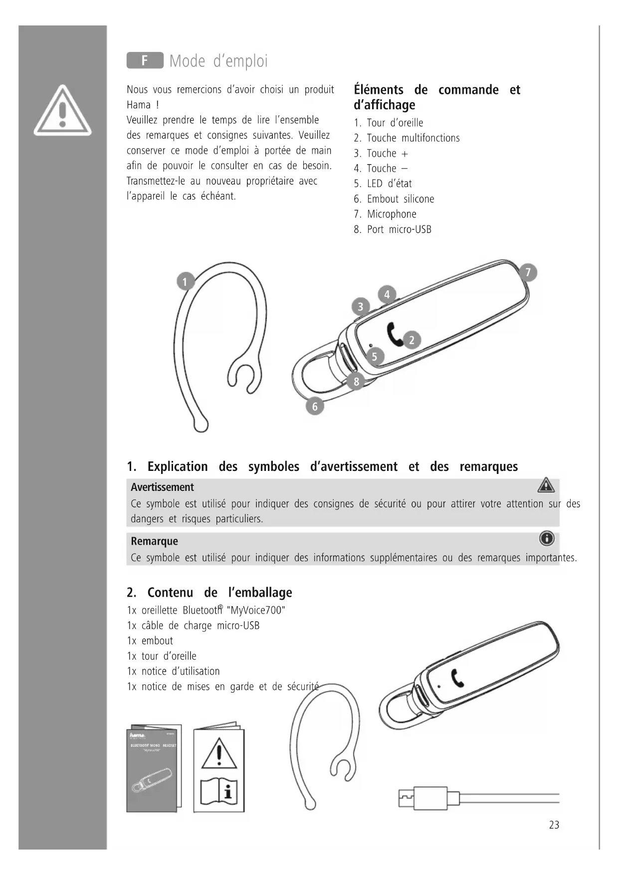 "MyVoice700" 1x câble de charge micro-USB 1x embout 1x tour d’oreille 1x notice d’utilisation 1x notice de mises en garde et de sécurité
