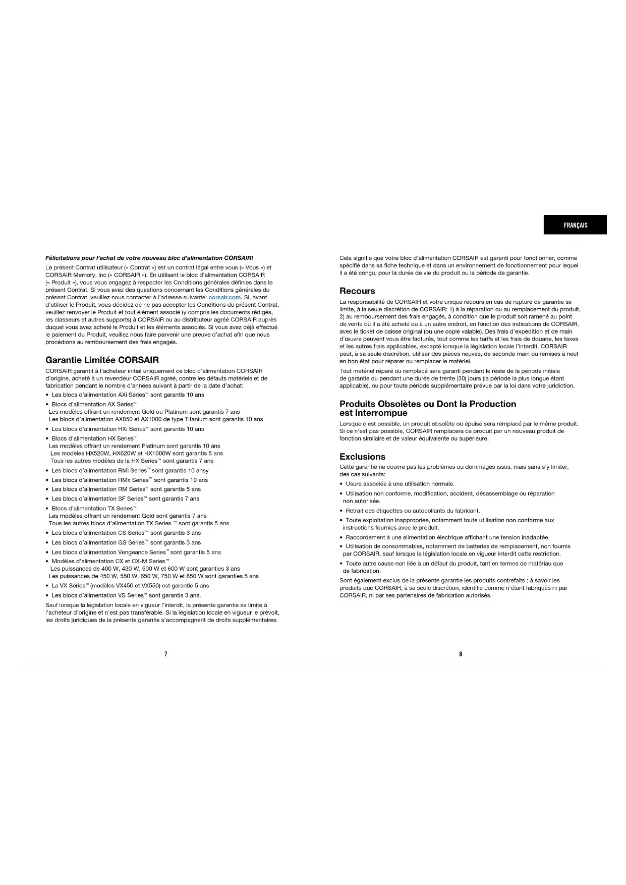 instructions will immediately void all warranties and guarantees.7 8 FRANÇAIS Félicitations pour l’achat de votre nouveau bloc d’alimentation CORSAIR! Le présent Contrat utilisateur («Contrat») est un contrat légal entre vous («Vous») et CORSAIR Memory, Inc («CORSAIR»). En utilisant le bloc d’alimentation CORSAIR («Produit»), vous vous engagez à respecter les Conditions générales définies dans le présent Contrat. Si vous avez des questions concernant les Conditions générales du présent Contrat, veuillez nous contacter à l’adresse suivante: corsair.com. Si, avant d’utiliser le Produit, vous décidez de ne pas accepter les Conditions du présent Contrat, veuillez renvoyer le Produit et tout élément associé (y compris les documents rédigés, les classeurs et autres supports) à CORSAIR ou au distributeur agréé CORSAIR auprès duquel vous avez acheté le Produit et les éléments associés. Si vous avez déjà effectué le paiement du Produit, veuillez nous faire parvenir une preuve d’achat afin que nous procédions au remboursement des frais engagés. Garantie Limitée CORSAIR CORSAIR garantit à l’acheteur initial uniquement ce bloc d’alimentation CORSAIR d’origine, acheté à un revendeur CORSAIR agréé, contre les défauts matériels et de fabrication pendant le nombre d’années suivant à partir de la date d’achat: