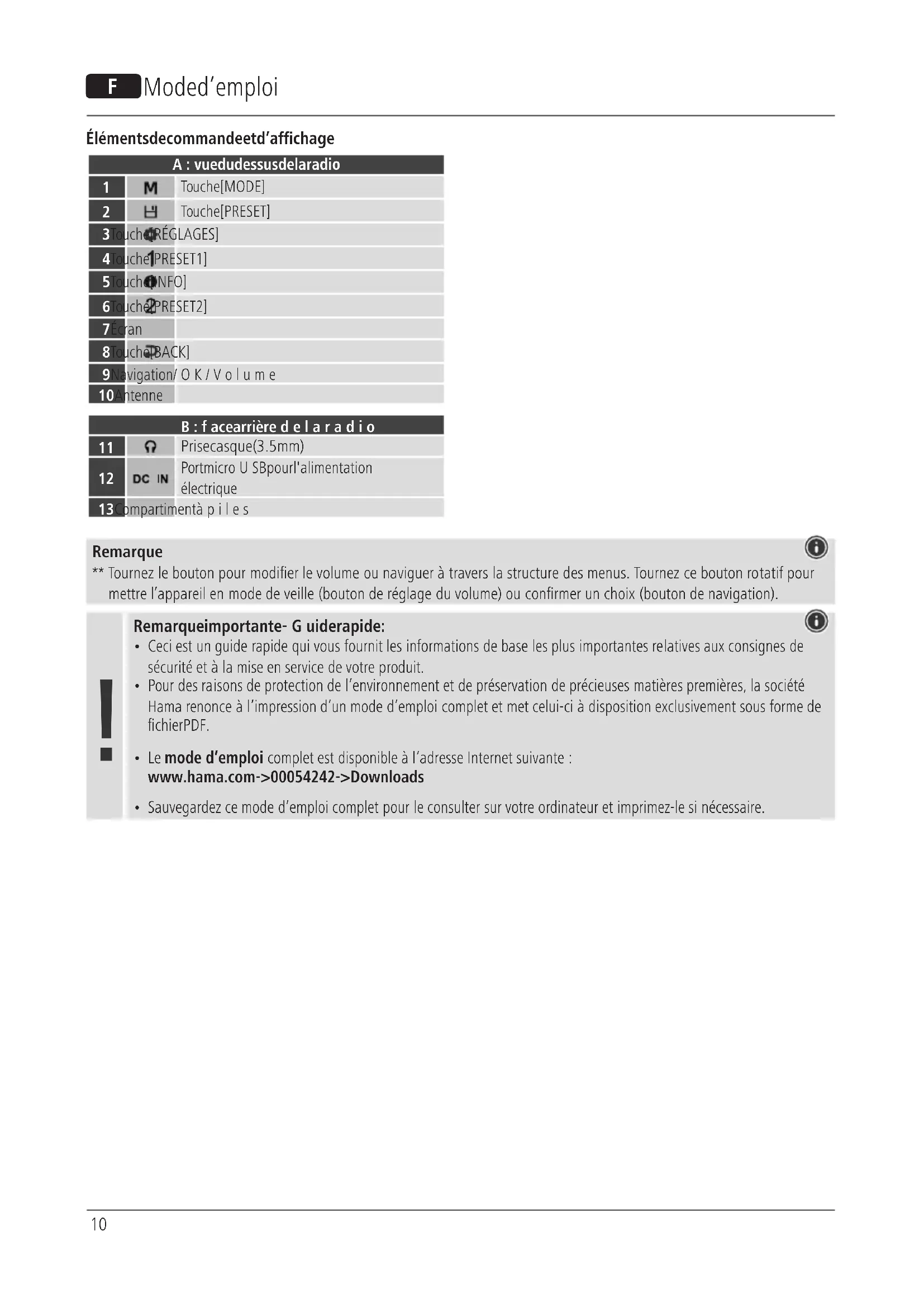 Downloads. Pour limiter l’exposition aux champs électromagnétiques Cet appareil est prévu pour êtreutilisé àune distance d’au moins 20 cm du corps de l’utilisateur ou des personnes se trouvant àproximité. Cet appareil ne doit pas êtreporté près du corps.14 E Instrucciones de uso Elementos de control eindicadores A: Vista superior de la radio Botón [MODE] Botón [PRESET]3 Botón [SETTINGS]4 Botón [PRESET 1]5 Botón [INFO]6 Botón [PRESET 2]7 Pantalla8 Botón [BACK]9 Navegación/OK/Volumen10 AntenaB: Lado posterior de la radio