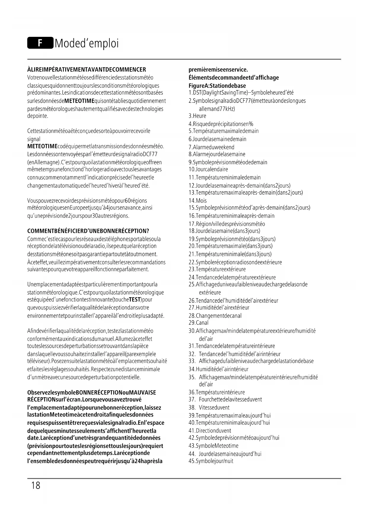 Votre nouvelle station météo se différencie des stations météo classiques qui donnent toujours les conditions météorologiques prédominantes. Les indications de cette station météo sont basées sur les données de METEOTIME qui sont établies quotidiennement par des météorologues hautement qualiés avec des technologies de pointe. Cette station météo a été conçue de sorte à pouvoir recevoir le signal METEOTIME codé qui permet la transmission des données météo. Les données sont envoyées par l’émetteur de signal radio DCF77 (en Allemagne). C’est pourquoi la station météorologique offre en même temps une fonction d’horloge radio avec tous les avantages connus comme notamment l’indication précise de l’heure et le changement automatique de l’heure d’hiver à l’heure d’été. Vous pouvez recevoir des prévisions météo pour 60 régions météorologiques en Europe et jusqu’à 4 jours en avance, ainsi qu’une prévision de 2 jours pour 30 autres régions. COMMENT BÉNÉFICIER D’UNE BONNE RÉCEPTION ? Comme c’est le cas pour les réseaux des téléphones portables ou la réception de la télévision ou de la radio, il se peut que la réception des stations météo ne soit pas garantie partout et à tout moment. À cet effet, veuillez impérativement consulter les recommandations suivantes pour que votre appareil fonctionne parfaitement. Un emplacement adapté est particulièrement important pour la station météorologique. C’est pourquoi la station météorologique est équipée d’une fonction test innovante (touche TEST) pour que vous puissiez vérier la qualité de la réception dans votre environnement et pour installer l’appareil à l’endroit le plus adapté. An de vérier la qualité de la réception, testez la station météo conformément aux indications du manuel. Allumez à cet effet toutes les sources de perturbations se trouvant dans la pièce dans laquelle vous souhaitez installer l’appareil (par exemple le téléviseur). Posez ensuite la station météo à l’emplacement souhaité et faites les réglages souhaités. Respectez une distance minimale d’un mètre avec une source de perturbation potentielle. Observez le symbole BONNE RÉCEPTION ou MAUVAISE RÉCEPTION sur l’écran. Lorsque vous avez trouvé l’emplacement adapté pour une bonne réception, laissez la station Meteotime à cet endroit an que les données requises puissent être reçues via le signal radio. En l’espace de quelques minutes seulement s’achent l’heure et la date. La réception d’une très grande quantité de données (prévision pour toutes les régions et tous les jours) requiert cependant nettement plus de temps. La réception de l’ensemble des données peut requérir jusqu’à 24h après la première mise en service. Éléments de commande et d’achage Figure A : Station de base