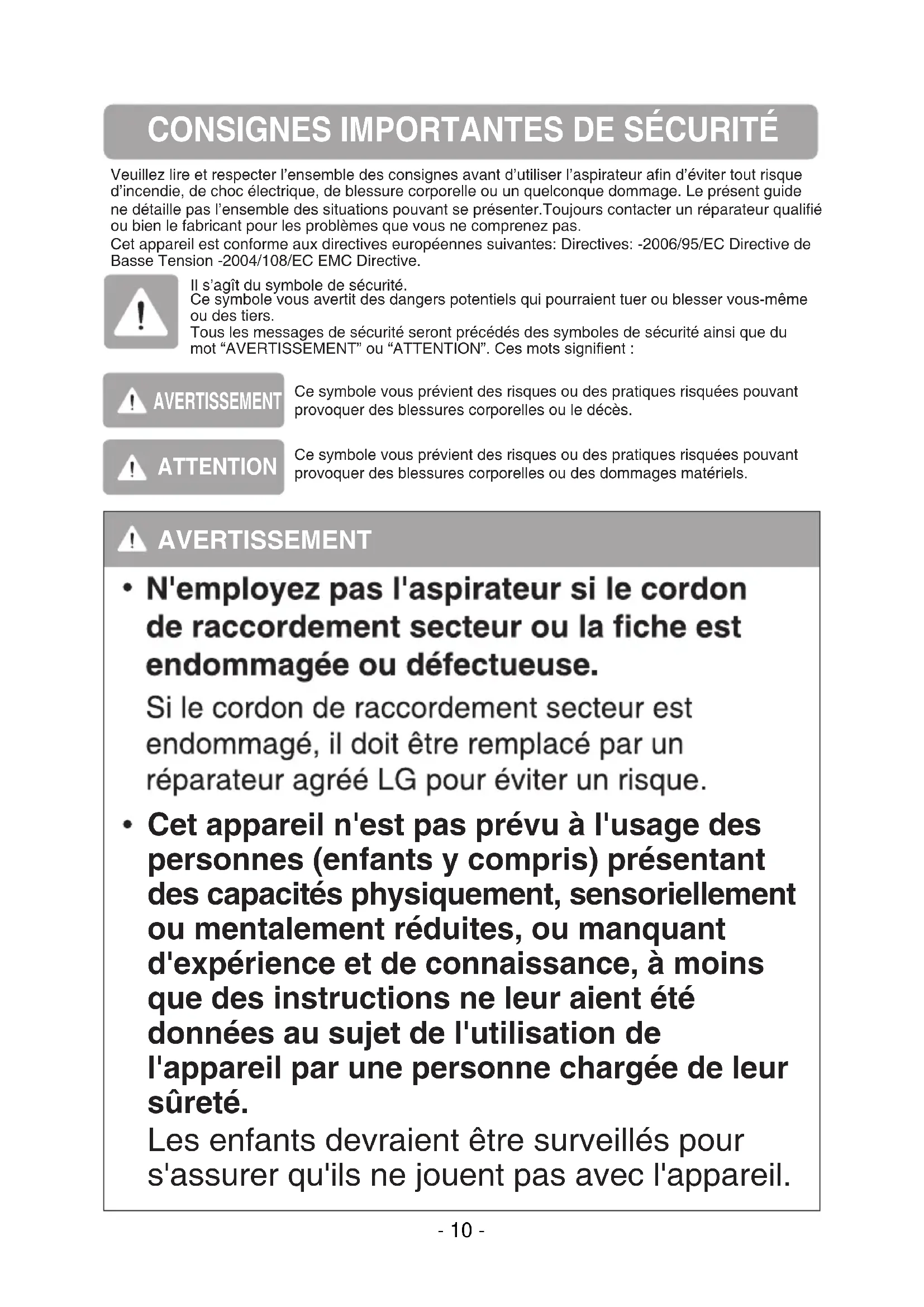 Veuillez lire et respecter l’ensemble des consignes avant d’utiliser l’aspirateur afin d’éviter tout risqued’incendie, de choc électrique, de blessure corporelle ou un quelconque dommage. Le présent guide ne détaille pas l’ensemble des situations pouvant se présenter.Toujours contacter un réparateur qualifiéou bien le fabricant pour les problèmes que vous ne comprenez pas.Cet appareil est conforme aux directives européennes suivantes: Directives: -2006/95/EC Directive de Basse Tension -2004/108/EC EMC Directive.Ce symbole vous prévient des risques ou des pratiques risquées pouvantprovoquer des blessures corporelles ou le décès.Il s’agît du symbole de sécurité.Ce symbole vous avertit des dangers potentiels qui pourraient tuer ou blesser vous-mêmeou des tiers.Tous les messages de sécurité seront précédés des symboles de sécurité ainsi que dumot “AVERTISSEMENT” ou “ATTENTION”. Ces mots signifient :Ce symbole vous prévient des risques ou des pratiques risquées pouvantprovoquer des blessures corporelles ou des dommages matériels. AVERTISSEMENT AVERTISSEMENT ATTENTION Cet appareil n'est pas prévu à l'usage des personnes (enfants y compris) présentant des capacités physiquement, sensoriellement ou mentalement réduites, ou manquant d'expérience et de connaissance, à moins que des instructions ne leur aient été données au sujet de l'utilisation de l'appareil par une personne chargée de leur sûreté. Les enfants devraient être surveillés pour s'assurer qu'ils ne jouent pas avec l'appareil. - 10 -AVERTISSEMENT