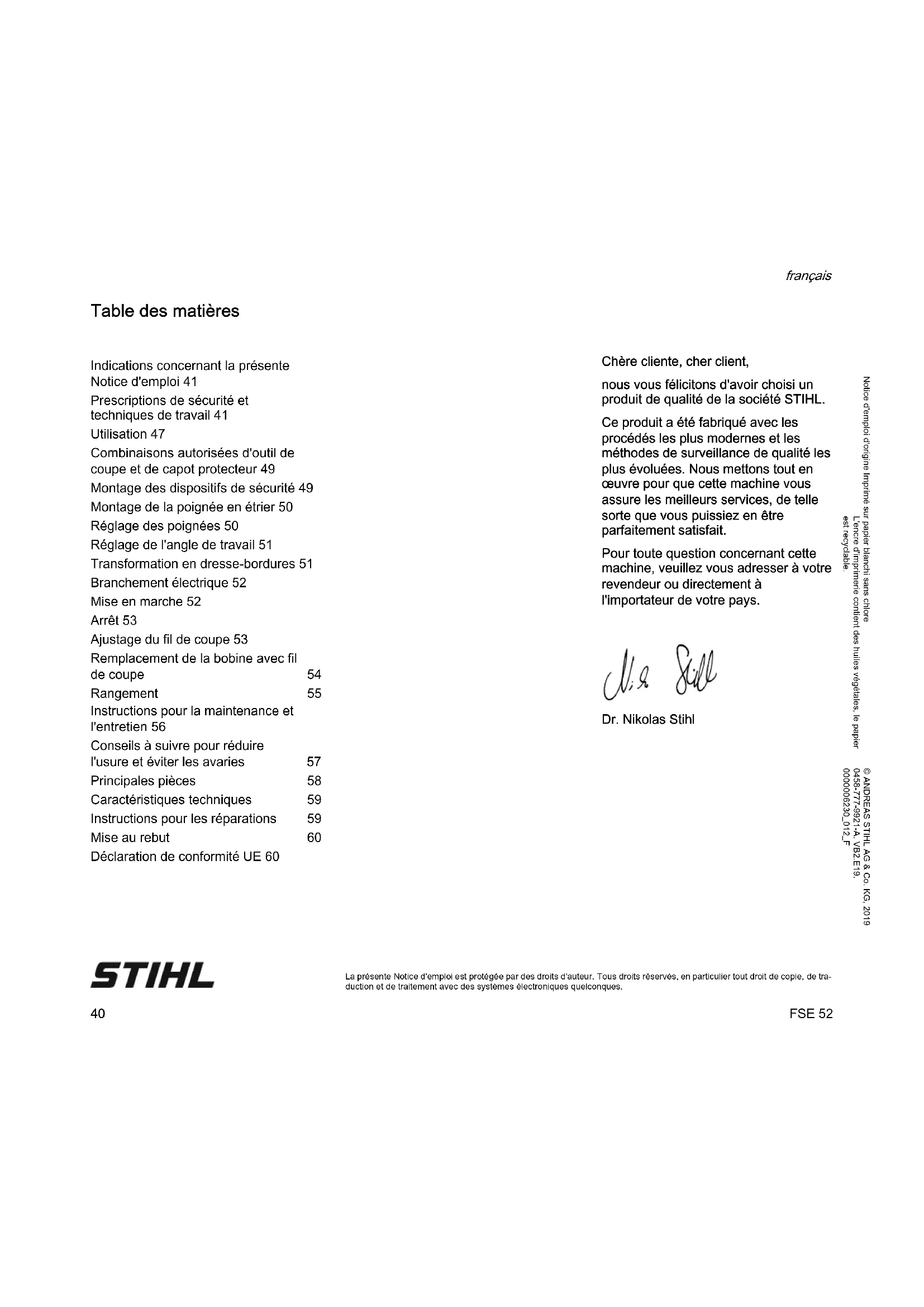 La présente Notice d'emploi est protégée par des droits d'auteur. Tous droits réservés, en particulier tout droit de copie, de tra- duction et de traitement avec des systèmes électroniques quelconques. Table des matières Chère cliente, cher client, nous vous félicitons d'avoir choisi un produit de qualité de la société STIHL. Ce produit a été fabriqué avec les procédés les plus modernes et les méthodes de surveillance de qualité les plus évoluées. Nous mettons tout en œuvre pour que cette machine vous assure les meilleurs services, de telle sorte que vous puissiez en être parfaitement satisfait. Pour toute question concernant cette machine, veuillez vous adresser à votre revendeur ou directement à l'importateur de votre pays. Dr. Nikolas Stihl Indications concernant la présente Notice d'emploi 41 Prescriptions de sécurité et techniques de travail 41 Utilisation 47 Combinaisons autorisées d'outil de coupe et de capot protecteur 49 Montage des dispositifs de sécurité 49 Montage de la poignée en étrier 50 Réglage des poignées 50 Réglage de l'angle de travail 51 Transformation en dresse-bordures 51 Branchement électrique 52 Mise en marche 52 Arrêt 53 Ajustage du fil de coupe 53 Remplacement de la bobine avec fil de coupe 54 Rangement 55 Instructions pour la maintenance et l'entretien 56 Conseils à suivre pour réduire l'usure et éviter les avaries 57 Principales pièces 58 Caractéristiques techniques 59 Instructions pour les réparations 59 Mise au rebut 60 Déclaration de conformité UE 60FSE 52 français