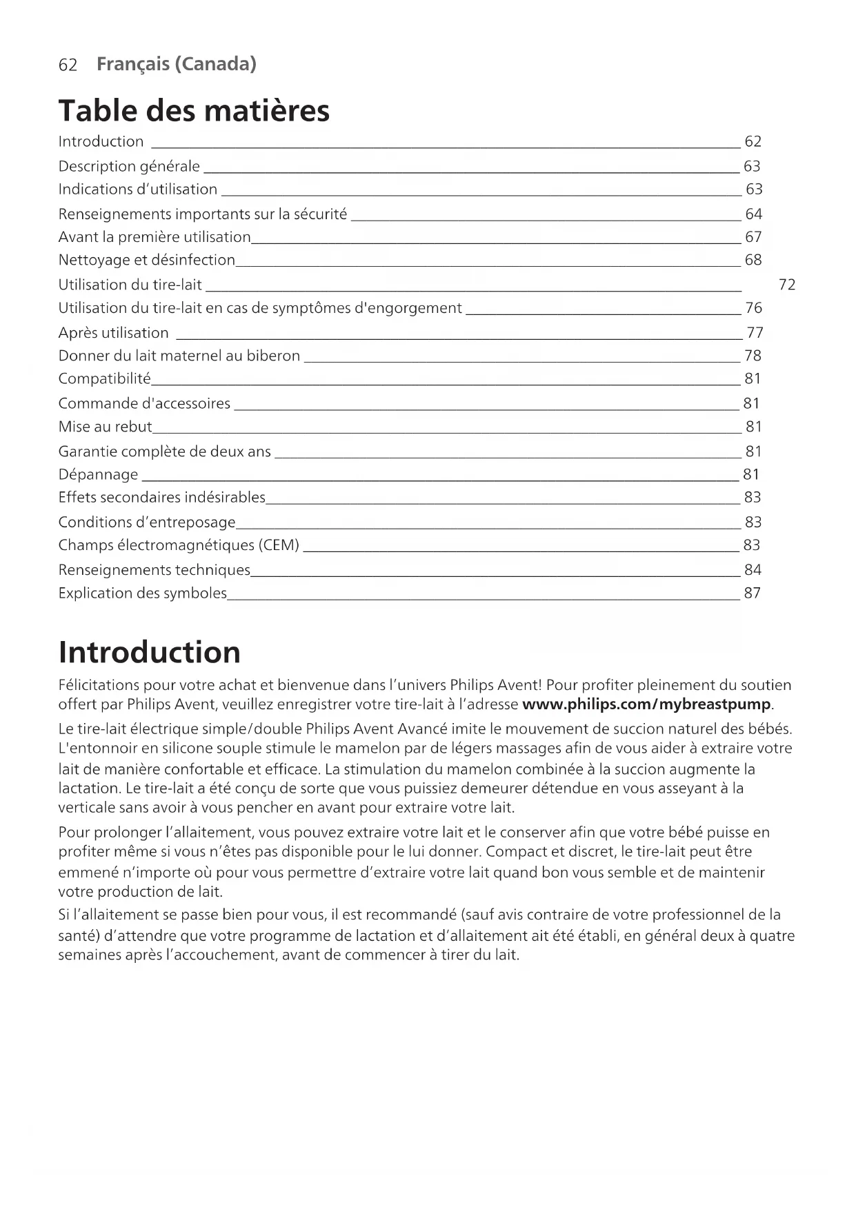 Français (Canada) Table des matières Introduction _____________________________________________________________________________ 62 Description générale ______________________________________________________________________ 63 Indications d’utilisation ____________________________________________________________________ 63 Renseignements importants sur la sécurité ___________________________________________________ 64 Avant la première utilisation________________________________________________________________ 67 Nettoyage et désinfection__________________________________________________________________ 68 Utilisation du tire-lait ______________________________________________________________________ 72 Utilisation du tire-lait en cas de symptômes d'engorgement ____________________________________ 76 Après utilisation __________________________________________________________________________ 77 Donner du lait maternel au biberon _________________________________________________________ 78 Compatibilité_____________________________________________________________________________ 81 Commande d'accessoires __________________________________________________________________ 81 Mise au rebut_____________________________________________________________________________ 81 Garantie complète de deux ans _____________________________________________________________ 81 Dépannage ______________________________________________________________________________ 81 Effets secondaires indésirables______________________________________________________________ 83 Conditions d’entreposage__________________________________________________________________ 83 Champs électromagnétiques (CEM) _________________________________________________________ 83 Renseignements techniques________________________________________________________________ 84 Explication des symboles___________________________________________________________________ 87 Introduction Félicitations pour votre achat et bienvenue dans l’univers PhilipsAvent! Pour profiter pleinement du soutien offert par PhilipsAvent, veuillez enregistrer votre tire-lait à l’adresse www.philips.com/mybreastpump. Le tire-lait électrique simple/double PhilipsAvent Avancé imite le mouvement de succion naturel des bébés. L'entonnoir en silicone souple stimule le mamelon par de légers massages afin de vous aider à extraire votre lait de manière confortable et efficace. La stimulation du mamelon combinée à la succion augmente la lactation. Le tire-lait a été conçu de sorte que vous puissiez demeurer détendue en vous asseyant à la verticale sans avoir à vous pencher en avant pour extraire votre lait. Pour prolonger l’allaitement, vous pouvez extraire votre lait et le conserver afin que votre bébé puisse en profiter même si vous n’êtes pas disponible pour le lui donner. Compact et discret, le tire-lait peut être emmené n’importe où pour vous permettre d’extraire votre lait quand bon vous semble et de maintenir votre production de lait. Si l’allaitement se passe bien pour vous, il est recommandé (sauf avis contraire de votre professionnel de la santé) d’attendre que votre programme de lactation et d’allaitement ait été établi, en général deux à quatre semaines après l’accouchement, avant de commencer à tirer du lait.63 Français (Canada) Français (Canada) Description générale Remarque: Les chiffres représentés ci-dessous font référence aux chiffres de la figure qui se trouve sur la première page repliée de ce mode d’emploi. Remarque: Le tire-lait simple (SCF391/62) comprend un jeu de tire-lait et le biberon Naturel Philips Avent. Le tire-lait double (SCF393/62) comprend deux jeux, comme le montrent les figures B et C. Description du produit (Fig.A) A1 Unité motorisée A2 Ensemble de tire-lait A3 Biberon A4 Adaptateur* A5 Tire-lait double