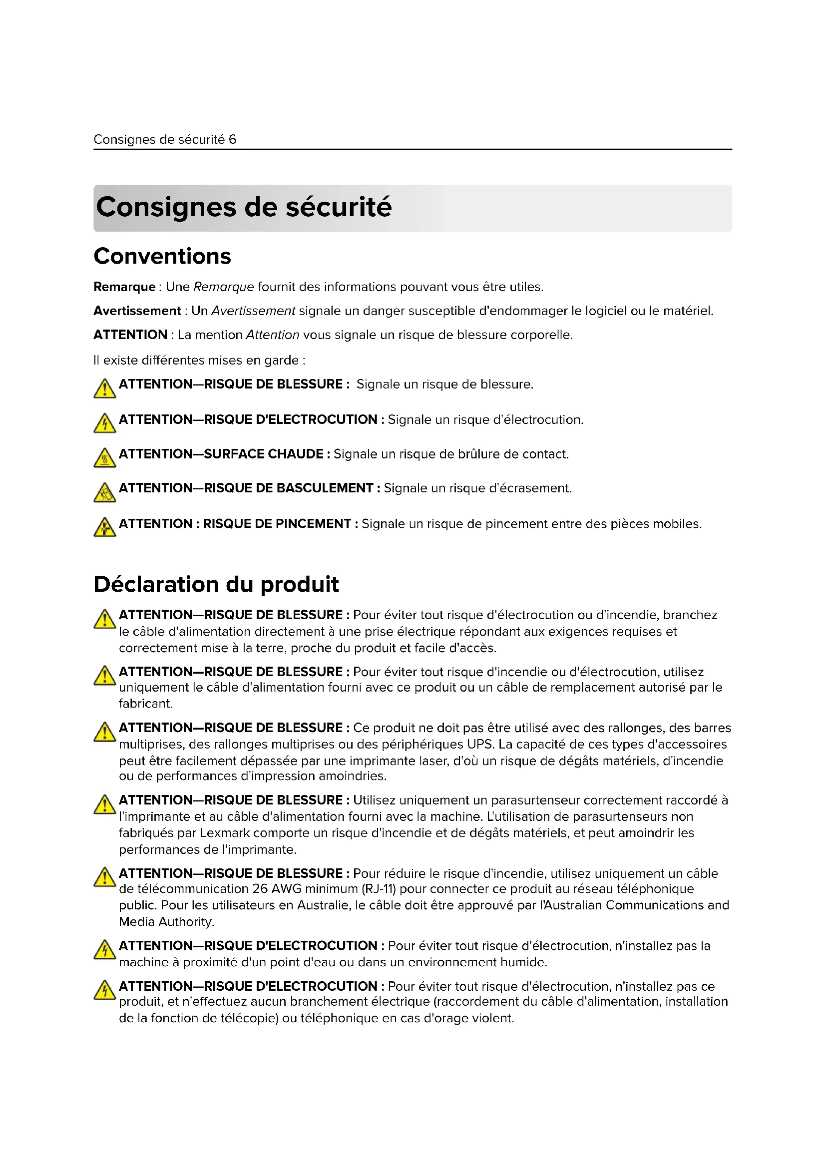 ATTENTION : La mention Attention vous signale un risque de blessure corporelle. Il existe diérentes mises en garde : ATTENTION—RISQUE DE BLESSURE : Signale un risque de blessure. ATTENTION—RISQUE D'ELECTROCUTION : Signale un risque d'électrocution. ATTENTION—SURFACE CHAUDE : Signale un risque de brûlure de contact. ATTENTION—RISQUE DE BASCULEMENT : Signale un risque d'écrasement. ATTENTION : RISQUE DE PINCEMENT : Signale un risque de pincement entre des pièces mobiles. Déclaration du produit ATTENTION—RISQUE DE BLESSURE : Pour éviter tout risque d'électrocution ou d'incendie, branchez le câble d'alimentation directement à une prise électrique répondant aux exigences requises et correctement mise à la terre, proche du produit et facile d'accès. ATTENTION—RISQUE DE BLESSURE : Pour éviter tout risque d'incendie ou d'électrocution, utilisez uniquement le câble d'alimentation fourni avec ce produit ou un câble de remplacement autorisé par le fabricant. ATTENTION—RISQUE DE BLESSURE : Ce produit ne doit pas être utilisé avec des rallonges, des barres multiprises, des rallonges multiprises ou des périphériques UPS. La capacité de ces types d'accessoires peut être facilement dépassée par une imprimante laser, d'où un risque de dégâts matériels, d'incendie ou de performances d'impression amoindries. ATTENTION—RISQUE DE BLESSURE : Utilisez uniquement un parasurtenseur correctement raccordé à l'imprimante et au câble d'alimentation fourni avec la machine. L'utilisation de parasurtenseurs non fabriqués par Lexmark comporte un risque d'incendie et de dégâts matériels, et peut amoindrir les performances de l'imprimante. ATTENTION—RISQUE DE BLESSURE : Pour réduire le risque d'incendie, utilisez uniquement un câble de télécommunication 26 AWG minimum (RJ-11) pour connecter ce produit au réseau téléphonique public. Pour les utilisateurs en Australie, le câble doit être approuvé par l'Australian Communications and Media Authority. ATTENTION—RISQUE D'ELECTROCUTION : Pour éviter tout risque d'électrocution, n'installez pas la machine à proximité d'un point d'eau ou dans un environnement humide. ATTENTION—RISQUE D'ELECTROCUTION : Pour éviter tout risque d'électrocution, n'installez pas ce produit, et n'eectuez aucun branchement électrique (raccordement du câble d'alimentation, installation de la fonction de télécopie) ou téléphonique en cas d'orage violent. Consignes de sécurité 6ATTENTION—RISQUE DE BLESSURE : abstenez-vous de couper, de tordre, de plier, d'écraser le câble d'alimentation ou de poser des objets lourds dessus. Ne le soumettez pas à une usure ou une utilisation abusive. Ne pincez pas le cordon d'alimentation entre des objets, par exemple des meubles, et un mur. Un risque d'incendie ou de choc électrique pourrait s'ensuivre. Vérifez régulièrement que le câble d'alimentation ne présente pas ces problèmes. Avant de l'inspecter, débranchez-le de la prise électrique. ATTENTION—RISQUE D'ELECTROCUTION : Pour éviter tout risque d'électrocution, vérifiez que toutes les connexions externes (telles que les connexions Ethernet et téléphonique) sont correctement installées dans les ports appropriés. ATTENTION—RISQUE D'ELECTROCUTION : Pour éviter tout risque d'électrocution lorsque vous devez accéder à la carte contrôleur, ou installer du matériel en option ou des cartes mémoire alors que l'imprimante est déjà en service, mettez celle-ci hors tension et débranchez son câble d'alimentation de la prise électrique avant de poursuivre. Si d'autres périphériques sont connectés à l'imprimante, mettez- les également hors tension et débranchez tous les câbles reliés à l'imprimante. ATTENTION—RISQUE D'ELECTROCUTION : Pour éviter tout risque d'électrocution, n'utilisez pas la fonction de télécopie en cas d'orage violent. ATTENTION—RISQUE D'ELECTROCUTION : pour éviter tout risque d'électrocution lors du nettoyage de l'extérieur de l'imprimante, débranchez le cordon d'alimentation électrique de la prise et déconnectez tous les câbles de l'imprimante avant de continuer. ATTENTION—RISQUE DE BLESSURE : Si votre imprimante pèse plus de 20 kg (44 lb), l'intervention d'au moins deux personnes est nécessaire pour la soulever sans risque. ATTENTION—RISQUE DE BLESSURE : Avant de déplacer l'imprimante, suivez les instructions ci- dessous pour éviter de vous blesser ou d'endommager l'imprimante :