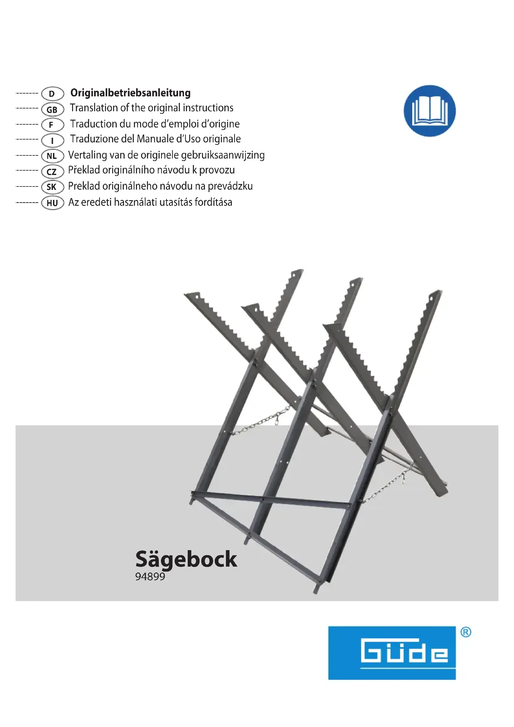 N° de commande .....................................................................................................................................94899 Réglage de la longueur de la fente ................................... ..................................774 x 855 x 1082 mm Poids net/brut ................................................................................................................................. 9,5/10,5 kg - Pièces parfaitement stables distances réglables des pattes d‘appui - Hauteur de travail réglable en continu par réglage variable de l‘angle de la dent de serrage. Utilisation Conforme à la destination - Le chevalet est destiné exclusivement à la coupe du bois de chauffage rond long de 1,0 m et 0,5 m. Instructions De Sécurité - Lors du réglage de la position du chevalet, veillez à ce que la surface d‘emplacement soit la plus horizon- tale possible. - Le chevalet doit être placé sur un support droit et antidérapant. - Le chevalet doit être utilisé par une seule personne. Les autres personnes doivent se tenir à une distance de sécurité minimale de 3 mètres. - Les vis et écrous du chevalet doivent être correcte