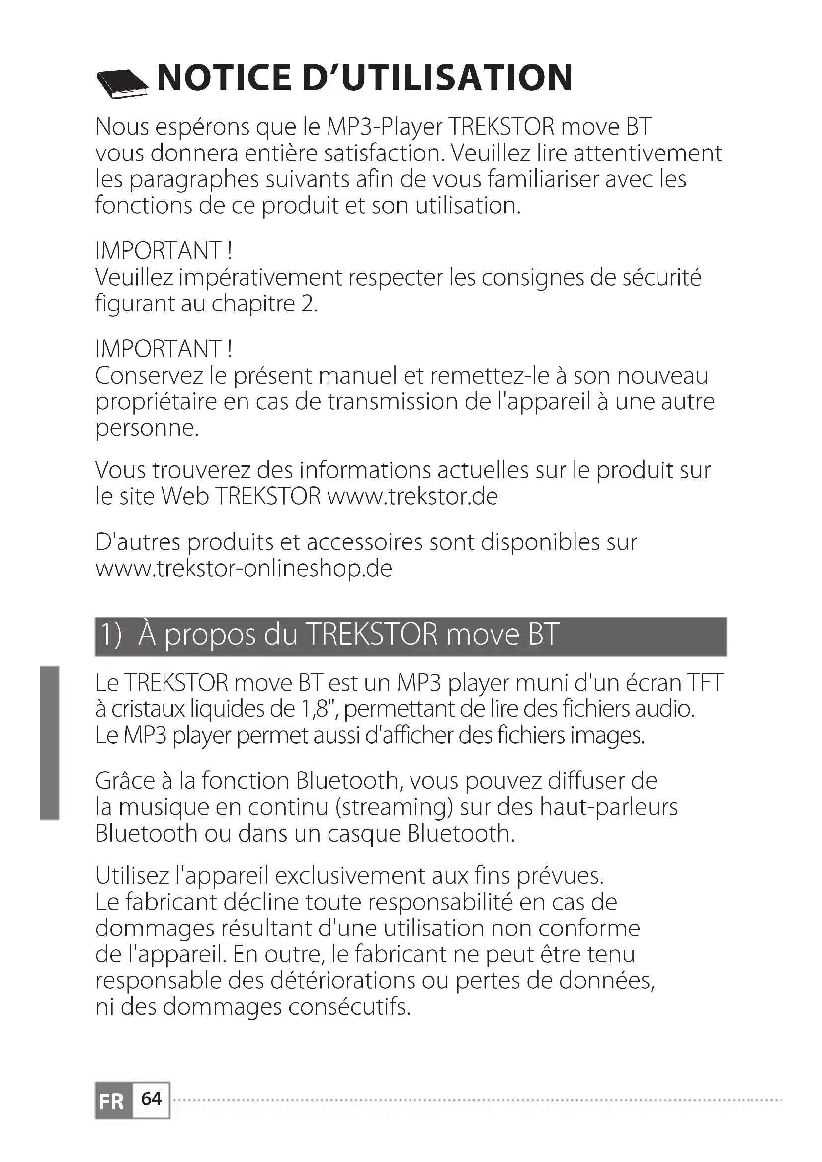 Nous espérons que le MP3-Player TREKSTOR move BT vous donnera entière satisfaction. Veuillez lire attentivement les paragraphes suivants afin de vous familiariser avec les fonctions de ce produit et son utilisation. IMPORTANT ! Veuillez impérativement respecter les consignes de sécurité figurant au chapitre 2. IMPORTANT ! Conservez le présent manuel et remettez-le à son nouveau propriétaire en cas de transmission de l'appareil à une autre personne. Vous trouverez des informations actuelles sur le produit sur le site Web TREKSTOR www.trekstor.de D'autres produits et accessoires sont disponibles sur www.trekstor-onlineshop.de