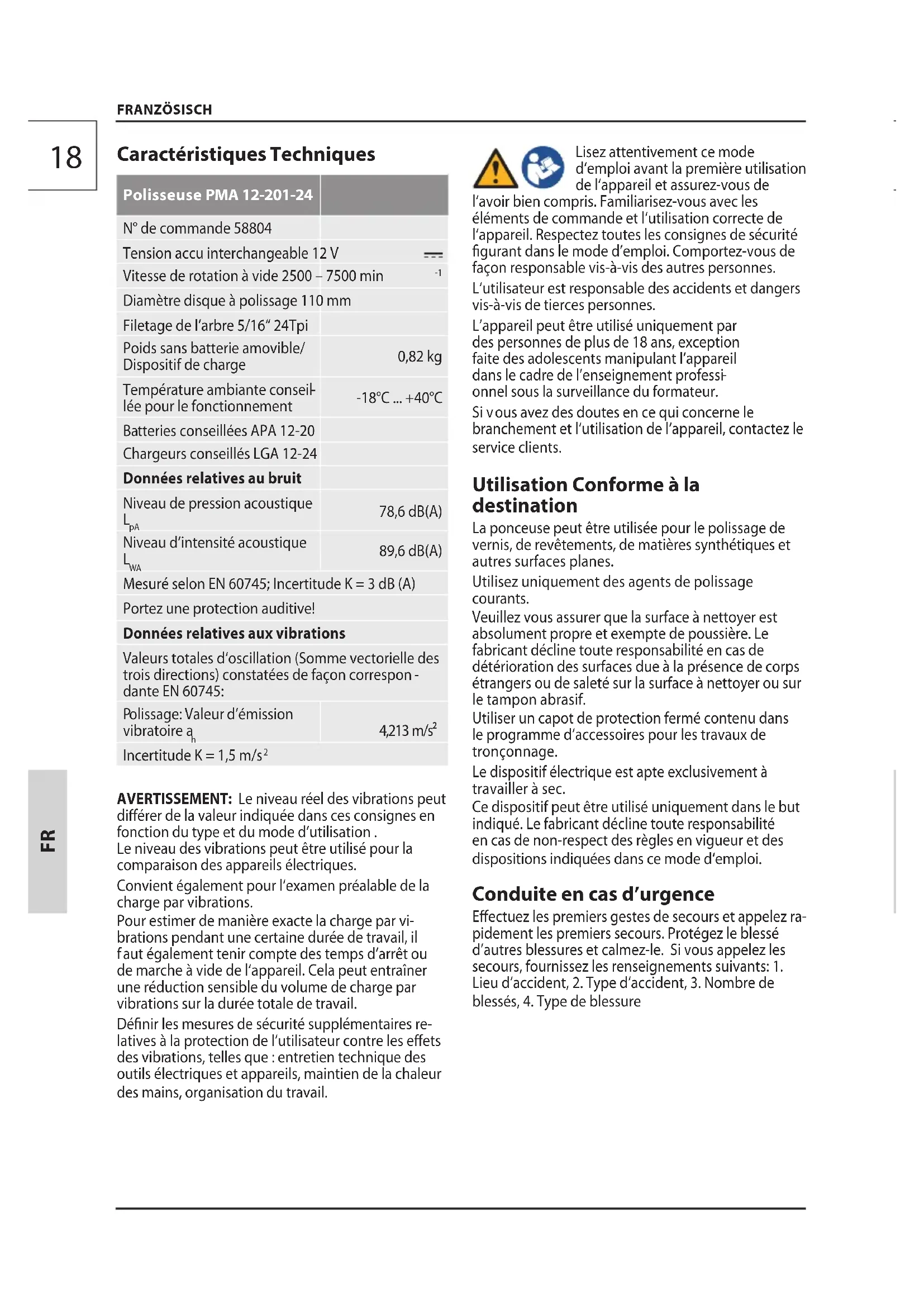 FRANZÖSISCH Caractéristiques Techniques Polisseuse PMA 12-201-24 N° de commande 58804 Tension accu interchangeable 12 V Vitesse de rotation à vide 2500 – 7500 min