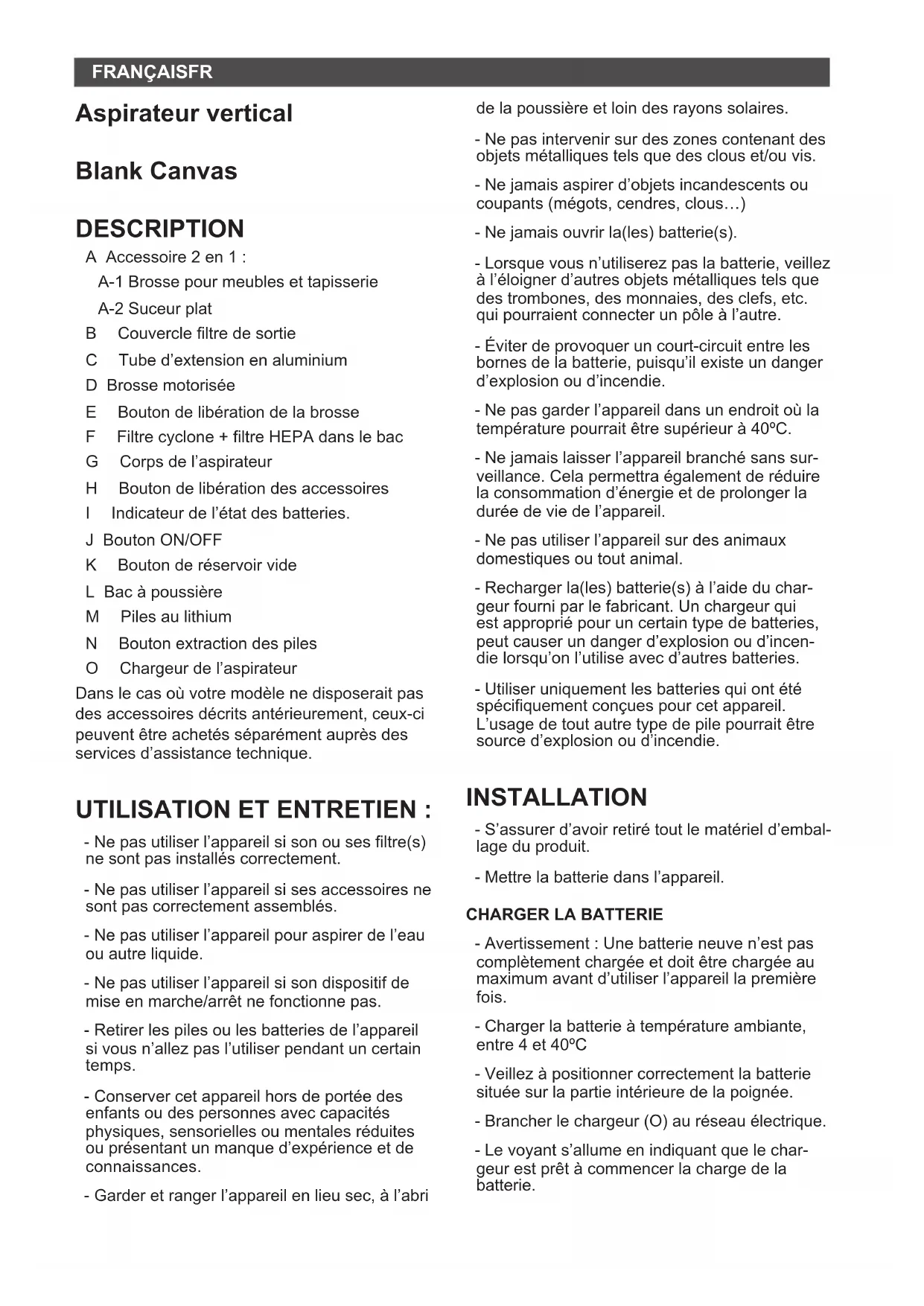 FOLLOWS: - Press the battery removal button and stretch the battery out of the vacuum cleaner body. (Fig. 8)FRANÇAIS FR Aspirateur vertical Blank Canvas DESCRIPTION A Accessoire 2 en 1 : A-1 Brosse pour meubles et tapisserie A-2 Suceur plat B Couvercleltredesortie C Tubed’extensionenaluminium D Brosse motorisée E Boutondelibérationdelabrosse F Filtrecyclone+ltreHEPAdanslebac G Corpsdel’aspirateur H Boutondelibérationdesaccessoires I Indicateurdel’étatdesbatteries. J Bouton ON/OFF K Boutonderéservoirvide L Bac à poussière M Pilesaulithium N Boutonextractiondespiles O Chargeurdel’aspirateur Danslecasoùvotremodèlenedisposeraitpas desaccessoiresdécritsantérieurement,ceux-ci peuventêtreachetésséparémentauprèsdes servicesd’assistancetechnique. UTILISATION ET ENTRETIEN : - Nepasutiliserl’appareilsisonousesltre(s) nesontpasinstalléscorrectement. - Nepasutiliserl’appareilsisesaccessoiresne sontpascorrectementassemblés. - Nepasutiliserl’appareilpouraspirerdel’eau ouautreliquide. - Nepasutiliserl’appareilsisondispositifde miseenmarche/arrêtnefonctionnepas. - Retirerlespilesoulesbatteriesdel’appareil sivousn’allezpasl’utiliserpendantuncertain temps. - Conservercetappareilhorsdeportéedes enfantsoudespersonnesaveccapacités physiques,sensoriellesoumentalesréduites ouprésentantunmanqued’expérienceetde connaissances. - Garderetrangerl’appareilenlieusec,àl’abri delapoussièreetloindesrayonssolaires. - Nepasintervenirsurdeszonescontenantdes objetsmétalliquestelsquedesclouset/ouvis. - Nejamaisaspirerd’objetsincandescentsou coupants(mégots,cendres,clous…) - Nejamaisouvrirla(les)batterie(s). - Lorsquevousn’utiliserezpaslabatterie,veillez àl’éloignerd’autresobjetsmétalliquestelsque destrombones,desmonnaies,desclefs,etc. quipourraientconnecterunpôleàl’autre. - Éviterdeprovoqueruncourt-circuitentreles bornesdelabatterie,puisqu’ilexisteundanger d’explosionoud’incendie. - Nepasgarderl’appareildansunendroitoùla températurepourraitêtresupérieurà40ºC. - Nejamaislaisserl’appareilbranchésanssur- veillance.Celapermettraégalementderéduire laconsommationd’énergieetdeprolongerla duréedeviedel’appareil. - Nepasutiliserl’appareilsurdesanimaux domestiquesoutoutanimal. - Rechargerla(les)batterie(s)àl’aideduchar- geurfourniparlefabricant.Unchargeurqui estappropriépouruncertaintypedebatteries, peutcauserundangerd’explosionoud’incen- dielorsqu’onl’utiliseavecd’autresbatteries. - Utiliseruniquementlesbatteriesquiontété spéciquementconçuespourcetappareil. L’usagedetoutautretypedepilepourraitêtre sourced’explosionoud’incendie. INSTALLATION - S’assurerd’avoirretirétoutlematérield’embal- lageduproduit. - Mettrelabatteriedansl’appareil.