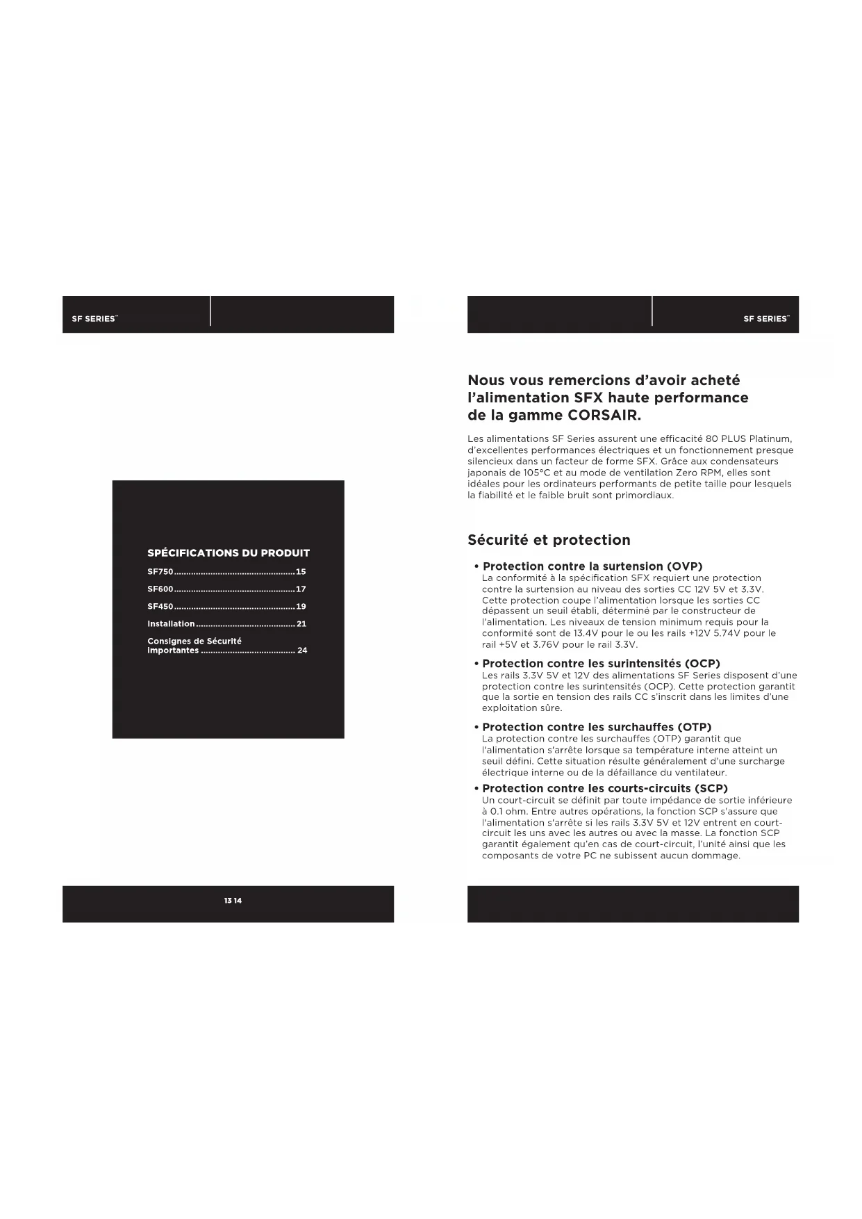 SF .................................................. SF .................................................. SF .................................................. Installation ......................................... ConsignesdeSécurité importantes ....................................... Nous vous remercions d’avoir acheté l’alimentation SFX haute performance de la gamme CORSAIR. Les alimentations SF Series assurent une ecacité 80 PLUS Platinum, d’excellentes performances électriques et un fonctionnement presque silencieux dans un facteur de forme SFX. Grâce aux condensateurs japonais de 105°C et au mode de ventilation Zero RPM, elles sont idéales pour les ordinateurs performants de petite taille pour lesquels la fiabilité et le faible bruit sont primordiaux. Sécurité et protection