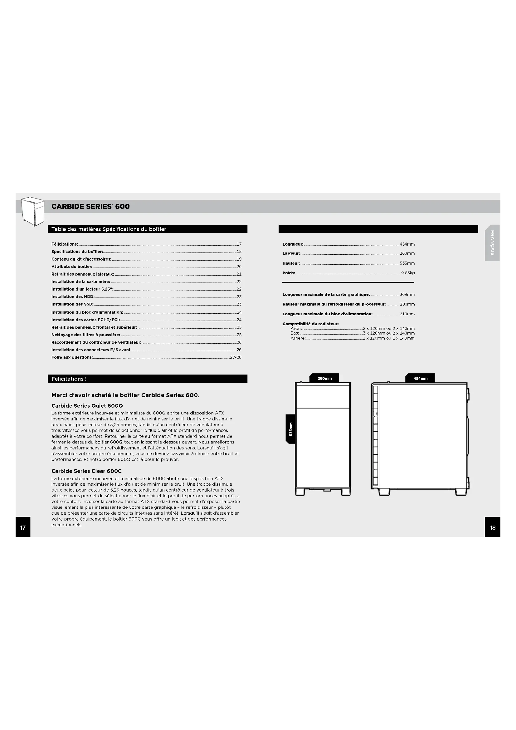 FRANÇAIS Table des matières Spécifications du boîtier Félicitations ! Félicitations ................................................................................................................................................................ Spécificationsduboîtier ....................................................................................................................................... Contenudukitd’accessoires .............................................................................................................................. Attributsduboîtier ................................................................................................................................................. Retraitdespanneauxlatéraux ........................................................................................................................... Installationdelacartemère ............................................................................................................................... Installationdunlecteur ............................................................................................................................ InstallationdesHDD ............................................................................................................................................... InstallationdesSSD ................................................................................................................................................ Installationdublocdalimentation .................................................................................................................. InstallationdescartesPCI-EPCI ...................................................................................................................... Retraitdespanneauxfrontaletsupérieur .................................................................................................... Nettoyagedesfiltresàpoussière ..................................................................................................................... Raccordementducontrôleurdeventilateur ................................................................................................ InstallationdesconnecteursESavant .......................................................................................................... Foireauxquestions ..........................................................................................................................................- Merci d'avoir acheté le boîtier Carbide Series 600. Longueur ................................................................................................mm Largeur ....................................................................................................mm Hauteur ....................................................................................................mm Poids ...........................................................................................................kg Longueurmaximaledelacartegraphique .............................mm Hauteurmaximaledurefroidisseurduprocesseur .............mm Longueurmaximaledublocdalimentation ...........................mm Compatibilitéduradiateur Avant ...........................................................xmmouxmm Bas ................................................................ xmmouxmm Arrière .........................................................xmmouxmm 535mm454mm Carbide Series Quiet 600Q La forme extérieure incurvée et minimaliste du 600Q abrite une disposition ATX inversée afin de maximiser le flux d'air et de minimiser le bruit. Une trappe dissimule deux baies pour lecteur de 5,25 pouces, tandis qu'un contrôleur de ventilateur à trois vitesses vous permet de sélectionner le flux d'air et le profil de performances adaptés à votre confort. Retourner la carte au format ATX standard nous permet de fermer le dessus du boîtier 600Q tout en laissant le dessous ouvert. Nous améliorons ainsi les performances du refroidissement et l'atténuation des sons. Lorsqu'il s'agit d'assembler votre propre équipement, vous ne devriez pas avoir à choisir entre bruit et performances. Et notre boîtier 600Q est là pour le prouver. Carbide Series Clear 600C La forme extérieure incurvée et minimaliste du 600C abrite une disposition ATX inversée afin de maximiser le flux d'air et de minimiser le bruit. Une trappe dissimule deux baies pour lecteur de 5,25 pouces, tandis qu'un contrôleur de ventilateur à trois vitesses vous permet de sélectionner le flux d'air et le profil de performances adaptés à votre confort. Inverser la carte au format ATX standard vous permet d'exposer la partie visuellement la plus intéressante de votre carte graphique – le refroidisseur – plutôt que de présenter une carte de circuits intégrés sans intérêt. Lorsqu'il s'agit d'assembler votre propre équipement, le boîtier 600C vous ore un look et des performances exceptionnels. 260mmCARBIDE SERIES
