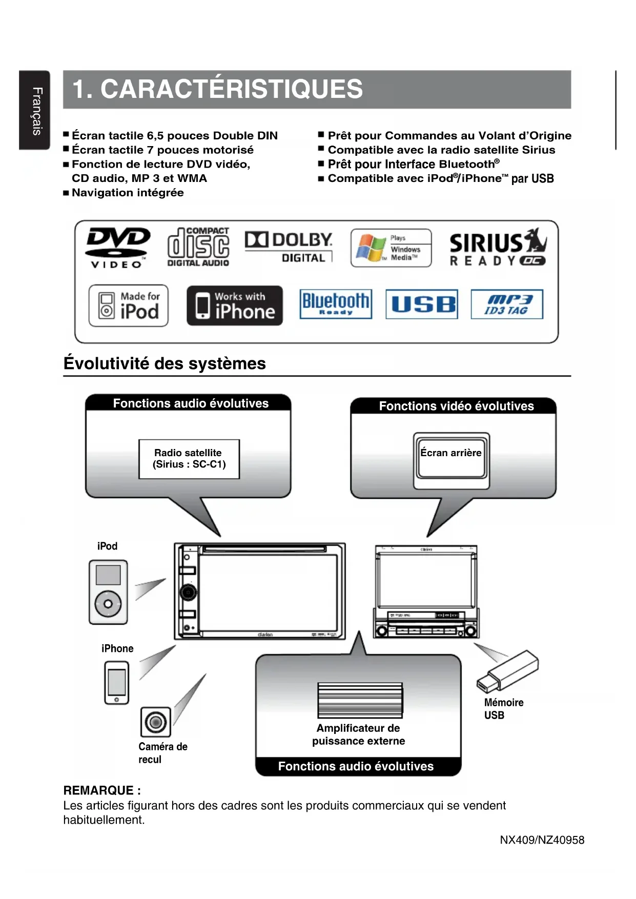 - Connecting to Sirius Satellite Radio Receiver When Sirius Satellite Radio Receiver is to be connected, use the dedicated connector. For detailed information,refer to the instruction manual of the Sirius Satellite Radio Receiver.Français NX409/NZ40956 DONNÉES D’ENREGISTREMENT DU PRODUIT CLARION États-Unis et Canada seulement www.clarion.com À l’intention du client, Nous vous félicitons d’avoir acheté un produit électronique mobile Clarion. Nous sommes persuadés que vous en apprécierez l’expérience. Il existe de nombreux avantages à l’enregistrement de votre produit. Aussi, nous vous invitons à visiter notre site Internet à l’adresse afin de l’enregistrer. Nous en avons d’ailleurs simplifié cet enregistrement grâce à l’aisance d’utilisation du site Internet en question. Le formulaire d’enregistrement est rapide et facile à remplir. Une fois l’enregistrement terminé, nous pouvons vous communiquer des renseignements importants sur le produit. Il suffit d’enregistrer votre produit Clarion à l’adresse www.clarion.com pour en assurer la mise à jour constante.Français NX409/NZ409 57 Table des matières 1. CARACTÉRISTIQUES p. 58