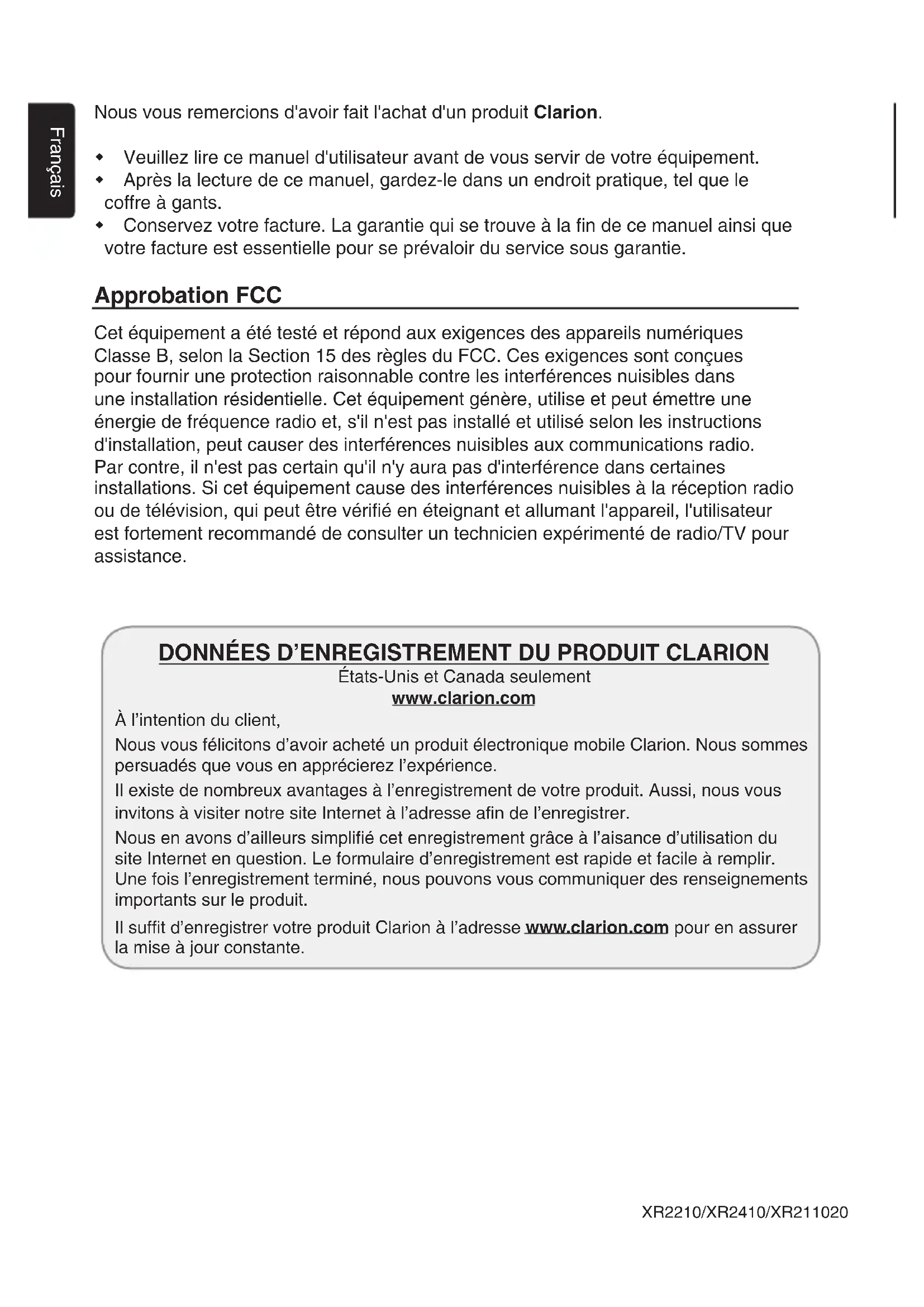 cleaning or adjustments, or labor costs for the removal or reinstallation of the unit for repair. All Clarion cables, wires and other accessories if purchased from an authorized Clarion dealer are warranted against all defects in materials and workmanship for ninety (90) days from the date of original purchase. ALL PURCHASES OF CLARION PRODUCTS FROM NON-AUTHORIZED CLARION DEALERS ARE SUBJECT TO FURTHER WARRANTY RESTRICTIONS AS DESCRIBED BELOW. For USA and Canada onlyFrançais XR2210/XR2410/XR211020 Nous vous remercions d'avoir fait l'achat d'un produit Clarion. Veuillez lire ce manuel d'utilisateur avant de vous servir de votre équipement. Après la lecture de ce manuel, gardez-le dans un endroit pratique, tel que le coffre à gants. Conservez votre facture. La garantie qui se trouve à la fin de ce manuel ainsi que votre facture est essentielle pour se prévaloir du service sous garantie. Approbation FCC Cet équipement a été testé et répond aux exigences des appareils numériques Classe B, selon la Section 15 des règles du FCC. Ces exigences sont conçues pour fournir une protection raisonnable contre les interférences nuisibles dans une installation résidentielle. Cet équipement génère, utilise et peut émettre une énergie de fréquence radio et, s'il n'est pas installé et utilisé selon les instructions d'installation, peut causer des interférences nuisibles aux communications radio. Par contre, il n'est pas certain qu'il n'y aura pas d'interférence dans certaines installations. Si cet équipement cause des interférences nuisibles à la réception radio ou de télévision, qui peut être vérifié en éteignant et allumant l'appareil, l'utilisateur est fortement recommandé de consulter un technicien expérimenté de radio/TV pour assistance. DONNÉES D’ENREGISTREMENT DU PRODUIT CLARION États-Unis et Canada seulement www.clarion.com À l’intention du client, Nous vous félicitons d’avoir acheté un produit électronique mobile Clarion. Nous sommes persuadés que vous en apprécierez l’expérience. Il existe de nombreux avantages à l’enregistrement de votre produit. Aussi, nous vous invitons à visiter notre site Internet à l’adresse afin de l’enregistrer. Nous en avons d’ailleurs simplifié cet enregistrement grâce à l’aisance d’utilisation du site Internet en question. Le formulaire d’enregistrement est rapide et facile à remplir. Une fois l’enregistrement terminé, nous pouvons vous communiquer des renseignements importants sur le produit. Il suffit d’enregistrer votre produit Clarion à l’adresse www.clarion.com pour en assurer la mise à jour constante.Français XR2210/XR2410/XR2110
