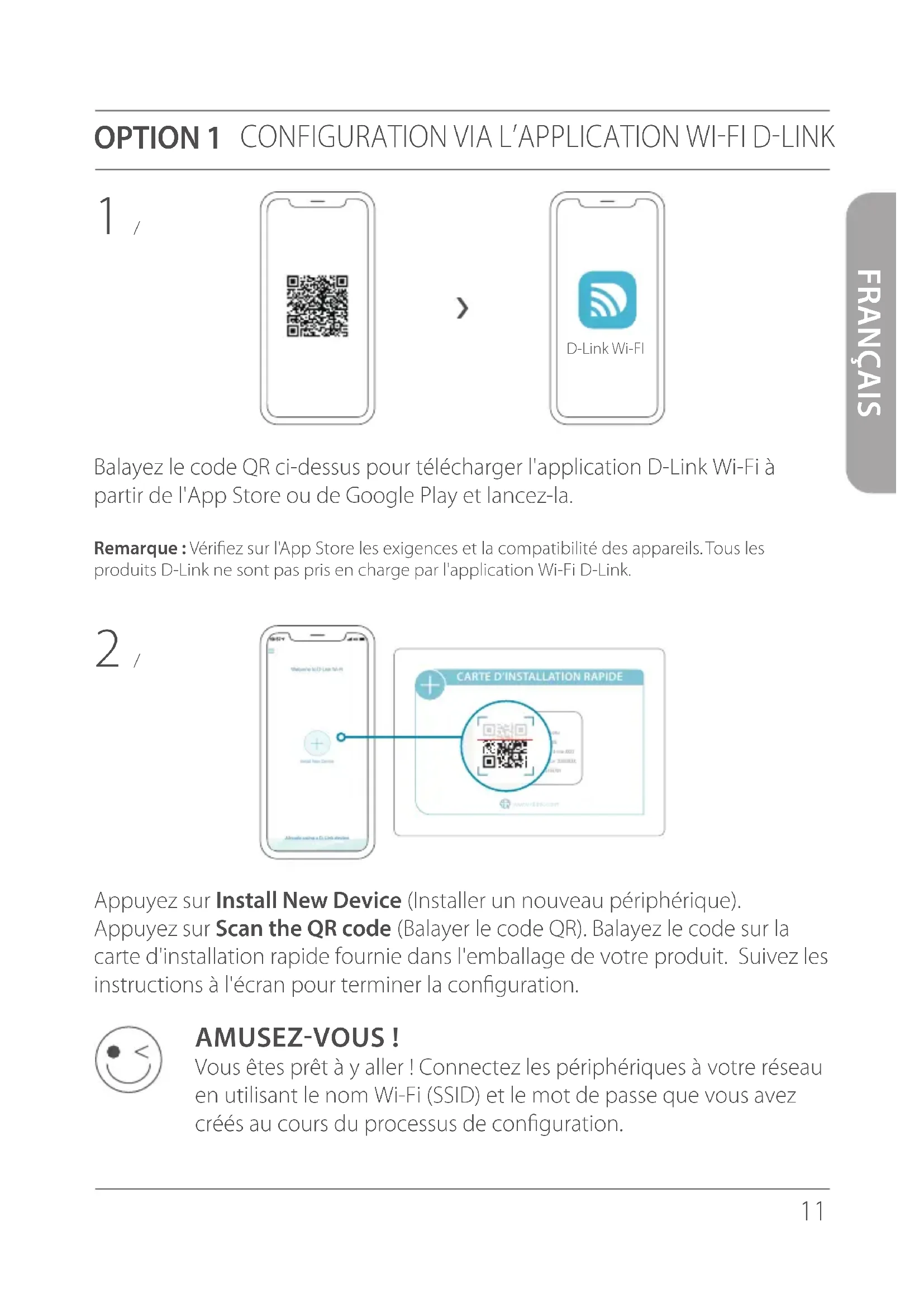 www.dlink.com Nom du modèle: PÉRIPHÉRIQUE Nom Wi-Fi: d-link-XXXX Mot de passe: XXXXXXXX N/S: 123456789 AMUSEZ-VOUS! Vous êtes prêt à y aller ! Connectez les périphériques à votre réseau en utilisant le nom Wi-Fi (SSID) et le mot de passe que vous avez créés au cours du processus de configuration. D-Link Wi-FI12 FRANÇAIS OPTION 2