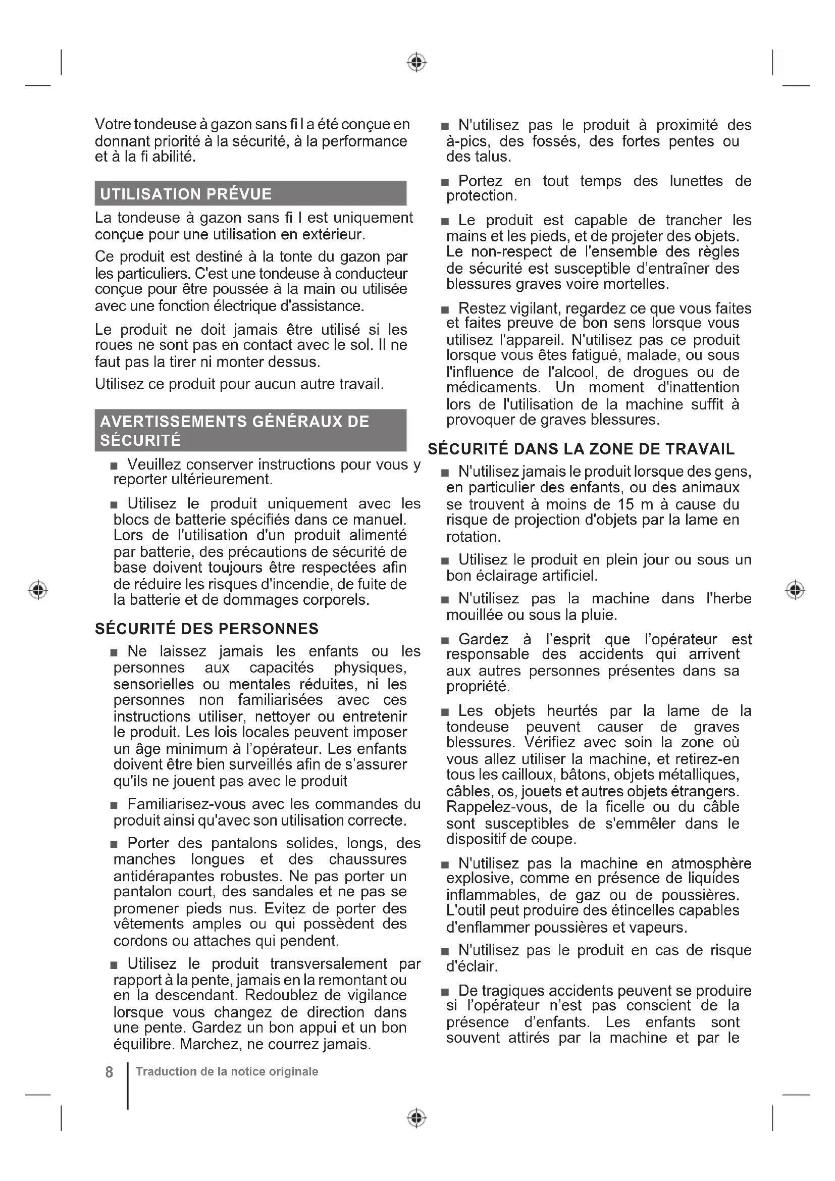 ■ Ne laissez jamais les enfants ou les personnes aux capacités physiques, sensorielles ou mentales réduites, ni les personnes non familiarisées avec ces instructions utiliser, nettoyer ou entretenir le produit. Les lois locales peuvent imposer un âge minimum à l’opérateur. Les enfants doivent être bien surveillés afin de s’assurer qu'ils ne jouent pas avec le produit ■ Familiarisez-vous avec les commandes du produit ainsi qu'avec son utilisation correcte. ■ Porter des pantalons solides, longs, des manches longues et des chaussures antidérapantes robustes. Ne pas porter un pantalon court, des sandales et ne pas se promener pieds nus. Evitez de porter des vêtements amples ou qui possèdent des cordons ou attaches qui pendent. ■ Utilisez le produit transversalement par rapport à la pente, jamais en la remontant ou en la descendant. Redoublez de vigilance lorsque vous changez de direction dans une pente. Gardez un bon appui et un bon équilibre. Marchez, ne courrez jamais. ■ N'utilisez pas le produit à proximité des à-pics, des fossés, des fortes pentes ou des talus. ■ Portez en tout temps des lunettes de protection. ■ Le produit est capable de trancher les mains et les pieds, et de projeter des objets. Le non-respect de l'ensemble des règles de sécurité est susceptible d’entraîner des blessures graves voire mortelles. ■ Restez vigilant, regardez ce que vous faites et faites preuve de bon sens lorsque vous utilisez l'appareil. N'utilisez pas ce produit lorsque vous êtes fatigué, malade, ou sous l'influence de l'alcool, de drogues ou de médicaments. Un moment d'inattention lors de l'utilisation de la machine suffit à provoquer de graves blessures. SÉCURITÉ DANS LA ZONE DE TRAVAIL ■ N'utilisez jamais le produit lorsque des gens, en particulier des enfants, ou des animaux se trouvent à moins de 15 m à cause du risque de projection d'objets par la lame en rotation. ■ Utilisez le produit en plein jour ou sous un bon éclairage artificiel. ■ N'utilisez pas la machine dans l'herbe mouillée ou sous la pluie. ■ Gardez à l’esprit que l’opérateur est responsable des accidents qui arrivent aux autres personnes présentes dans sa propriété. ■ Les objets heurtés par la lame de la tondeuse peuvent causer de graves blessures. Vérifiez avec soin la zone où vous allez utiliser la machine, et retirez-en tous les cailloux, bâtons, objets métalliques, câbles, os, jouets et autres objets étrangers. Rappelez-vous, de la ficelle ou du câble sont susceptibles de s'emmêler dans le dispositif de coupe. ■ N'utilisez pas la machine en atmosphère explosive, comme en présence de liquides inflammables, de gaz ou de poussières. L'outil peut produire des étincelles capables d'enflammer poussières et vapeurs. ■ N'utilisez pas le produit en cas de risque d'éclair. ■ De tragiques accidents peuvent se produire si l’opérateur n’est pas conscient de la présence d’enfants. Les enfants sont souvent attirés par la machine et par leFRANÇAIS