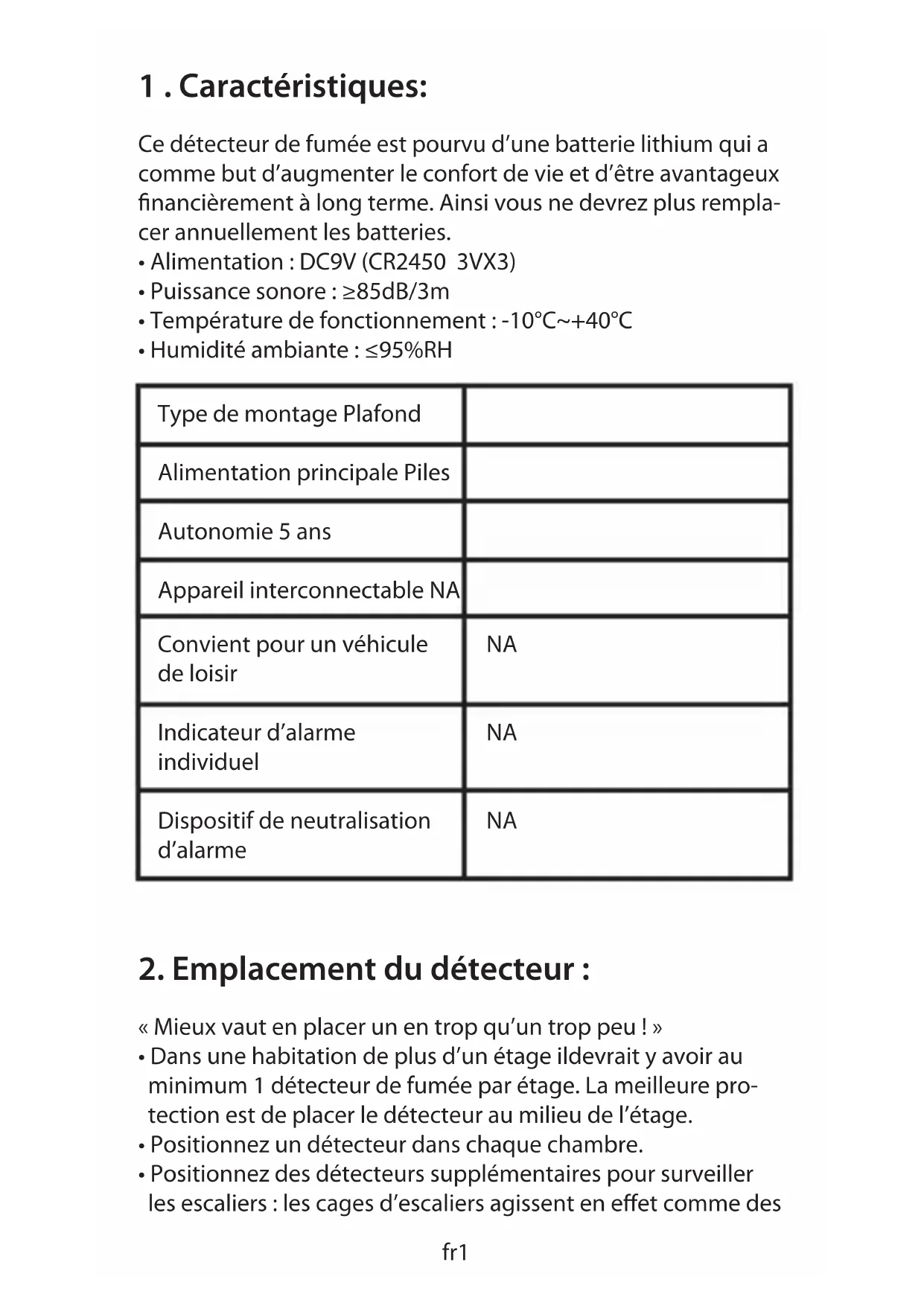 - Positionnez des détecteurs supplémentaires pour surveiller les escaliers : les cages d’escaliers agissent en eet comme des fr1 Type de montage Plafond Alimentation principale Piles Autonomie 5 ans Appareil interconnectable NA Convient pour un véhicule de loisir
