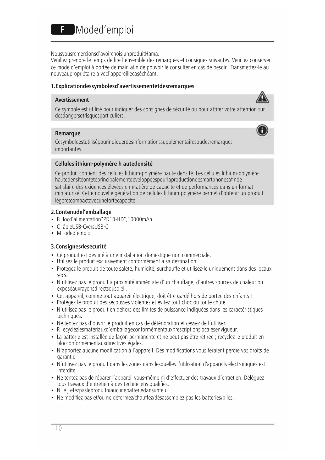 PD10HD 00187261 - Batterie portable HAMA - Notice d'utilisation et mode d'emploi gratuit