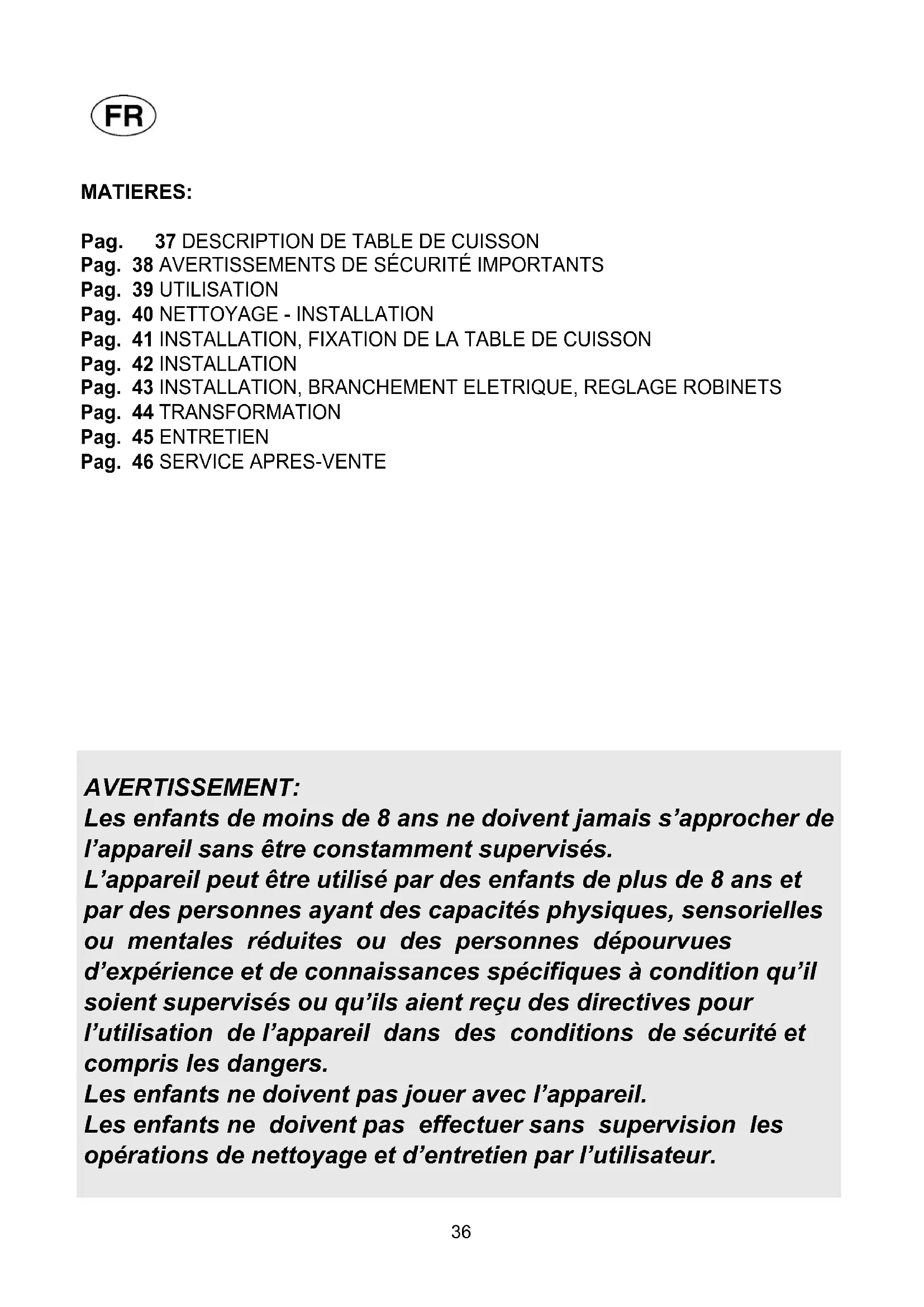 Les enfants de moins de 8 ans ne doivent jamais s’approcher de l’appareil sans être constamment supervisés. L’appareil peut être utilisé par des enfants de plus de 8 ans et par des personnes ayant des capacités physiques, sensorielles ou mentales réduites ou des personnes dépourvues d’expérience et de connaissances spécifiques à condition qu’il soient supervisés ou qu’ils aient reçu des directives pour l’utilisation de l’appareil dans des conditions de sécurité et compris les dangers. Les enfants ne doivent pas jouer avec l’appareil. Les enfants ne doivent pas effectuer sans supervision les opérations de nettoyage et d’entretien par l’utilisateur. MATIERES: Pag.