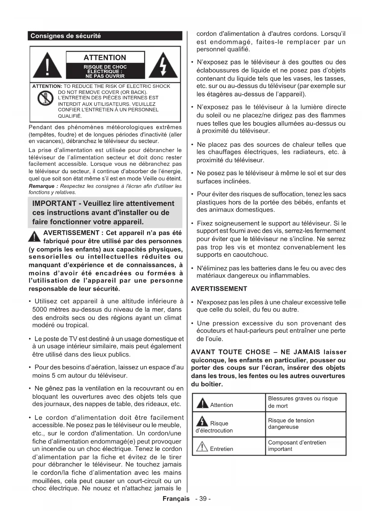 QUALIFIÉ. Remarque : Respectez les consignes à l'écran afin d'utiliser les fonctions y relatives. Pendant des phénomènes météorologiques extrêmes (tempêtes, foudre) et de longues périodes d'inactivité (aller en vacances), débranchez le téléviseur du secteur. La prise d’alimentation est utilisée pour débrancher le téléviseur de l’alimentation secteur et doit donc rester facilement accessible. Lorsque vous ne débranchez pas le téléviseur du secteur, il continue d’absorber de l’énergie, quel que soit son état même s’il est en mode Veille ou éteint. IMPORTANT - Veuillez lire attentivement ces instructions avant d'installer ou de faire fonctionner votre appareil.