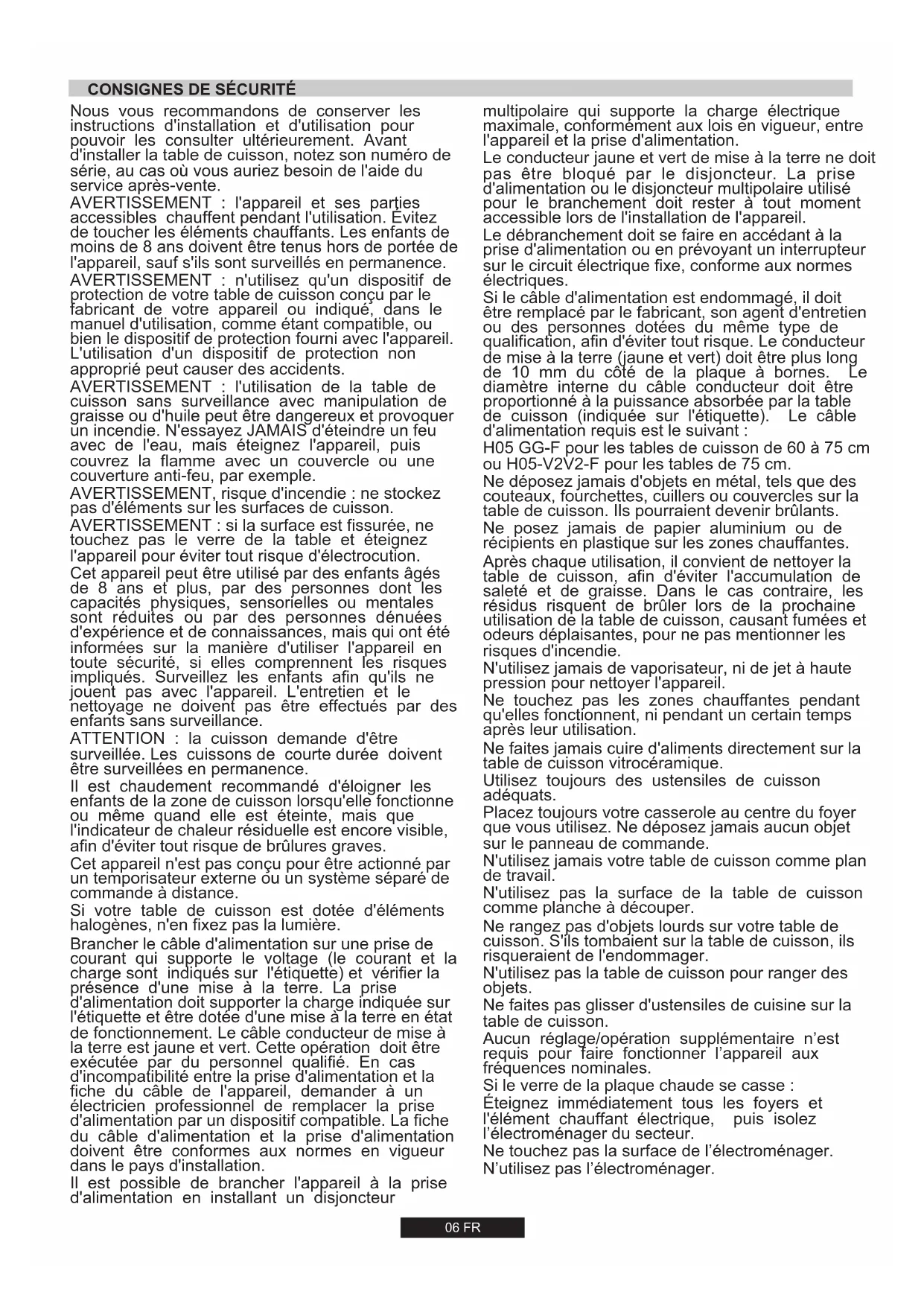 Si le câble d'alimentation est endommagé, il doit être remplacé par le fabricant, son agent d'entretien ou des personnes dotées du même type de qualification, afin d'éviter tout risque. Le conducteur de mise à la terre (jaune et vert) doit être plus long de 10 mm du côté de la plaque à bornes. Le diamètre interne du câble conducteur doit être proportionné à la puissance absorbée par la table de cuisson (indiquée sur l'étiquette). Le câble d'alimentation requis est le suivant : N'utilisez jamais de vaporisateur, ni de jet à haute pression pour nettoyer l'appareil. Ne touchez pas les zones chauffantes pendant qu'elles fonctionnent, ni pendant un certain temps après leur utilisation. Après chaque utilisation, il convient de nettoyer la table de cuisson, afin d'éviter l'accumulation de saleté et de graisse. Dans le cas contraire, les résidus risquent de brûler lors de la prochaine utilisation de la table de cuisson, causant fumées et odeurs déplaisantes, pour ne pas mentionner les risques d'incendie. Ne faites jamais cuire d'aliments directement sur la table de cuisson vitrocéramique. Le conducteur jaune et vert de mise à la terre ne doit pas être bloqué par le disjoncteur. La prise d'alimentation ou le disjoncteur multipolaire utilisé pour le branchement doit rester à tout moment accessible lors de l'installation de l'appareil. Utilisez toujours des ustensiles de cuisson adéquats. Placez toujours votre casserole au centre du foyer que vous utilisez. Ne déposez jamais aucun objet sur le panneau de commande. N'utilisez jamais votre table de cuisson comme plan de travail. N'utilisez pas la surface de la table de cuisson comme planche à découper. Le débranchement doit se faire en accédant à la prise d'alimentation ou en prévoyant un interrupteur sur le circuit électrique fixe, conforme aux normes électriques. multipolaire qui supporte la charge électrique maximale, conformément aux lois en vigueur, entre l'appareil et la prise d'alimentation. H05 GG-F pour les tables de cusson de 60 à 75 cm ou H05-V2V2-F pour les tables de 75 cm. Ne posez jamais de papier aluminium ou de récipients en plastique sur les zones chauffantes. Ne déposez jamais d'objets en métal, tels que des couteaux, fourchettes, cuillers ou couvercles sur la table de cuisson. Ils pourraient devenir brûlants. Étegnez mmédatement tous les foyers et l'élément chauffant électrque, pus solez l’électroménager du secteur. Ne touchez pas la surface de l’électroménager. N’utlsez pas l’électroménager. Ne rangez pas d'objets lourds sur votre table de cuisson. S'ils tombaient sur la table de cuisson, ils risqueraient de l'endommager. N'utilisez pas la table de cuisson pour ranger des objets. Ne faites pas glisser d'ustensiles de cuisine sur la table de cuisson. Aucun réglage/opératon supplémentare n’est requs pour fare fonctonner l’apparel aux fréquences nomnales. S le verre de la plaque chaude se casse :07 FR Lors de la mise en place du joint sur la partie arrière, veiller à ne pas obstruer les passages d'air nécessaires à la combustion. Le meuble ou le support dans lequel doit être encastrée la table, ainsi que les parois du meuble qui pourraient juxtaposer celui-ci, doivent être d'une matière résistant à une température élevée (jusqu'à 100°C) et d'une épaisseur comprise entre 25 et 45 mm. Les dimensions d'encastrement sont indiquées sur le schéma 2. Si, en fonction de l'installation de la table, la partie inférieure de son caisson se trouve à proximité d'une zone normalement accessible lors de manipulations et/ou de rangements, placer une cloison (bois ou similaire) pour éviter tous risques de brûlure ou de détérioration (schéma 2). Si la table est installée entre deux meubles de cuisine, la distance entre la table et les meubles doit être au moins de 17 cm (60 cm) ou 25 cm (75 cm) (voir schéma 2); tandis que la distance entre la table et le mur du fond doit être au moins de 70 mm. La distance entre la table et tout autre appareil ou meuble situé au dessus (par exemple une hotte) doit être au moins de 70 cm (voir schéma 4). Les objets en métal contenus dans le tiroir peuvent atteindre une température très élevée, à cause du système de recirculation d'air. Il est donc recommandé d'interposer un panneau en bois. Attention : Lors de la mise en place, un soin particulier doit être porté au joint entourant le bord de la table afin d'éviter toute infiltration dans le meuble support (schéma 1). Le caisson de la table est équipé en dessous de 4 emplacements prévus pour recevoir les brides de fixation destinées à l'immobilisation de la table sur le meuble. Placer les 4 brides de fixation de manière à ce que la table de travail soit parfaitement plaquée au meuble. Si c'est une table de 60cm de ou table de 75cm de large qui est installée au-dessus du four, ce dernier doit être équipé d'une ventilation tangentielle. 1.1. ENCASTREMENT 1.2. CARACTERISTIQUES REQUISES La VMC devrait être en mesure d'apporter un changement complet de l'air de la cuisine 3 à 5 fois par heure. L'installateur doit installer la VMC conformément aux règles en vigueur dans le pays d'installation. Cet appareil doit être installé en conformité avec la réglementation en vigueur et utilisé uniquement dans un espace ventilé. Lisez les instructions avant d'installer ou utiliser cet appareil. Une utilisation intensive et prolongée de l'appareil peut requérir une ventilation plus importante, telle que l'ouverture d'une fenêtre ou une puissance d'aspiration plus intense de la VMC si vous en êtes équipés. S'il n'est pas possible d'installer une hotte, une VMC devrait être installée sur un mur donnant sur l'extérieur ou sur une fenêtre.