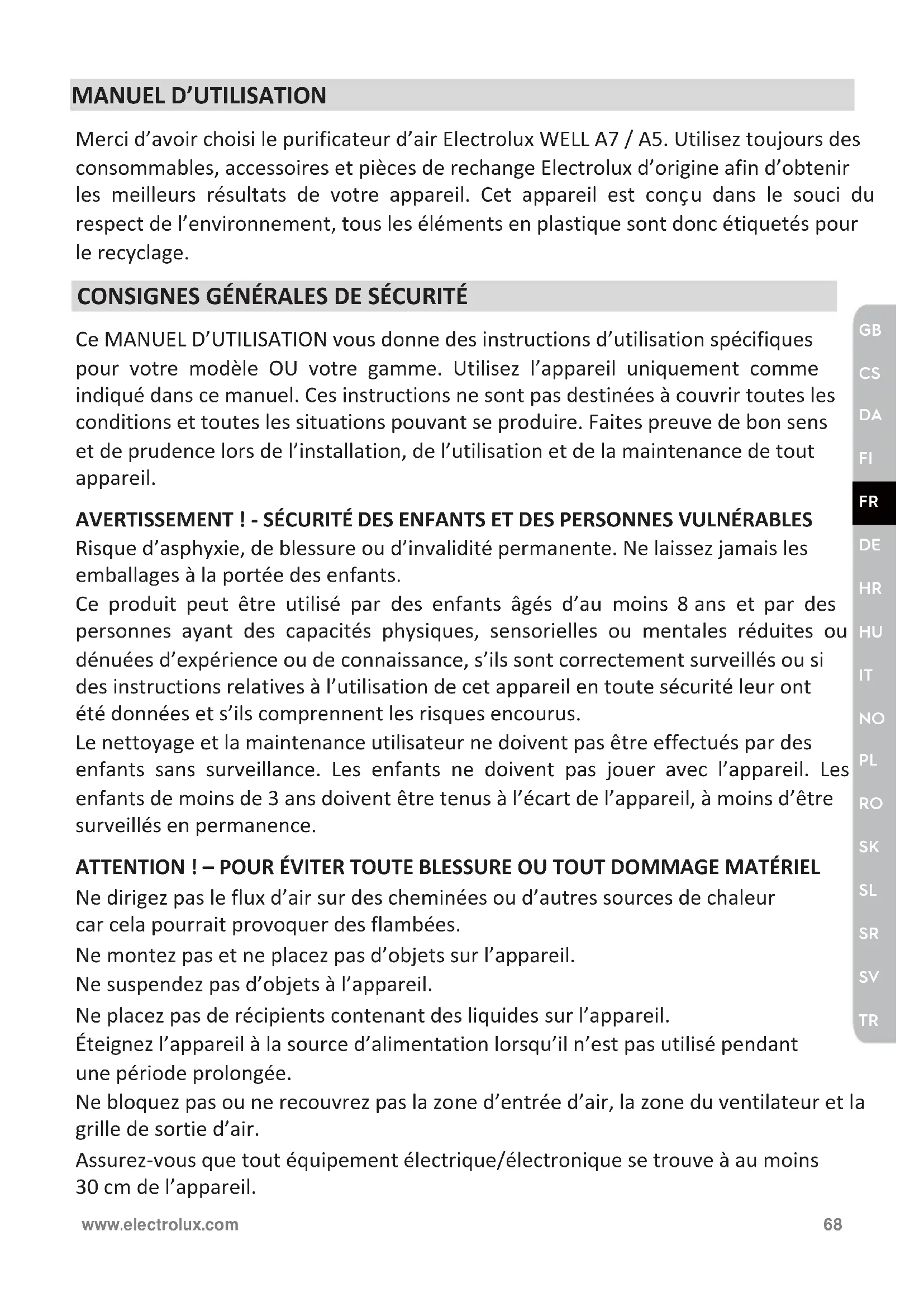 Merci d’avoir choisi le purificateur d’air Electrolux WELL A7 / A5. Utilisez toujours des consommables, accessoires et pièces de rechange Electrolux d’origine afin d’obtenir les meilleurs résultats de votre appareil. Cet appareil est conçu dans le souci du respect de l’environnement, tous les éléments en plastique sont donc étiquetés pour le recyclage. CONSIGNES GÉNÉRALES DE SÉCURITÉ