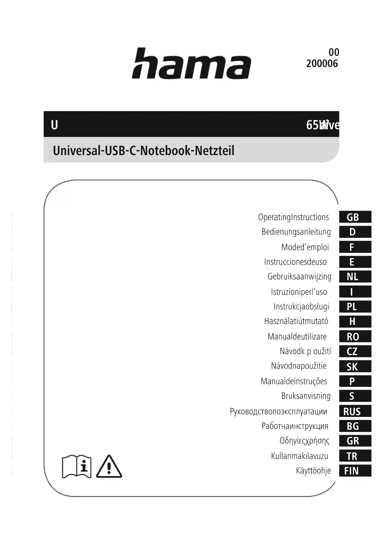 Températureambiante 0° –35° C Indications prévues par le règlement (CE) 2019/1782 Raison sociale ou marque dé posée, numérod’enregistre ment au registreducommerce et adresse du fabricant Hama, HRA12159, Dresdner Str. 9, 86653 Monheim Référence du modèle 00200006 Tension d’entrée 100 –240 V Fréquence du CA d’entrée 50/60Hz Tension de sortie / Courant de sortie/ Puissance de sortie