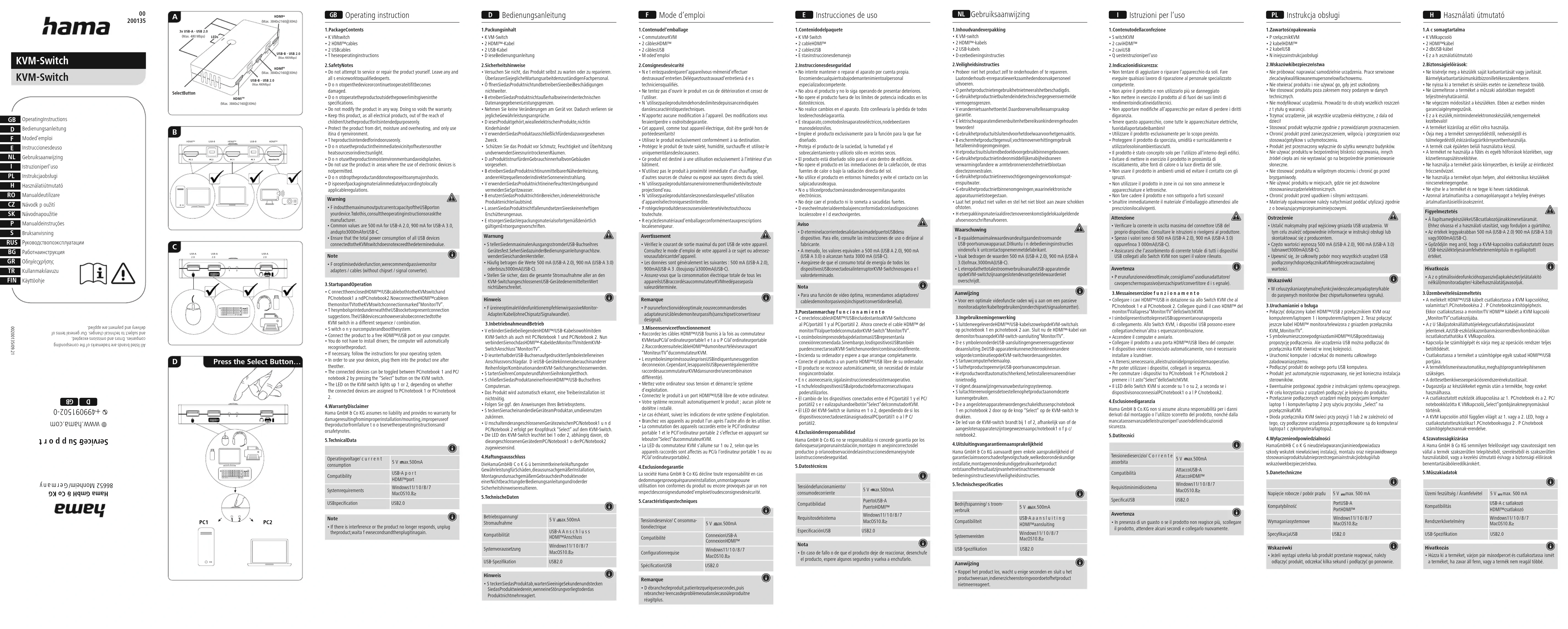- LaLED du commutateur KVM s’allume sur 1ou2,selon que les appareils raccordés sont affectés au PC/à l’ordinateur portable 1ouau PC/à l’ordinateur portable 2.4. Exclusion de garantie La société Hama GmbH &CoKGdécline toute responsabilité en cas de dommages provoqués par une installation, un montage ou une utilisation non conformes du produit ou encoreprovoqués par un non respect des consignes du mode d‘emploi et/ou des consignes de sécurité.5. Caractéristiques techniquesTension de service /Consomma-tion électrique5V max. 500 mACompatibilitéConnexion USB-AConnexion HDMI™Con guration requiseWindows 11/10/8/7Mac OS 10.8 ≥Spécication USB USB 2.0Remarque•Débranchez le produit, patientez quelques secondes, puisrebranchez-le en cas de problème ou dans le cas où le produit neréagit plus.1. Contenido del paquete•KVM-Switch•2cable HDMI™•2cables USB•Estas instrucciones de manejo2. Instrucciones de seguridad