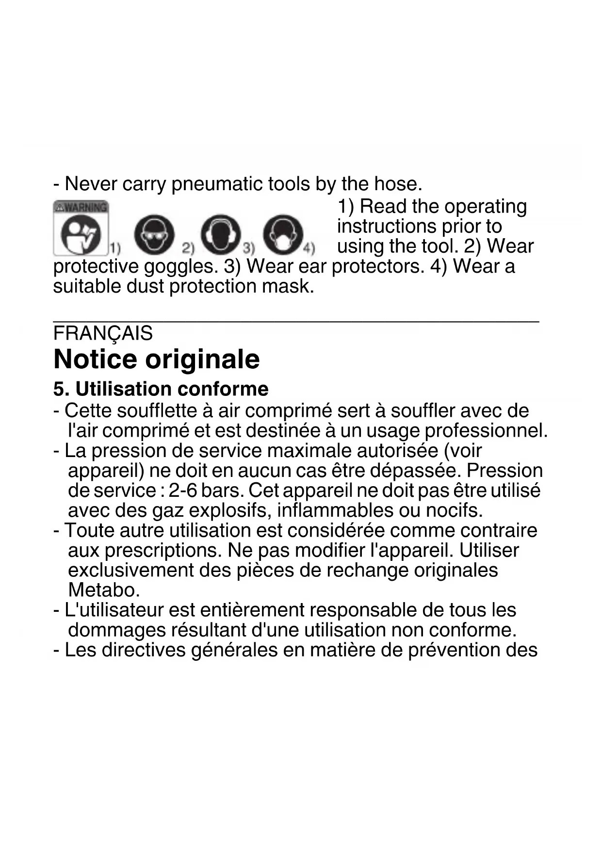 - Cette soufflette à air comprimé sert à souffler avec de l'air comprimé et est destinée à un usage professionnel. - La pression de service maximale autorisée (voir appareil) ne doit en aucun cas être dépassée. Pression de service : 2-6 bars. Cet appareil ne doit pas être utilisé avec des gaz explosifs, inflammables ou nocifs. - Toute autre utilisation est considérée comme contraire aux prescriptions. Ne pas modifier l'appareil. Utiliser exclusivement des pièces de rechange originales Metabo. - L'utilisateur est entièrement responsable de tous les dommages résultant d'une utilisation non conforme. - Les directives générales en matière de prévention desaccidents doivent être respectées.