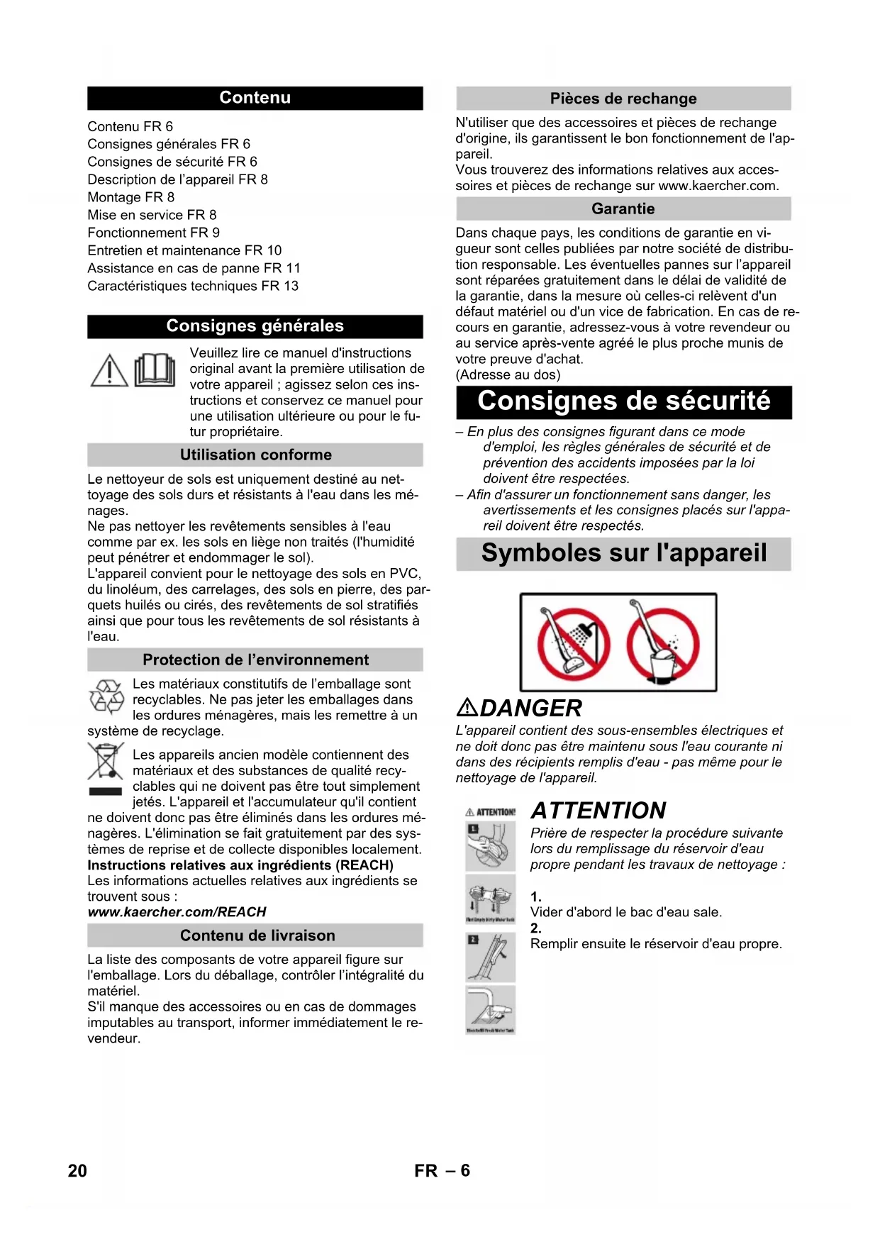 Replace the cleaning rollers. The detergent has been forgotten, an incorrect dosage is being used or the incorrect detergent is being used Use only KÄRCHER detergent and be sure to use the correct dosage. Floor head cover not installed correctly Check that the floor head cover is correctly seated. For this, remove the cover and then fit it back in place. Note Slight foam formation in the floor head during operation is normal and does not impair functionality. Further measures are only necessary when there is excessive foam formation (e.g. streaks of foam on the floor). Incorrect detergent or incorrect dosage. Use only KÄRCHER detergent and be sure to use the correct dosage. Device operation is based on the cleaning rollers re- moving dirt. Dirt and detergent residues from floor cov- erings collect in the waste water tank. This can lead to foam formation under some circumstances. Clean the waste water tank, floor head cover and cleaning rollers. The rollers are dirty. Clean the rollers. Rollers are not being sufficiently moistened. Moisten the rollers by moving back and forth over the same position. Incorrect detergent or incorrect dosage. Use only KÄRCHER detergent and be sure to use the correct dosage. Foreign detergents are present on the floor. Remove all detergent residues from the rollers us- ing water. Clean the floor several times using the device and clean rollers, without using detergent. This re- moves detergent residues from the floor Detergents and care products Troubleshooting Battery is not charging The device cannot be switched on LED fault display Rollers are too dry Appliance is not sucking up dirt Formation of foam in the floor head and on the floor Poor cleaning result 18 EN– 12 Rollers are blocked. Remove rollers and check if an object has become stuck in the rollers. Check that the rollers are screwed in as far as they will go onto the roller holder. Check that the floor head cover is correctly seated. For this, remove the cover and then fit it back in place. Floor head cover not installed correctly Check that the floor head cover is correctly seated. For this, remove the cover and then fit it back in place. The rollers are worn out. Replace the rollers. Waste water tank is overfilled. Empty the waste water tank right away. Waste water tank does not fit properly in the appliance. Check that the floor head cover is firmly seated on the waste water tank. Check that the waste water tank flaps are correctly closed. ATTENTION Do not remove the handle from the basic unit once it has been assembled. The handle may only be removed from the basic unit if the unit is sent out for service purposes. Illustration See illustration at the end of the operating instructions Insert screwdriver at a 90 degree angle in the small opening at the rear side of the handle and remove handle. ATTENTION Please ensure that the connection cable between the basic unit and the handle are not damaged. Pull carefully to avoid damaging the device. Subject to technical modifications! Rollers do not turn Water vacuuming not optimum Appliance is leaking waste water. Removing the handle from the basic unit Technical specifications Electrical connection Voltage 100-240 V 1~50-60 Hz Protection class IPX4 Device Protective class III Charger protection class II Rated power of appliance 40 W Nominal battery voltage 7,2-7,4 V Battery type Li-Ion Operating time with full charge 20 min Charging time for empty battery 4 h Charger initial voltage: 9,5 V Output current, charger 0,6 A Performance data Roller revolutions per minute 500 rpm Filling quantity Fresh water tank 360 ml waste water tank 140 ml Dimensions Weight (without accessories and cleaning fluids) 2,4 kg Length 305 mm Width 226 mm Height 1220 mm 19EN– 6 Veuillez lire ce manuel d'instructions original avant la première utilisation de votre appareil ; agissez selon ces ins-tructions et conservez ce manuel pour une utilisation ultérieure ou pour le fu-tur propriétaire.Le nettoyeur de sols est uniquement destiné au net-toyage des sols durs et résistants à l'eau dans les mé-nages.Ne pas nettoyer les revêtements sensibles à l'eau comme par ex. les sols en liège non traités (l'humidité peut pénétrer et endommager le sol).L'appareil convient pour le nettoyage des sols en PVC, du linoléum, des carrelages, des sols en pierre, des par-quets huilés ou cirés, des revêtements de sol stratifiés ainsi que pour tous les revêtements de sol résistants à l'eau.Les matériaux constitutifs de l’emballage sont recyclables. Ne pas jeter les emballages dans les ordures ménagères, mais les remettre à un système de recyclage.Les appareils ancien modèle contiennent des matériaux et des substances de qualité recy-clables qui ne doivent pas être tout simplement jetés. L'appareil et l'accumulateur qu'il contient ne doivent donc pas être éliminés dans les ordures mé-nagères. L'élimination se fait gratuitement par des sys-tèmes de reprise et de collecte disponibles localement.Instructions relatives aux ingrédients (REACH)Les informations actuelles relatives aux ingrédients se trouvent sous : www.kaercher.com/REACHLa liste des composants de votre appareil figure sur l'emballage. Lors du déballage, contrôler l’intégralité du matériel.S'il manque des accessoires ou en cas de dommages imputables au transport, informer immédiatement le re-vendeur.N'utiliser que des accessoires et pièces de rechange d'origine, ils garantissent le bon fonctionnement de l'ap-pareil.Vous trouverez des informations relatives aux acces-soires et pièces de rechange sur www.kaercher.com.Dans chaque pays, les conditions de garantie en vi-gueur sont celles publiées par notre société de distribu-tion responsable. Les éventuelles pannes sur l’appareil sont réparées gratuitement dans le délai de validité de la garantie, dans la mesure où celles-ci relèvent d'un défaut matériel ou d'un vice de fabrication. En cas de re-cours en garantie, adressez-vo