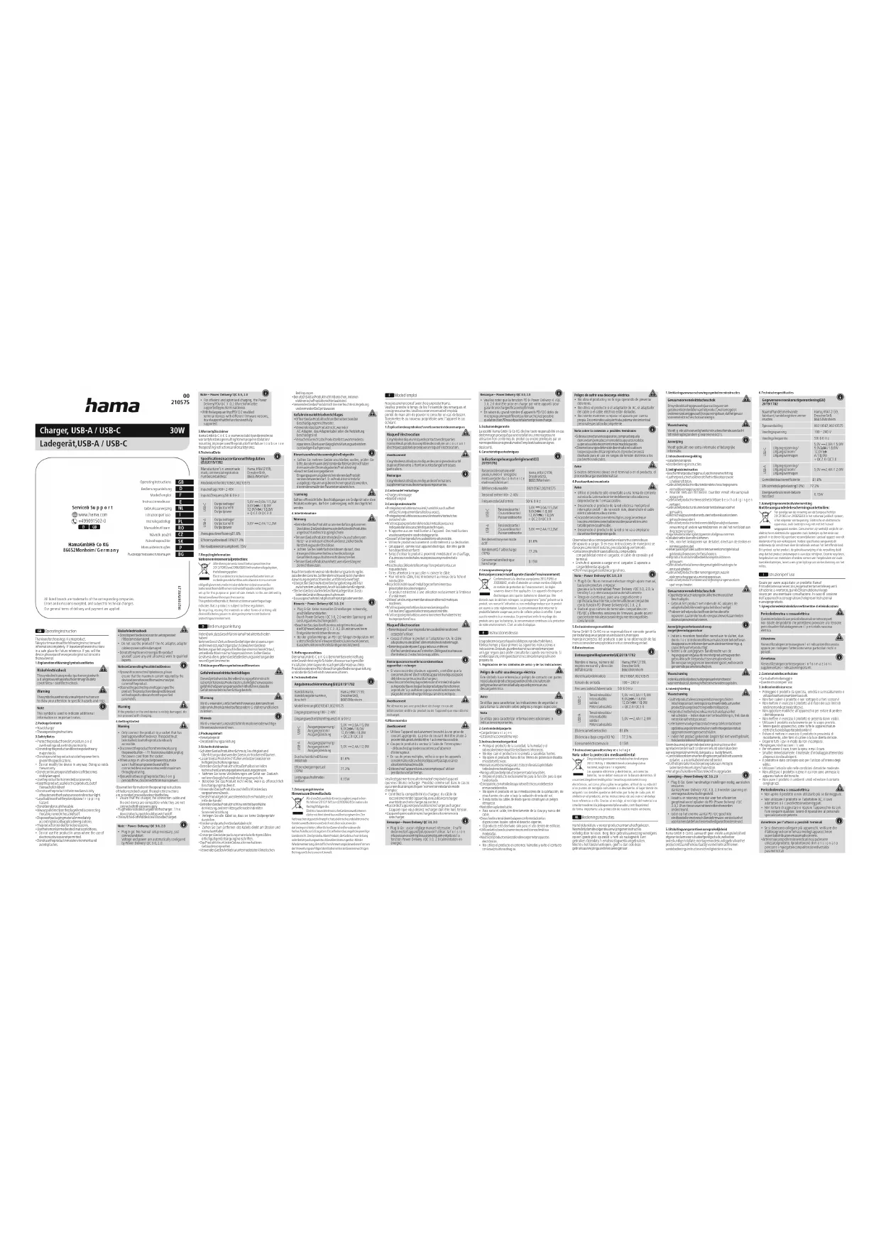 - En raison du grand nombred’appareils PD /QCdotés de microprogrammes différents sur le marché, il est possibleque la fonction PD ne soit pas totalement prise en charge.5. Exclusion de garantie La société Hama GmbH &CoKGdécline toute responsabilité en cas de dommages provoqués par une installation, un montage ou une utilisation non conformes du produit ou encoreprovoqués par un non respect des consignes du mode d‘emploi et/ou des consignesde sécurité.6. Caractéristiques techniquesIndications prévues par le règlement (CE)2019/1782Raison sociale ou marque déposée, numérod’enregistrement au registreducommerceet adresse du fabricantHama, HRA12159,Dresdner Str. 9,86653 MonheimRéférence du modèle 00210567, 00210575Tension d’entrée 100 –240 VFréquence du CA d’entrée 50 /60HzUSB-CTension de sortie/Courant de sortie/Puissance de sortie5,0 V3,0 A/15,0 W9,0 V 2,0 A/18,0 W12,0 V 1,5 A/18,0 W +QC2.0/QC3.0 USB-ATension de sortie/Courant de sortie/Puissance de sortie5,0 V2,4 A/12,0 WRendement moyen en modeactif81.6 %Rendement àfaible charge(10 %)77.3 %Consommation électriquehors charge0.15 W7. Consignes de recyclageRemarques concernant la protection de l’environnement: Conformément àladirectiveeuropéenne 2012/19/EU et 2006/66/CE, et and‘atteindreuncertain nombred‘objectifs en matièredeprotection de l‘environnement, les règles suivantesdoivent êtreappliquées: Les appareils électriques et électroniquesainsique les batteries ne doivent pas êtr e éliminés avec les déchets ménagers. Le pictogramme “picto” présentsur le produit,son manuel d‘utilisationouson emballageindiqueque le produit est soumisàcette réglementation. Le consommateurdoitretournerle produit/la batterie usageraux points de collecte prévus àcet effet.Ilpeut aussi le remettreàun revendeur.Enpermettant ennlerecyclage des produitsainsi que les batteries, le consommateur contribuera àlaprotection de notreenvironnement. C‘est un acte écologique. E Instrucciones de uso Le agradecemos que se haya decidido por un producto de Hama. Tómese tiempo yléase primerolas siguientes instrucciones e indicaciones. Después, guarde estas instrucciones de manejo en un lugar seguroparapoder consultarlas cuando sea necesario. Si vende el aparato, entregue estas instrucciones de manejo al nuevopropietario.