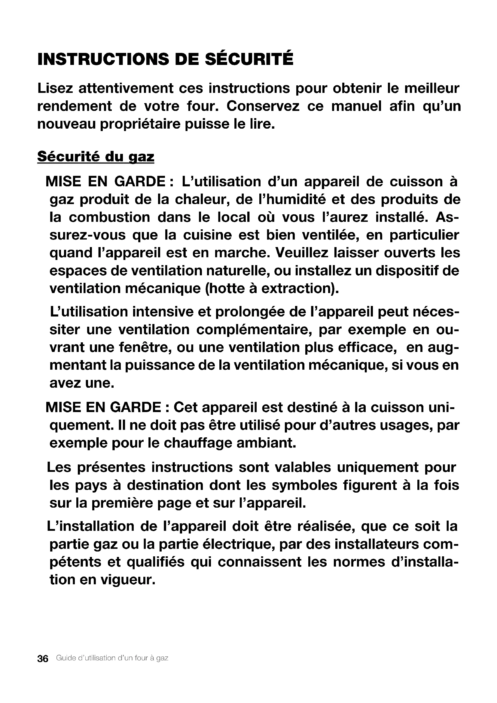 Lisez attentivement ces instructions pour obtenir le meilleur rendement de votre four. Conservez ce manuel afin qu’un nouveau propriétaire puisse le lire. Sécurité du gaz