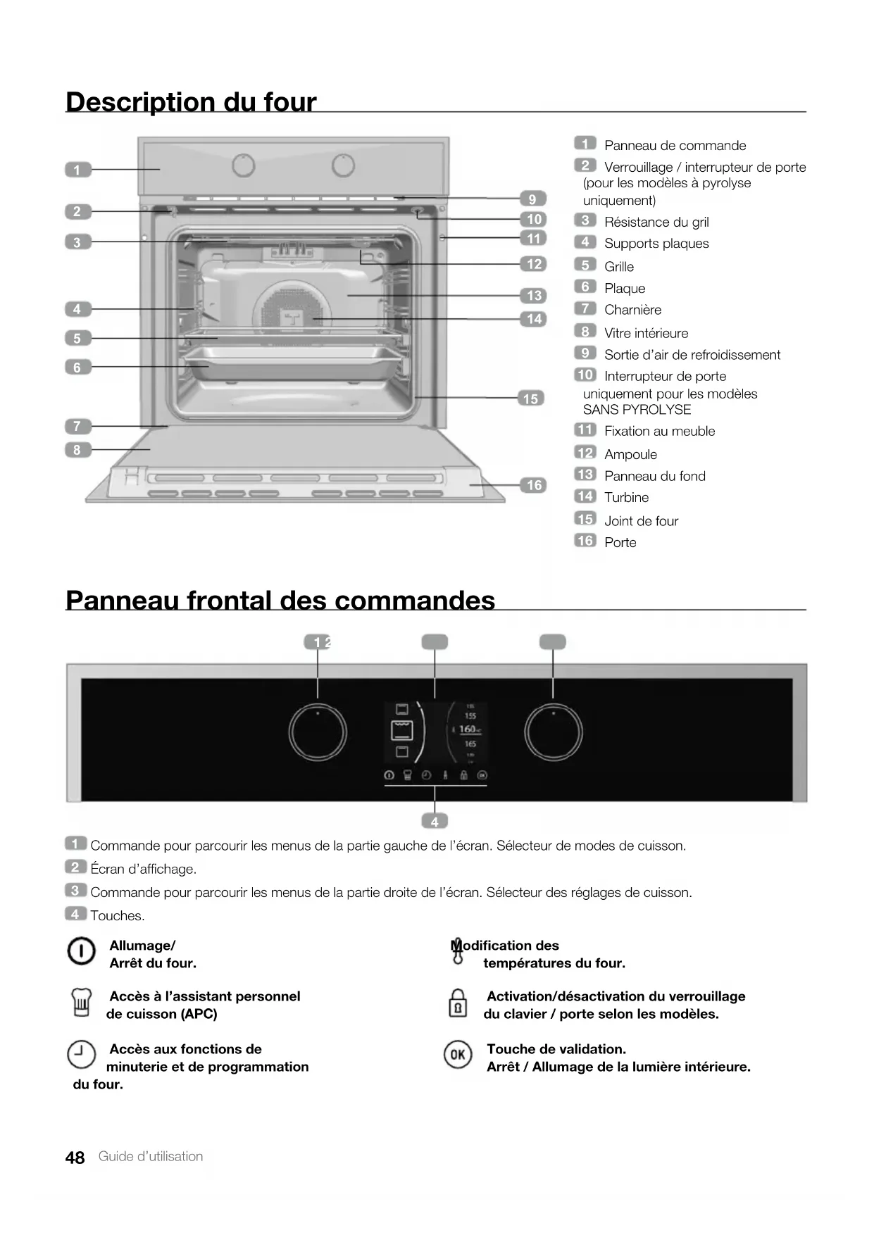 Allumage/ Arrêt du four. Accès à l’assistant personnel de cuisson (APC) Accès aux fonctions de minuterie et de programmation du four. Modification des températures du four. Activation/désactivation du verrouillage du clavier / porte selon les modèles. Touche de validation. Arrêt / Allumage de la lumière intérieure.