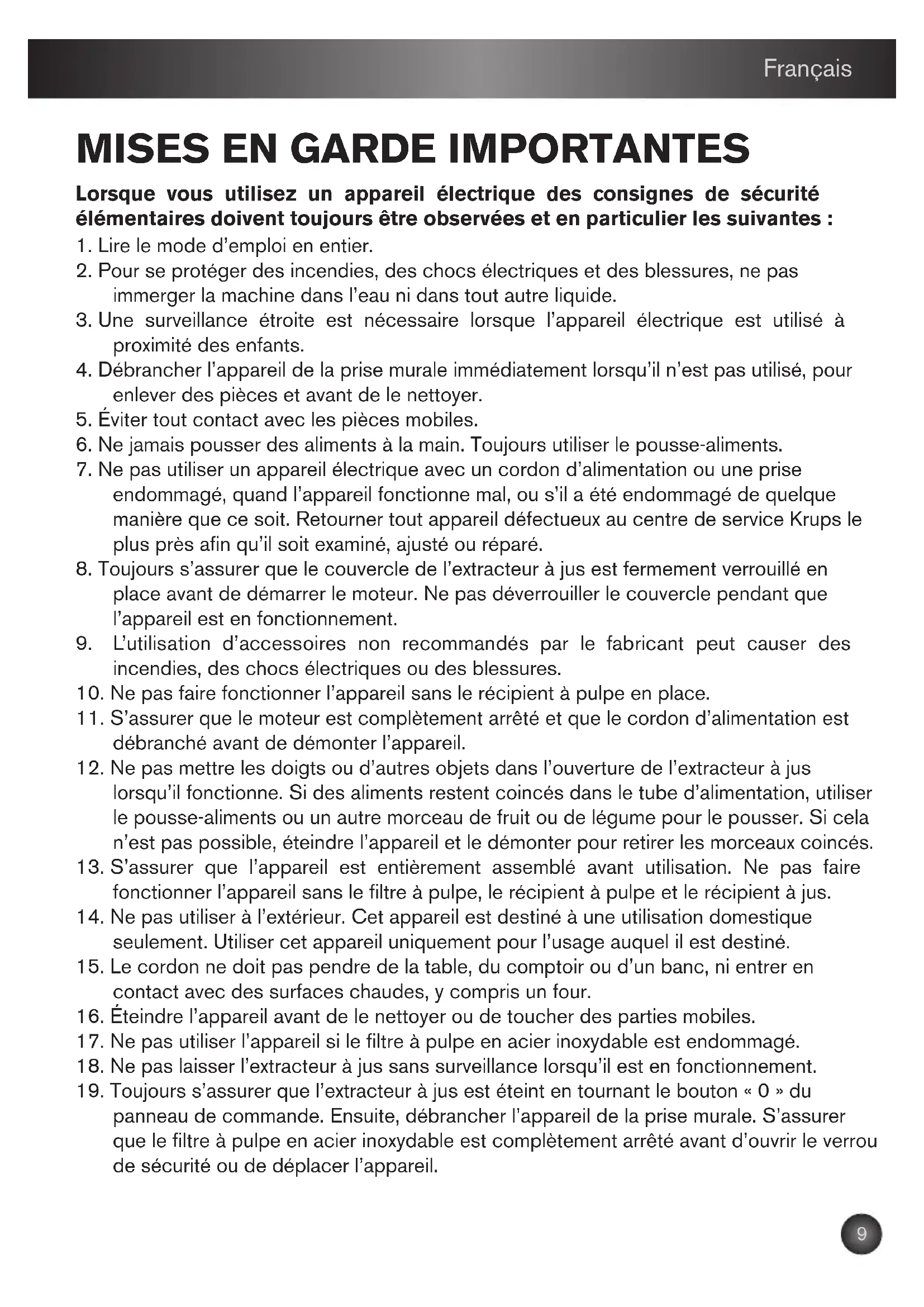 - Ne pas utiliser un apparéil électrique avec un cordon d'alimentation ou une prise endommagé, quand l' apparéil fonctionne mal, ou s'il a été endommagé de quelque manière que ce soit. Retourner tout apparéil défectueux au centre de service Krups le plus pres afin qu'il soit examé, ajusté ou réparé.
