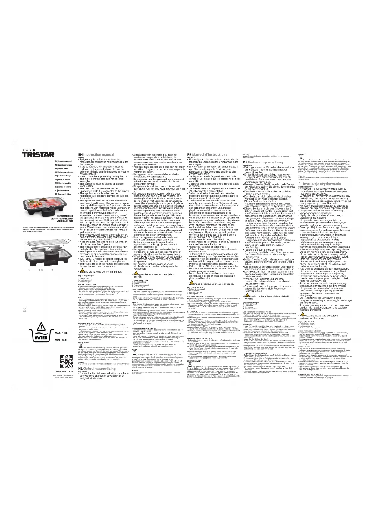 - La surface peut devenir chaude à l'usage. PARTS DESCRIPTION1. Molette de thermostat2. Bac à graisse3. Élément chauffant4. Grill réglableAVANT LA PREMIÈRE UTILISATION• Retirer l’appareil et les accessoires du carton. Retirer les autocollants, lefilm ou le plastique protecteur de l’appareil.• Avant l’utilisation, nettoyez l’appareil avec un chiffon humide.• Lors de la première utilisation de l’appareil, l’appareil peut dégager unelégère odeur et de la fumée. Ceci est normal, il se peut qu’un enduitgraisseux se soit collé à la résistance lors de la fabrication et qu’il seconsume.UTILISATION• Assurez-vous de placer un revêtement thermorésistant sous l'appareilpour éviter les traces dues à la chaleur et les taches de graisse sur votretable.• Remplissez d'eau le bac à graisse en vous assurant que le niveau d'eaureste sous l'élément.• Glissez l'élément chauffant sur sa position. Note : l'élément chauffantcomporte un interrupteur de sécurité. Si l'élément chauffant n'est pascorrectement positionné, il ne fonctionne pas.• Placez la grille sur l'appareil.• Durant l'usage, l'eau s'évapore et doit être réapprovisionnée. Note :assurez-vous de ne pas laisser tomber de gouttes d'eau sur l'élément.• Couvrir le barbecue d’aluminium ou d’un autre matériau est dangereux !La chaleur ne peut pas être dégagée, ce qui peut faire fondre lebarbecue ou entraîner des défaillances.CLEANING AND MAINTENANCE• Débranchez toujours l’appareil et laissez-le refroidir complètement avantde le nettoyer.• Retirez et videz le bac de récupération de graisse après chaque usageet lavez-le à l'eau savonneuse chaude.• Essuyez l'extérieur uniquement avec un chiffon légèrement humide, enveillant à ce qu'aucune humidité, huile ou graisse ne pénètre dans lesorifices de refroidissement.• N'utilisez jamais de détergents abrasifs, de brosses en métal ou dediluant pour peinture afin de nettoyer la base. Le barbecue seraitendommagé.• N’immergez jamais l’appareil sous l’eau. L’appareil et les différentsaccessoires ne sont pas prévus pour le lave-vaisselle.ENVIRONNEMENTCet appareil ne doit pas être jeté avec les déchets ménagers à lafin de sa durée de vie, il doit être remis à un centre de recyclage pour lesappareils électriques et électroniques. Ce symbole sur l'appareil, lemanuel d'utilisation et l'emballage attire votre attention sur un pointimportant. Les matériaux utilisés dans cet appareil sont recyclables. Enrecyclant vos appareils, vous contribuez de manière significative à laprotection de notre environnement. Renseignez-vous auprès des autoritéslocales pour connaître les centres de collecte des déchets.SupportVous retrouvez toutes les informations et pièces de rechange surwww.tristar.eu! DEBedienungsanleitung SICHERHEIT